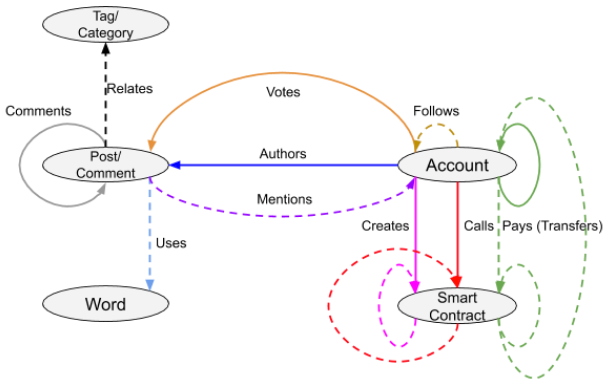 The overall scope of entities and relationships in the ontology is presented in the above picture and can be handled by two independent “reference implementations” of the WLR algorithm. The first one is “research” version of SingularityNET Reputation System in Python. The second “production” one is written in Java and built into Aigents Social Computing Platform.