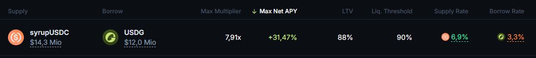 ## Jupiter Lend Proprio la piattaforma disponibile su Solana di cui vi avevo parlato qualche giorno fa: - [[ENG/ITA] Jupiter Lend: Deposit, Borrow, Multiply](https://peakd.com/hive-146620/@arc7icwolf/engita-jupiter-lend-deposit-borrow-multiply-afk) Nella sezione "multiply" c'è infatti attualmente la possibilità di ottenere un APR davvero elevato attraverso la coppia syrupUSDC-USDG.  **syrupUSDC** è uno yeald bearing token basato sulla stablecoin USDC, mentre USDG è una stablecoin creata da Paxos Digital Singapore il cui valore è ancora al dollaro americano. I due token hanno perciò valori stabili, con il primo che aumenta leggermente nel tempo rispetto al secondo. Sfruttando la leva offerta dal servizio "multiply", senza portarla al massimo per non esagerare, posso così ottenere un APR che, nel momento in cui scrivo, si attesta intorno al 26%. Nel tempo potrebbe cambiare - temo in peggio, difficilmente in meglio - ma per ora è una fantastica alternativa a quello che stavo ottenendo sull'altra piattaforma centralizzata. Non che su Jupiter Lend non ci siano rischi, ma onestamente mi sento molto più tranquillo così e credo che questa scelta sia coerente con quelle che sono le mie scelte e strategie nel mondo crypto. Avere i miei risparmi crypto on chain mi dà molta più flessibilità e mi permette di avere sempre il controllo del mio investimento.