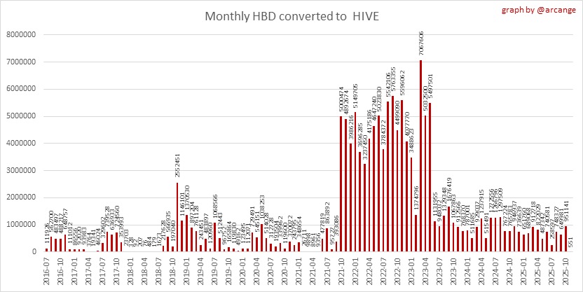 These graphs show the number of HIVE effectively used by the conversion process (HIVE converted and 5% HIVE fee which is burned) each day and month when requests to convert HIVE to HBD have been finalized.