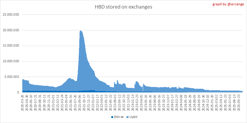 These graphs show the daily evolution of HIVE and HBD stored on the exchanges where they are listed.