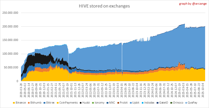 These graphs show the amount and distribution of HIVE and HBD stored on the exchanges where they are listed.