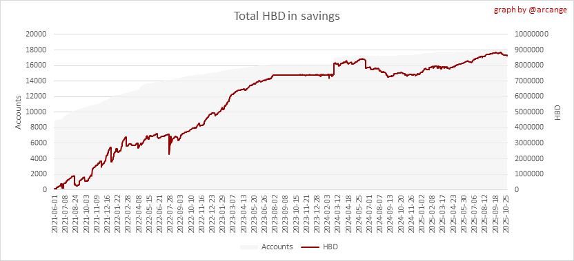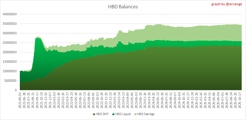 This graph shows the number of HBD, both liquid and in savings, held by all accounts. It also displays the amount of HBD stored in the Decentralized Hive Fund (DHF).