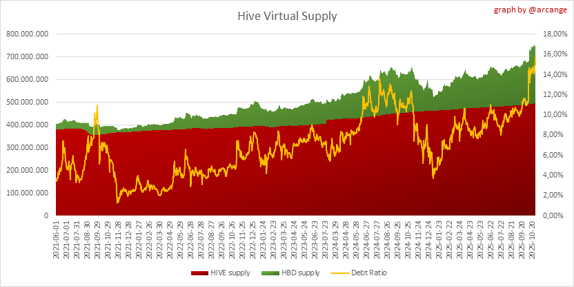 This graph shows the evolution of HIVE virtual Supply. The virtual supply is the sum of HIVE supply (liquid and staked HIVE) and HBD supply (converted into HIVE). The graph also displays the debt ratio (HBD supply / HIVE virtual supply). Keep in mind that since hardfork 24 funds in the treasury (@hive.fund HBD balance) don't count towards the HBD debt ratio.