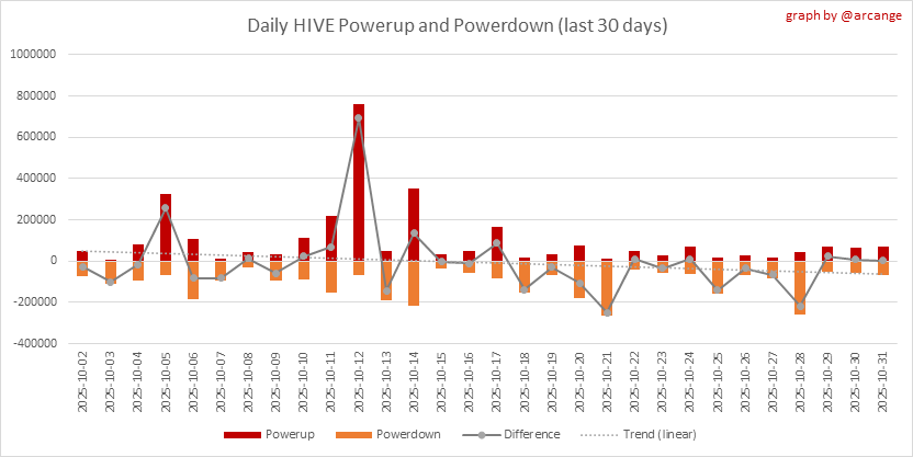 This graph shows the daily HIVE power-up, power-down, and the resulting variation over the last 30 days. The table shows the topmost power-ups and power-downs of the day.
