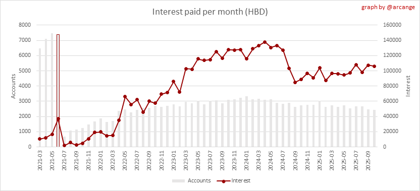 This chart shows the amount of interest paid each month for holding HBD and how many accounts received such interest.