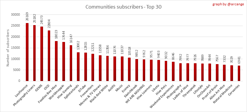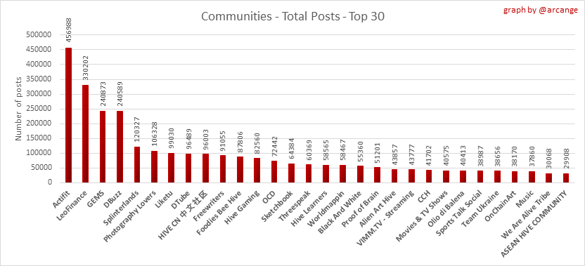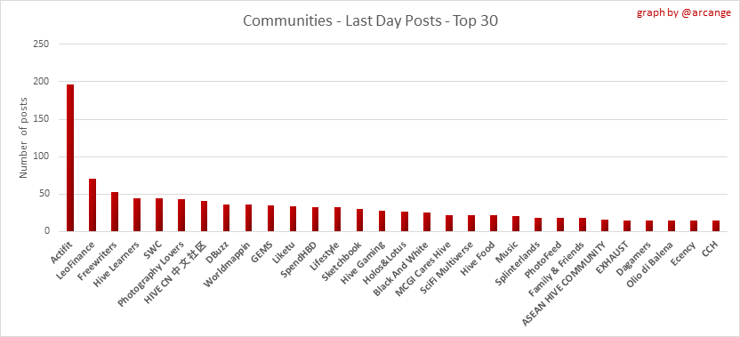 These graphs show the most active communities by number of posts (blockchain lifetime and last day).