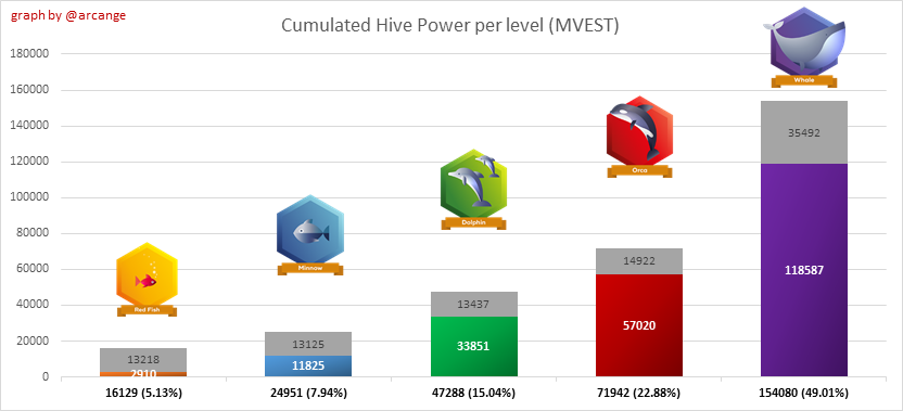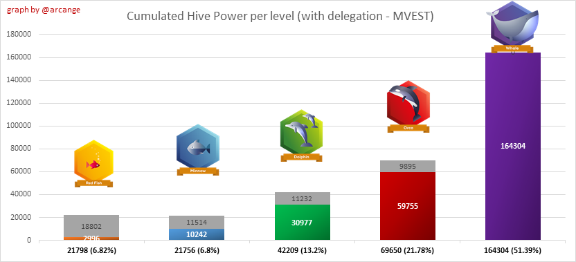 This graph shows the distribution of Hive Power cumulated per account level. The left graph shows the distribution without taking into account any delegation made or received by the accounts. The right graphs take into account delegation, adds received HP delegation and subtracts given HP delegation.