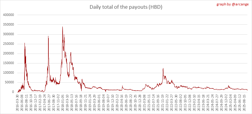 These graphs show the total of the distributed payout (posts and comments) for each day.