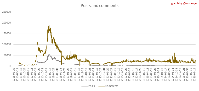 These graphs show the evolution of posts and comments for the whole blockchain lifetime and the last 30 days.
