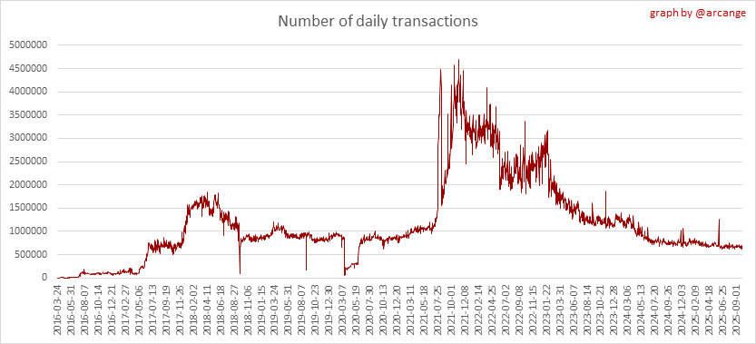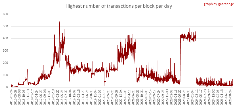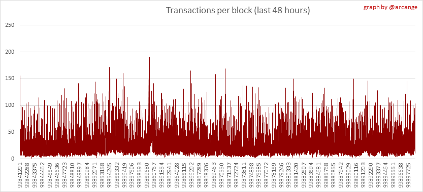 These graphs show the number of transactions per day, and the highest number of transactions per block, the average number of transactions per block, and the number of transactions per block for the last 48 hours. This gives you an idea of the whole activity on the blockchain.