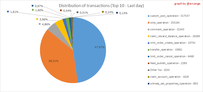 This graph shows the distribution of the top 10 types of transactions by number of operations performed on the blockchain.