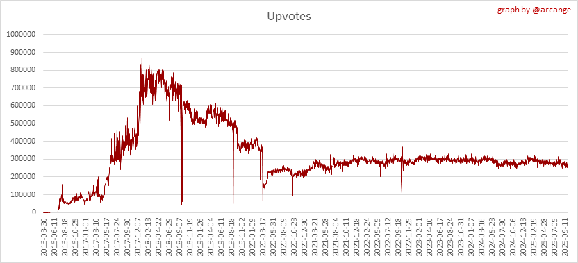 These graphs show the evolution of curation (upvotes) for the whole blockchain lifetime and the last 30 days.