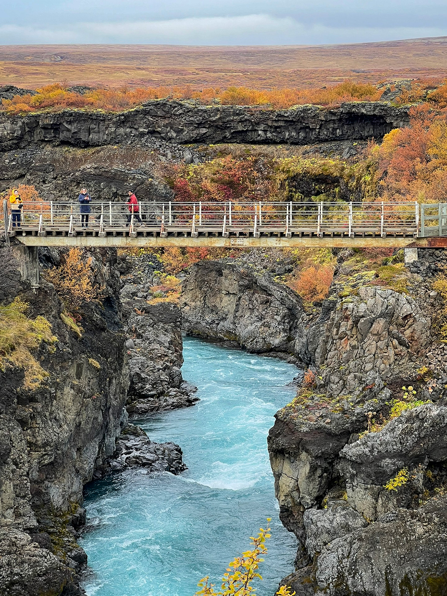 Hraunfossar isn’t one drop but hundreds of thin streams seeping from under a lava field and flowing into the Hvítá River - in a way the “waterfall” is a long stretch of riverbank. The water is milky blue - fed by the Langjökull glacier - making an otherworldly contrast with the gold-red of autumn and the black rock.