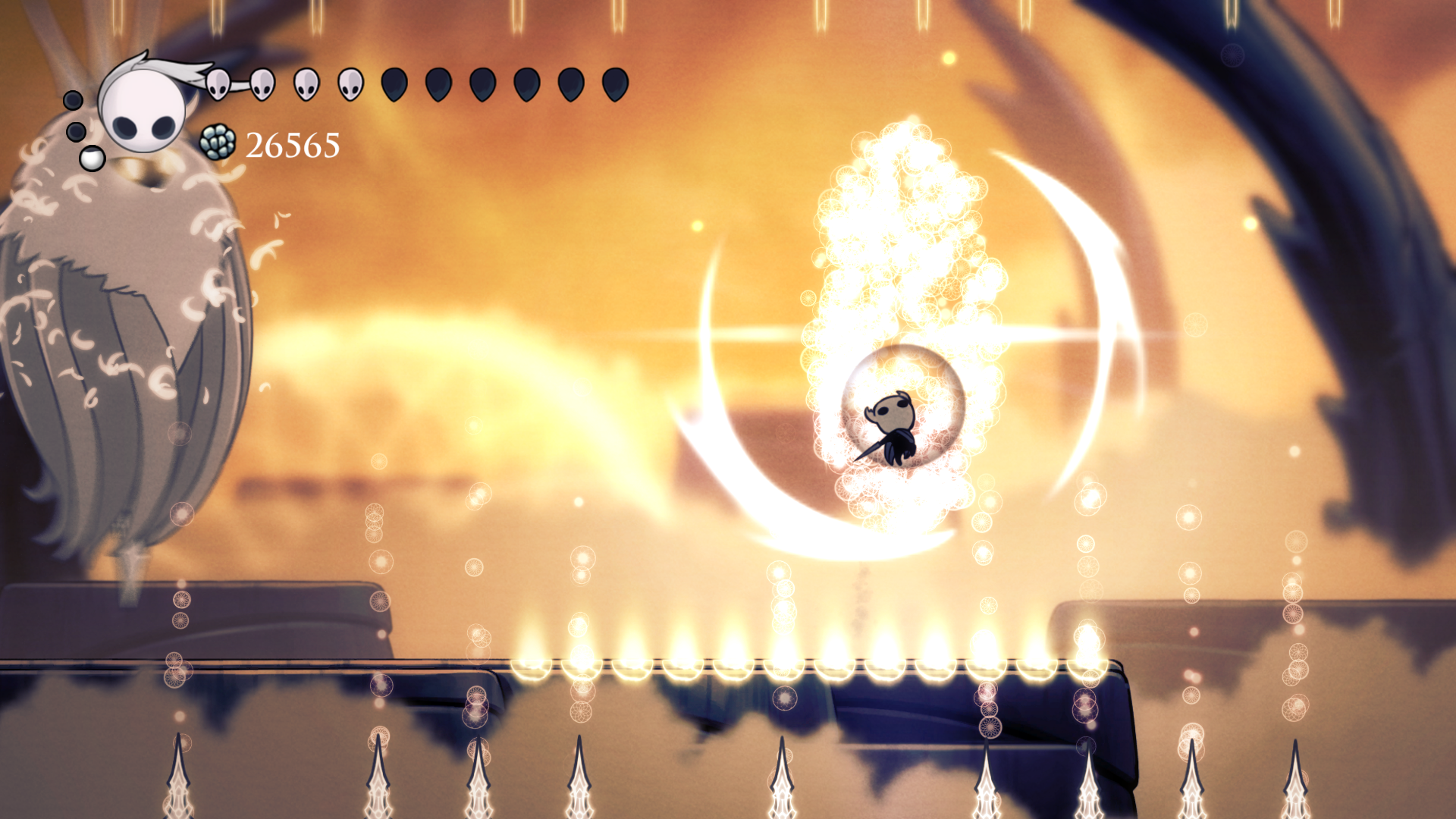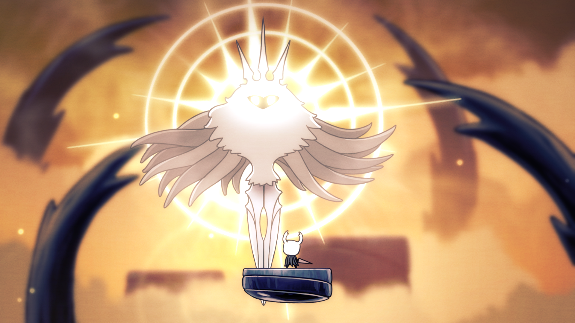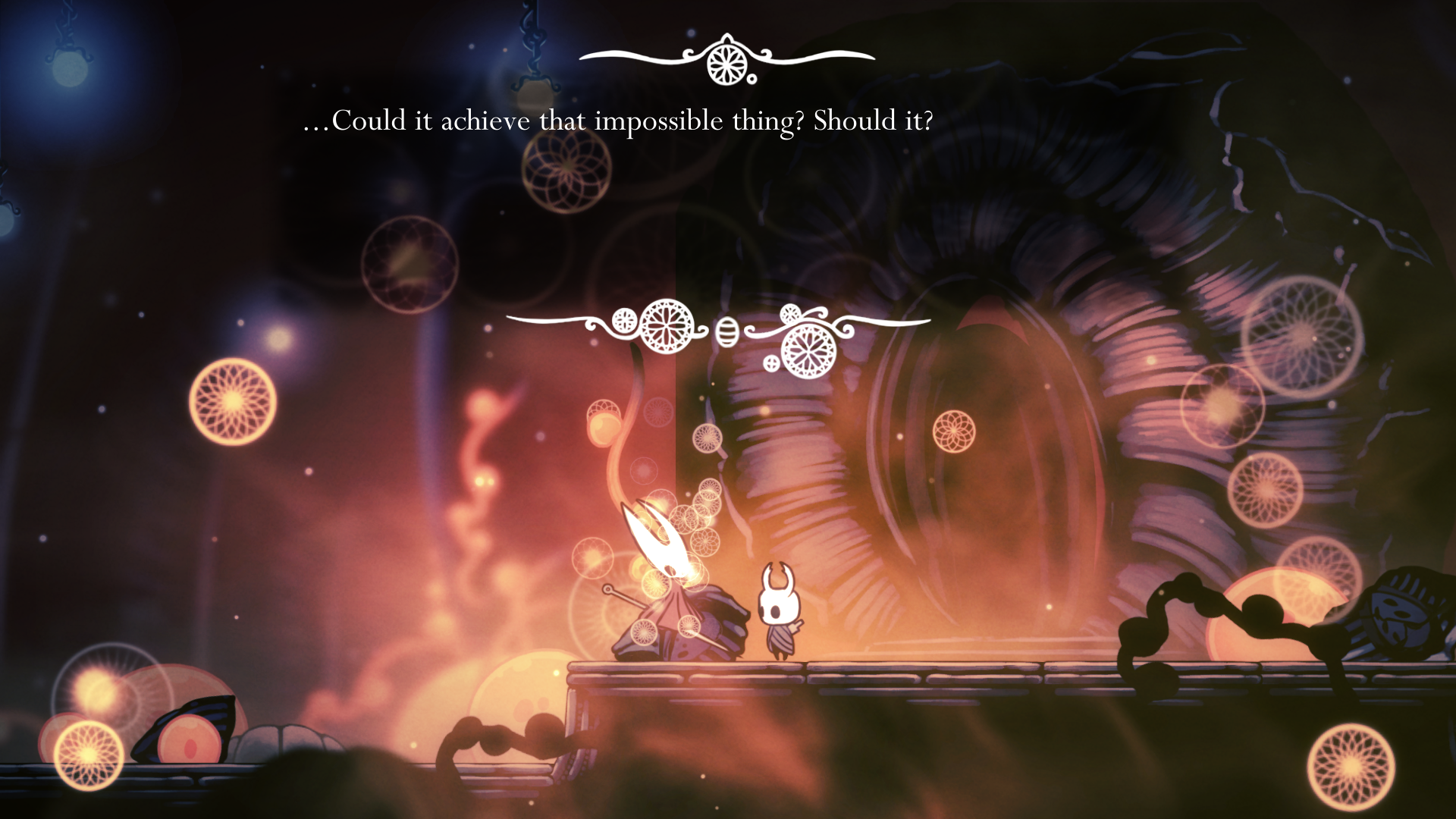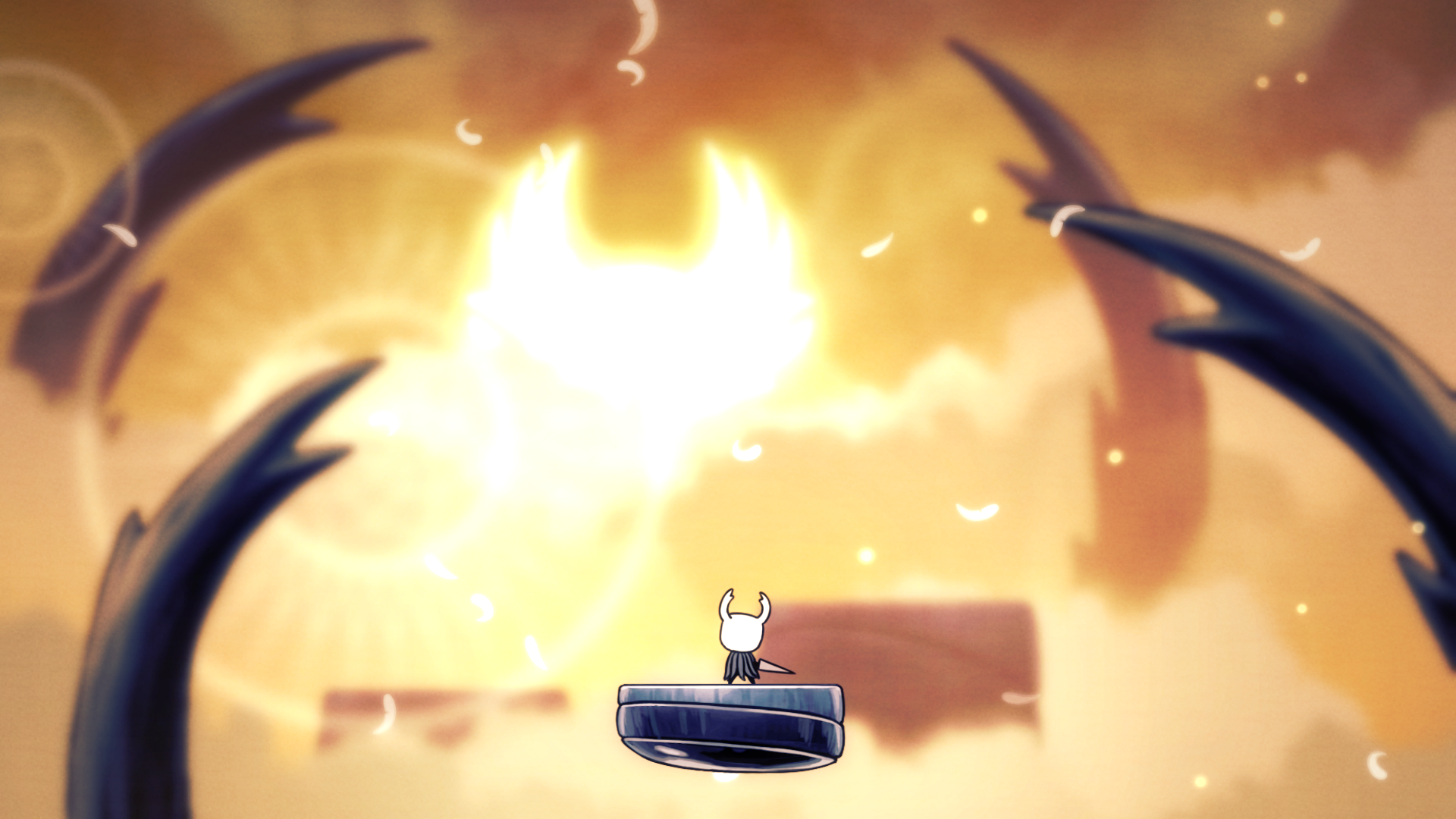 Hitting Hollow Knight with my Dream Nail and challenging The Radiance. I shared a photo of this with you above. It challenges the Sun with that tiny needle. This scene always makes me sad for some reason. I don't put myself in its place, but it always makes me think of those who have to deal with difficulties greater than themselves.