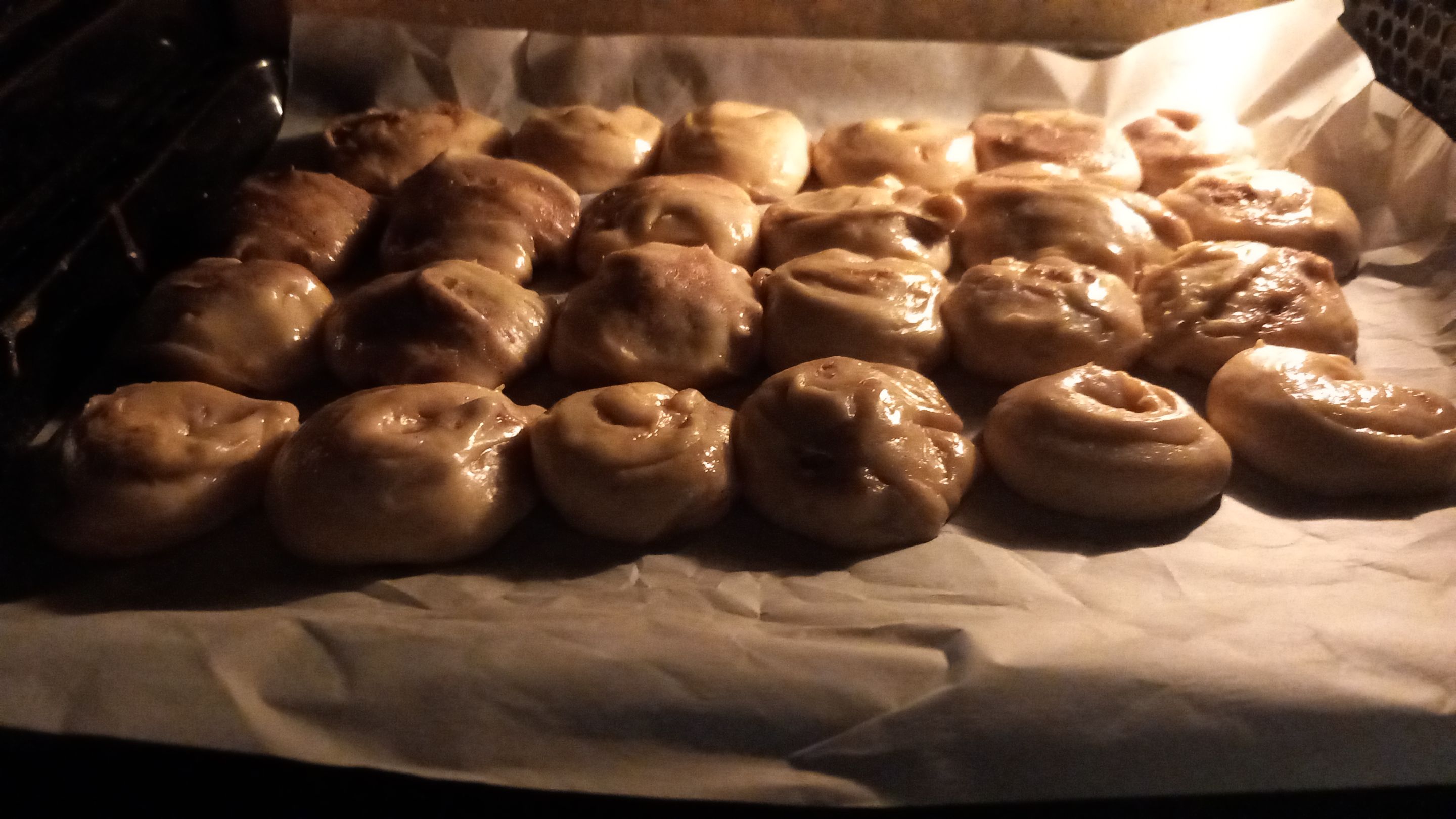 Once again, I couldn’t take many photos because my hands were covered in dough — but honestly, this was worse than the poppy seed rolls! The dough was softer, and even though I oiled the surface to stop it from sticking, everything became greasy — including me. Eventually, I got so tired that I just cut it up without worrying about how it looked and placed the rolls onto the tray.