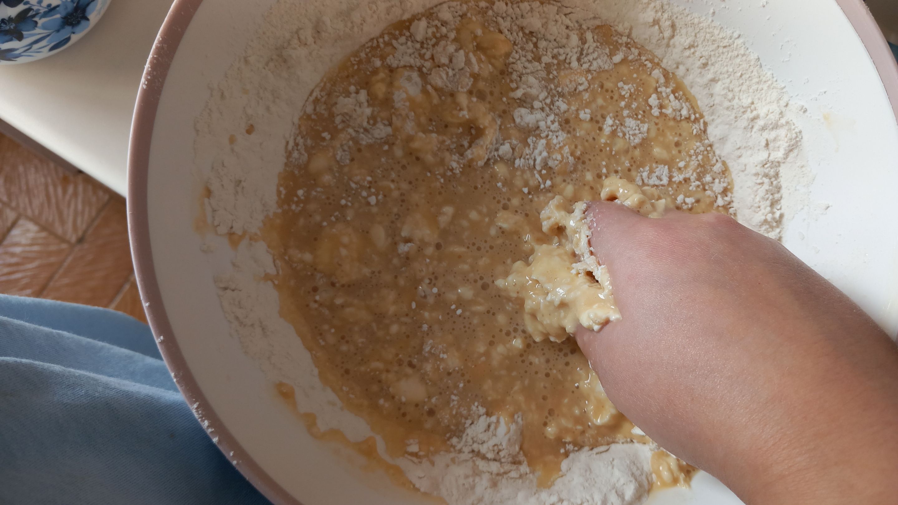 Next, I crumbled the butter into the yeasted mixture by hand and sifted in the flour. If you’re working on pastries or rolls, I highly recommend sifting your flour — it really helps them rise better. Especially with biscuits, it makes a noticeable difference.