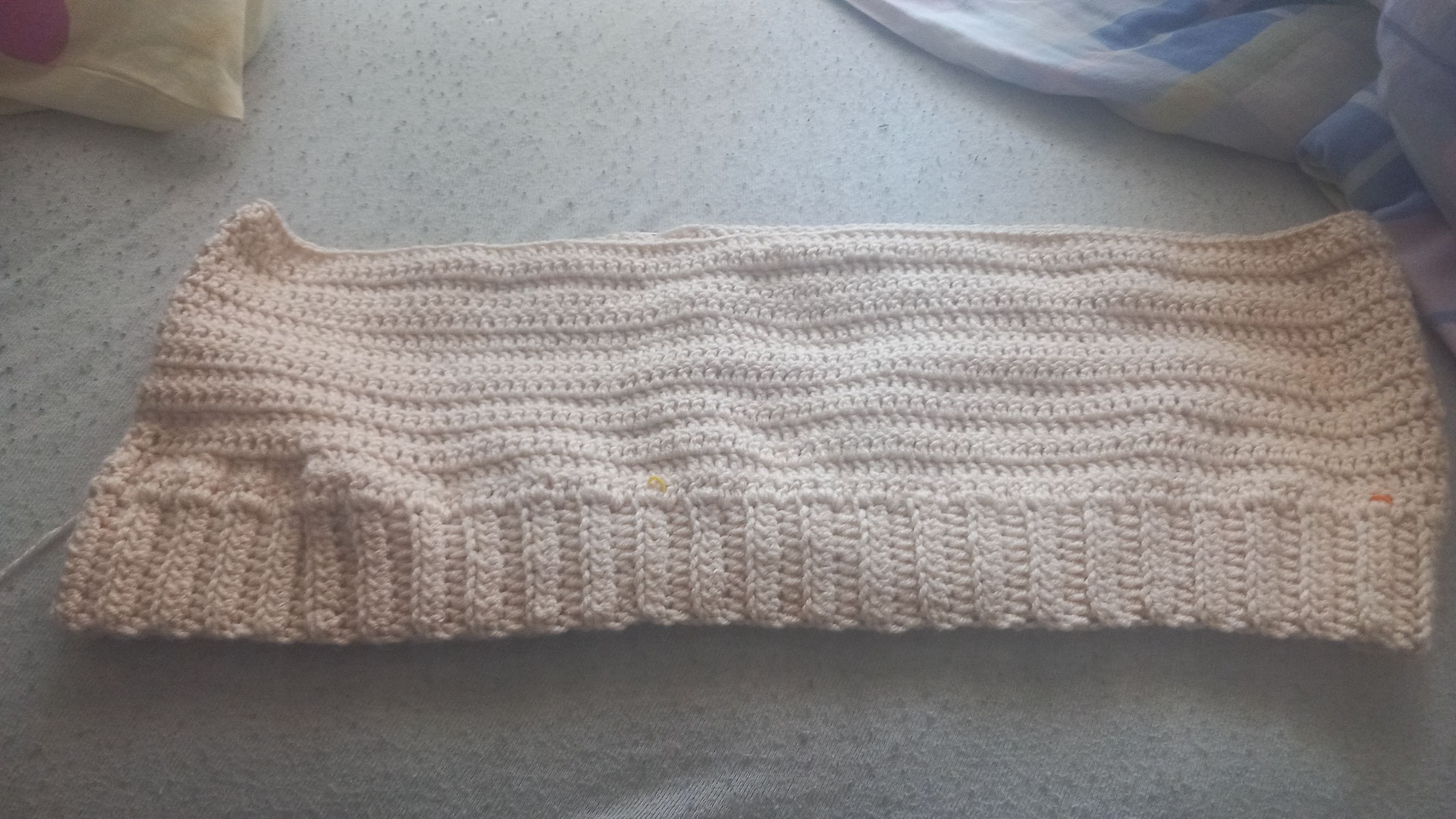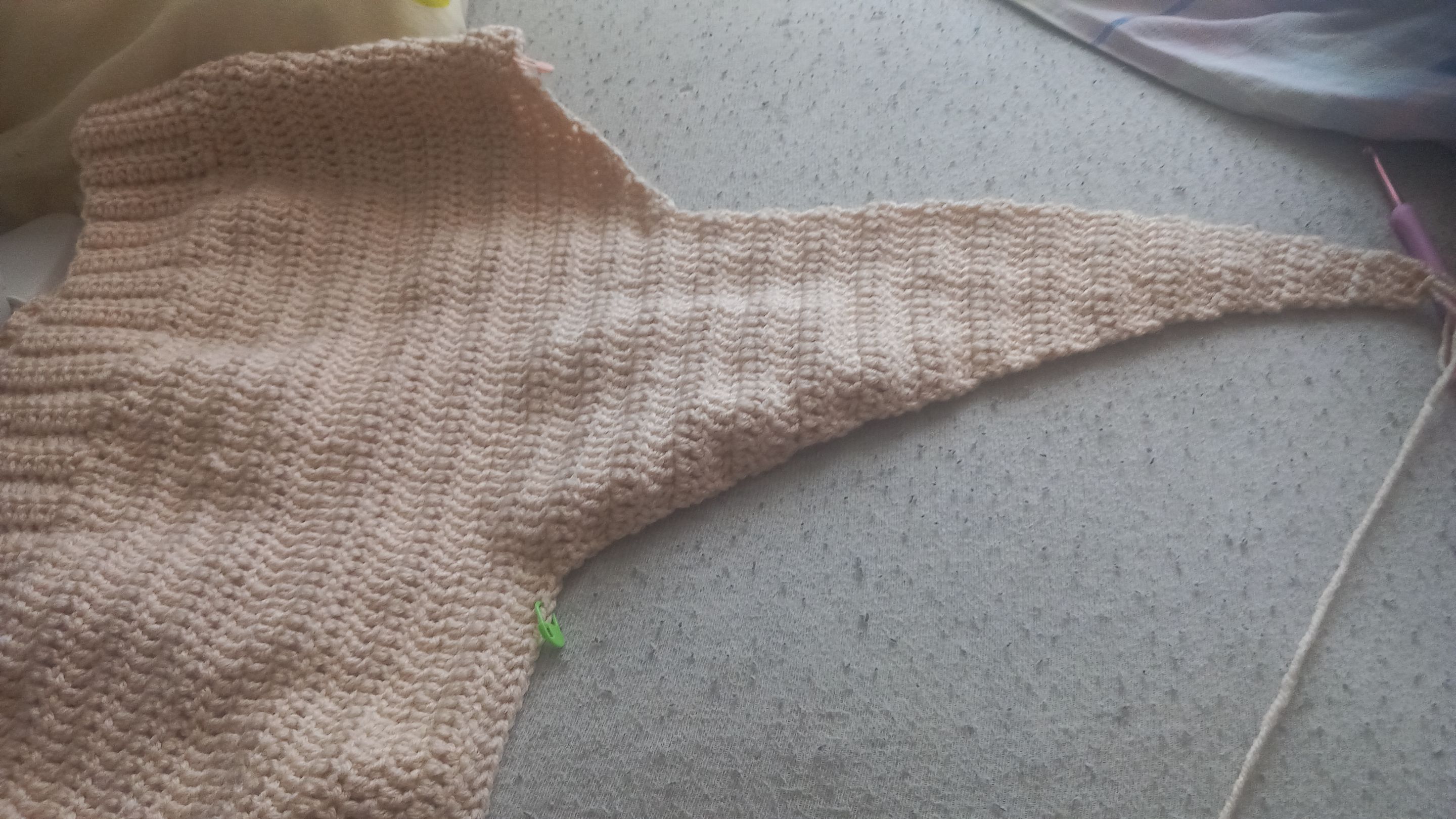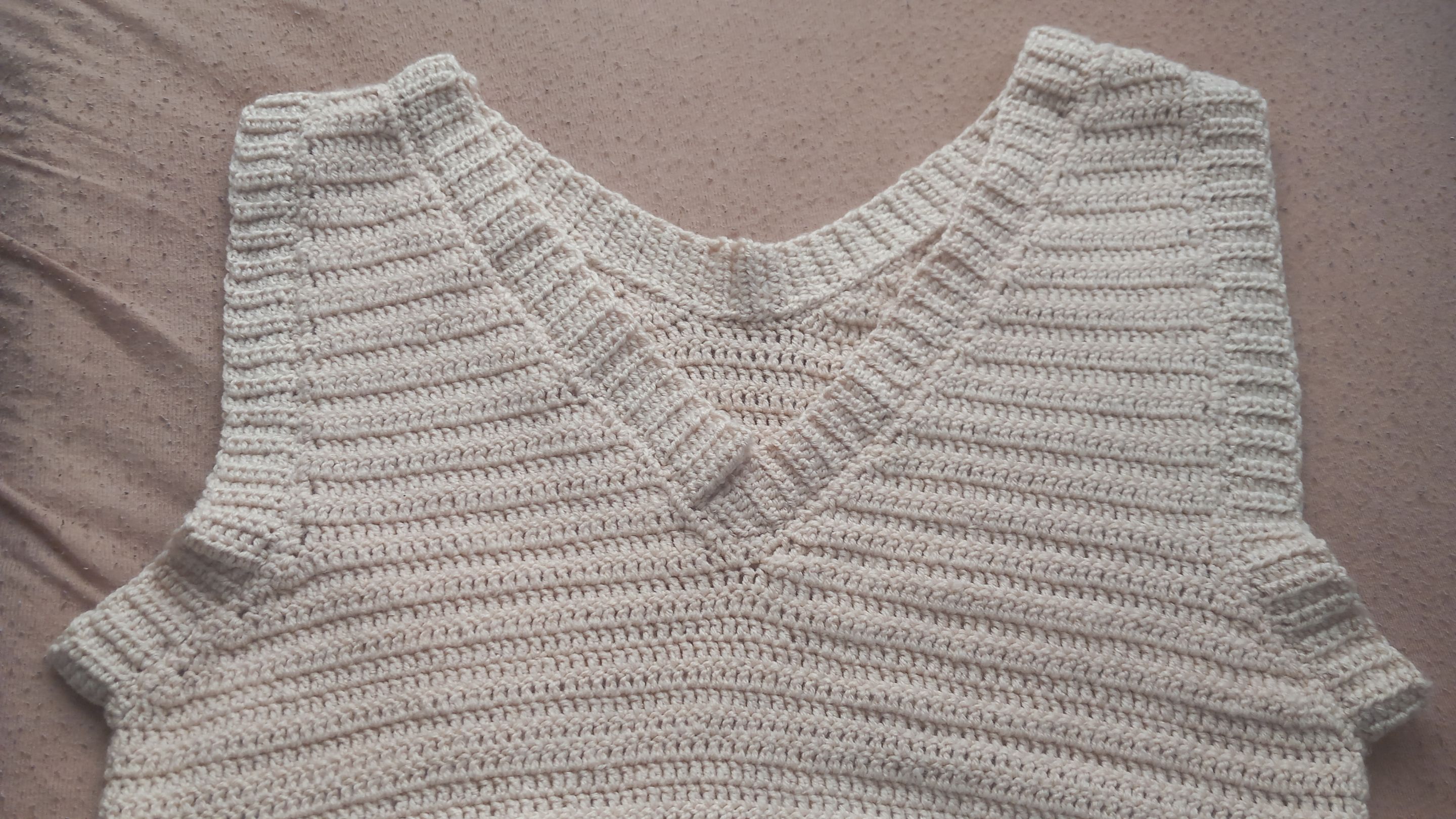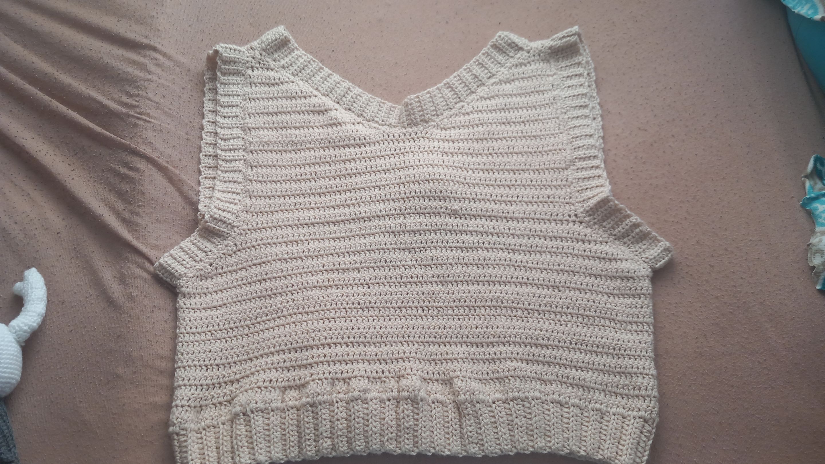 It was more mentally challenging than physically, but they say you can't blame the first attempts. After finishing the body part, I continued by leaving space for the armhole and neckline, gradually decreasing the size to be able to move up towards the shoulder. By this point, I was honestly tired of watching the video.