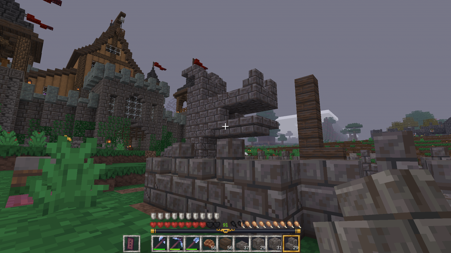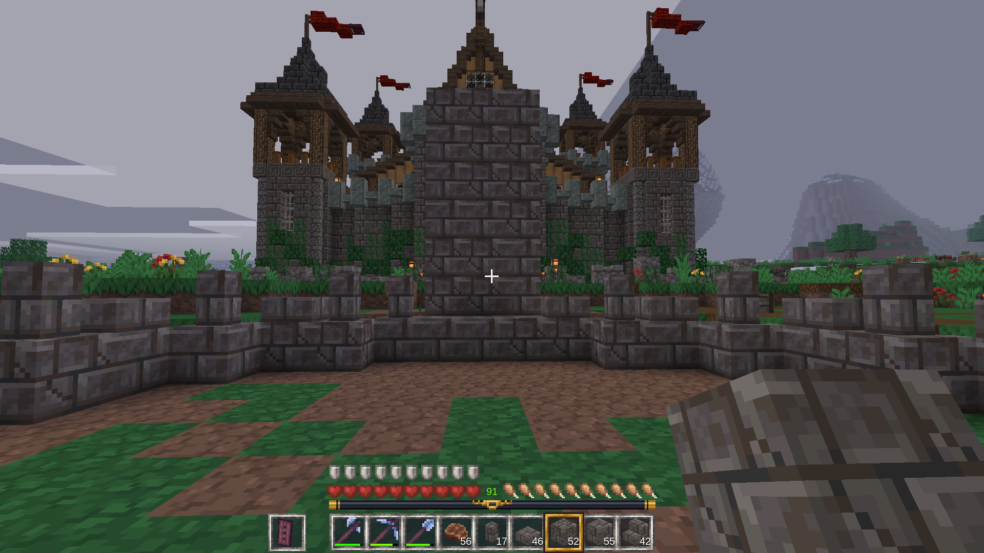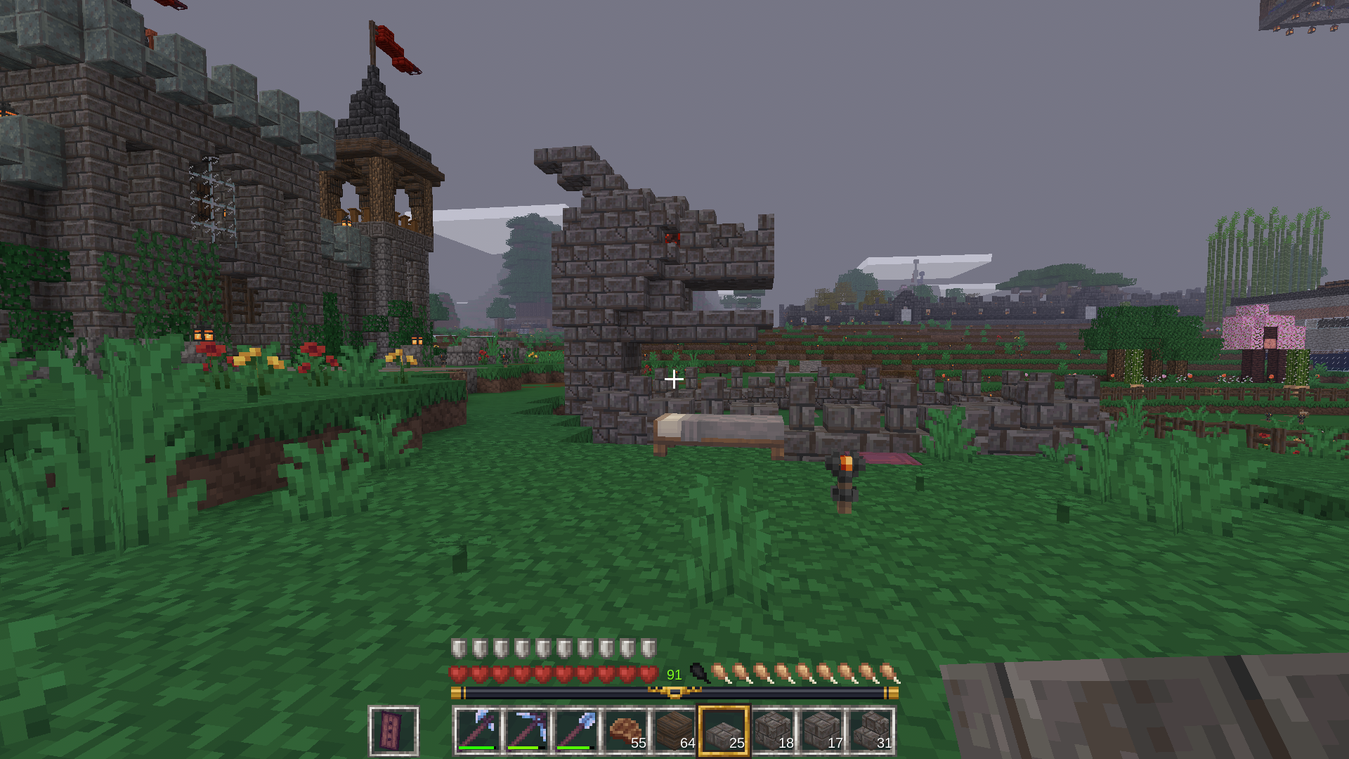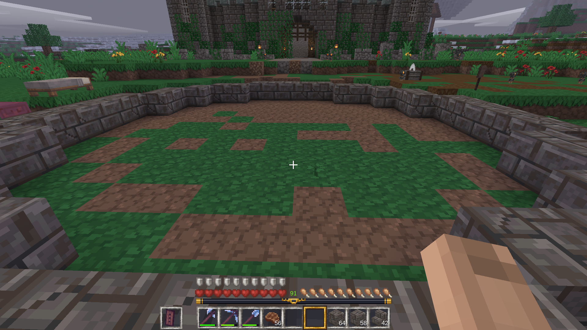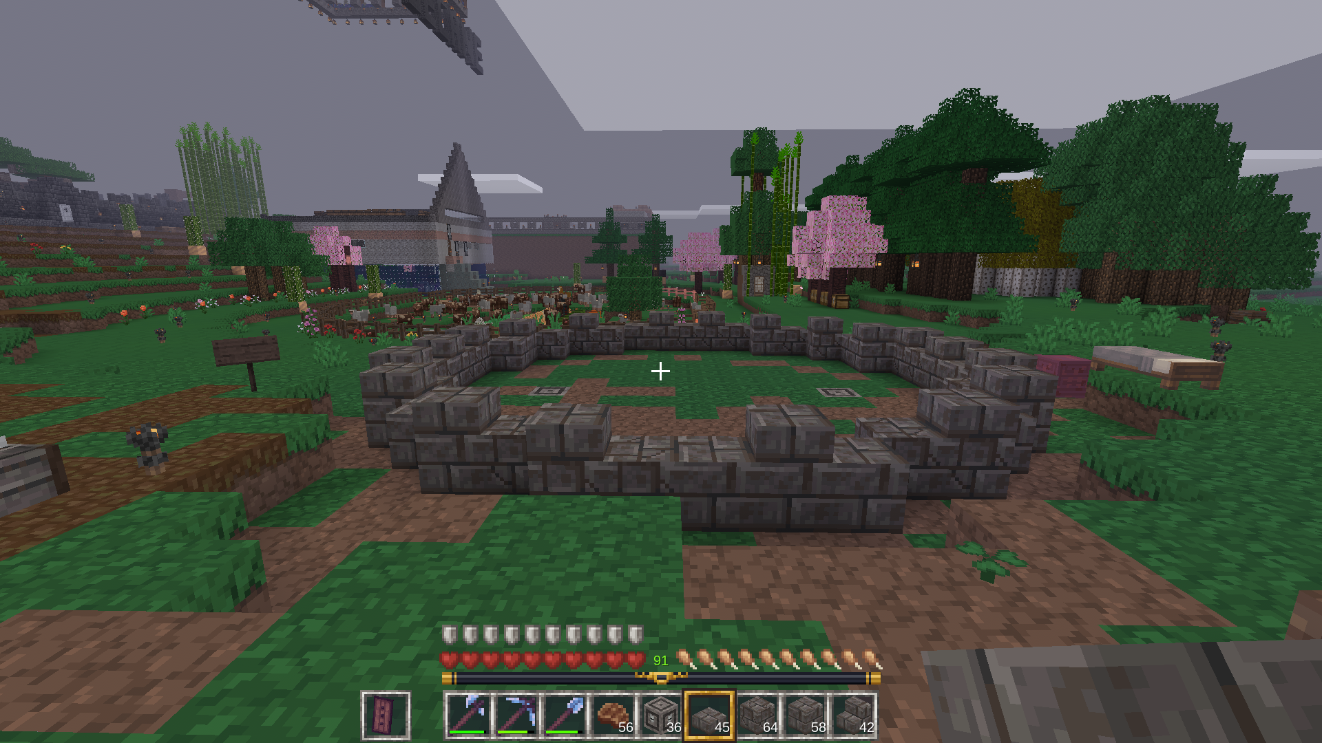 After completing the surroundings of the fountain, I used stone brick slabs and walls for a bit of texture. Of course, to add some variety, I also used the cracked versions of all the stones. I think the cracked versions look better than the normal ones. I just wish the mossy cracked ones looked a little better – something wonderful could have come out of that.