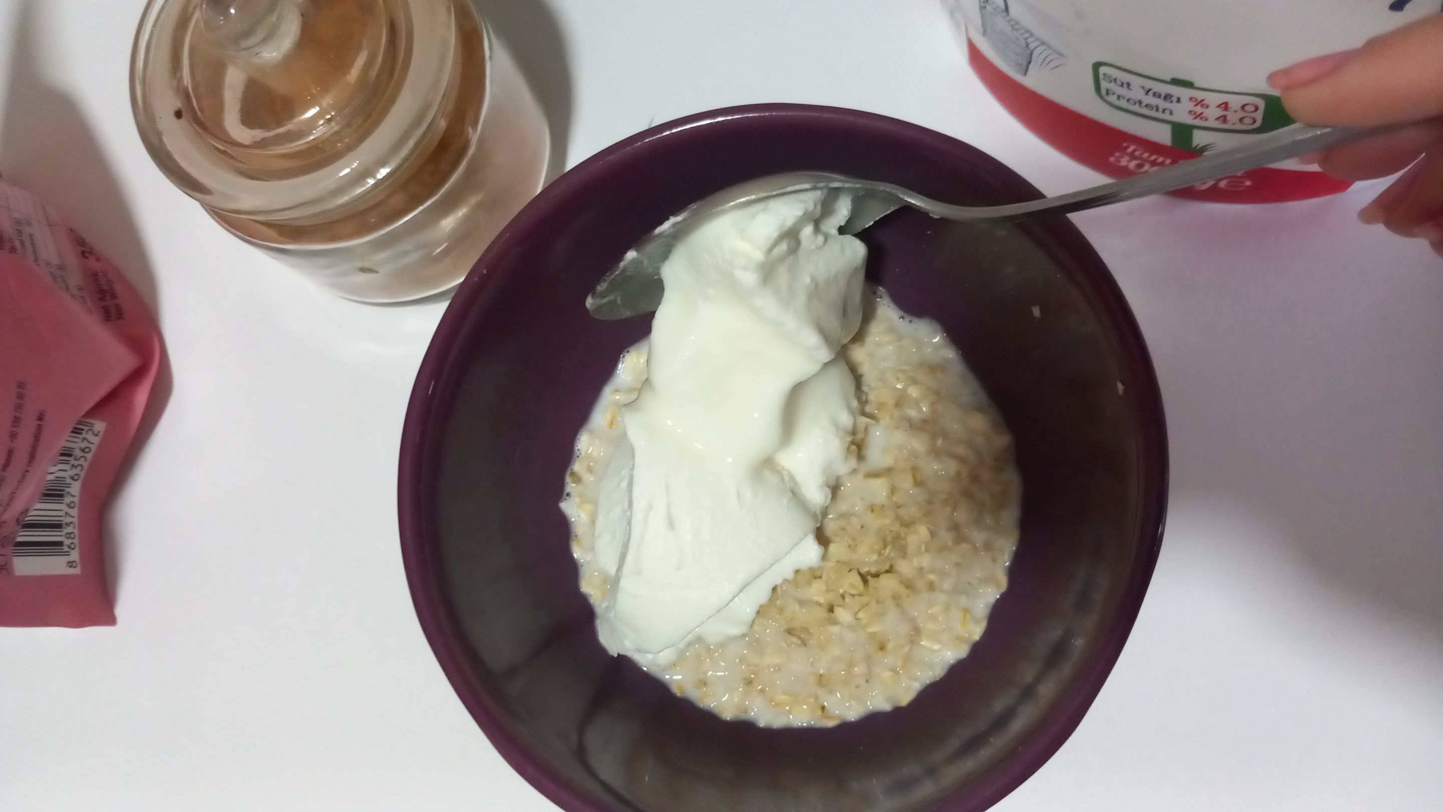 Ardından ise içerisinde 2 yemek kaşığı kadar yoğurt ekledim. Bu noktada isterseniz siz bir muz ya da rendelenmiş bir elma ekleyebilirsiniz. İkisi de o anda olmadığı için ben yoğurt ekledim. Ayrıca bence yoğurt harika bir şekilde tadını hafifletiyor kasenin. Çok boğucu olmaktan kurtarıyor. Tabii bir de eğer çok ısıttıysanız yulafınızı biraz da olsa soğutuyor. Mükemmel bir şey yoğurt.