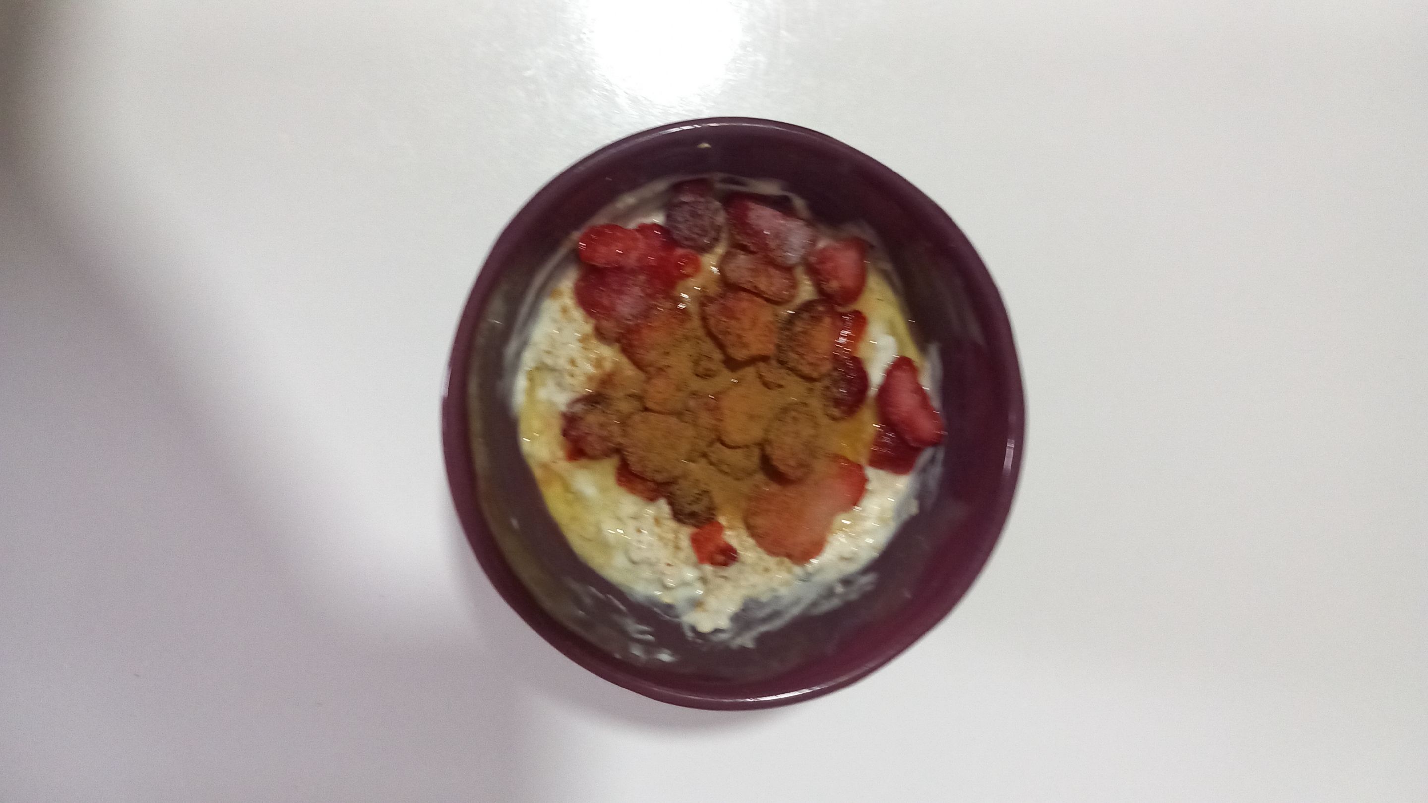 Finally, I topped it with strawberries and cinnamon — my favourite flavour pairing. You can mix them in if you like, but I prefer when each spoonful is filled with strawberries.