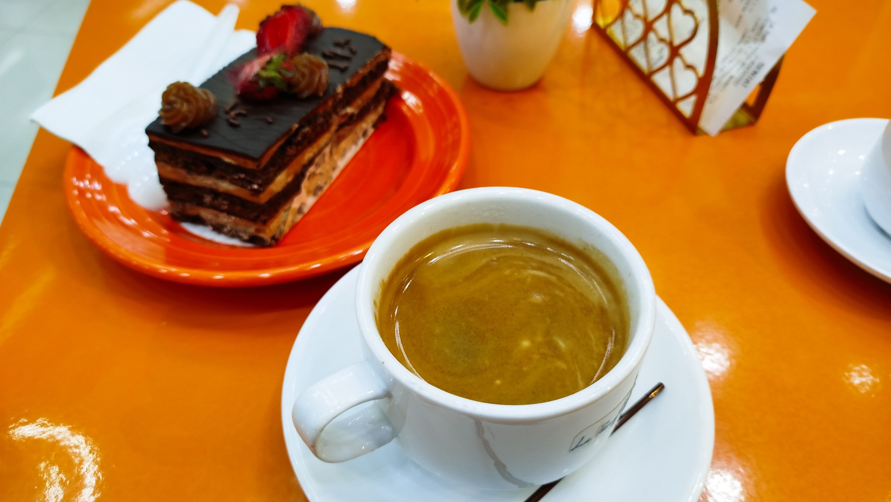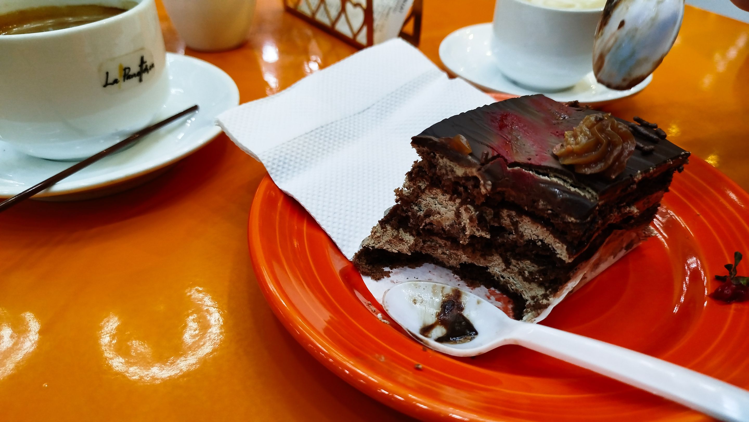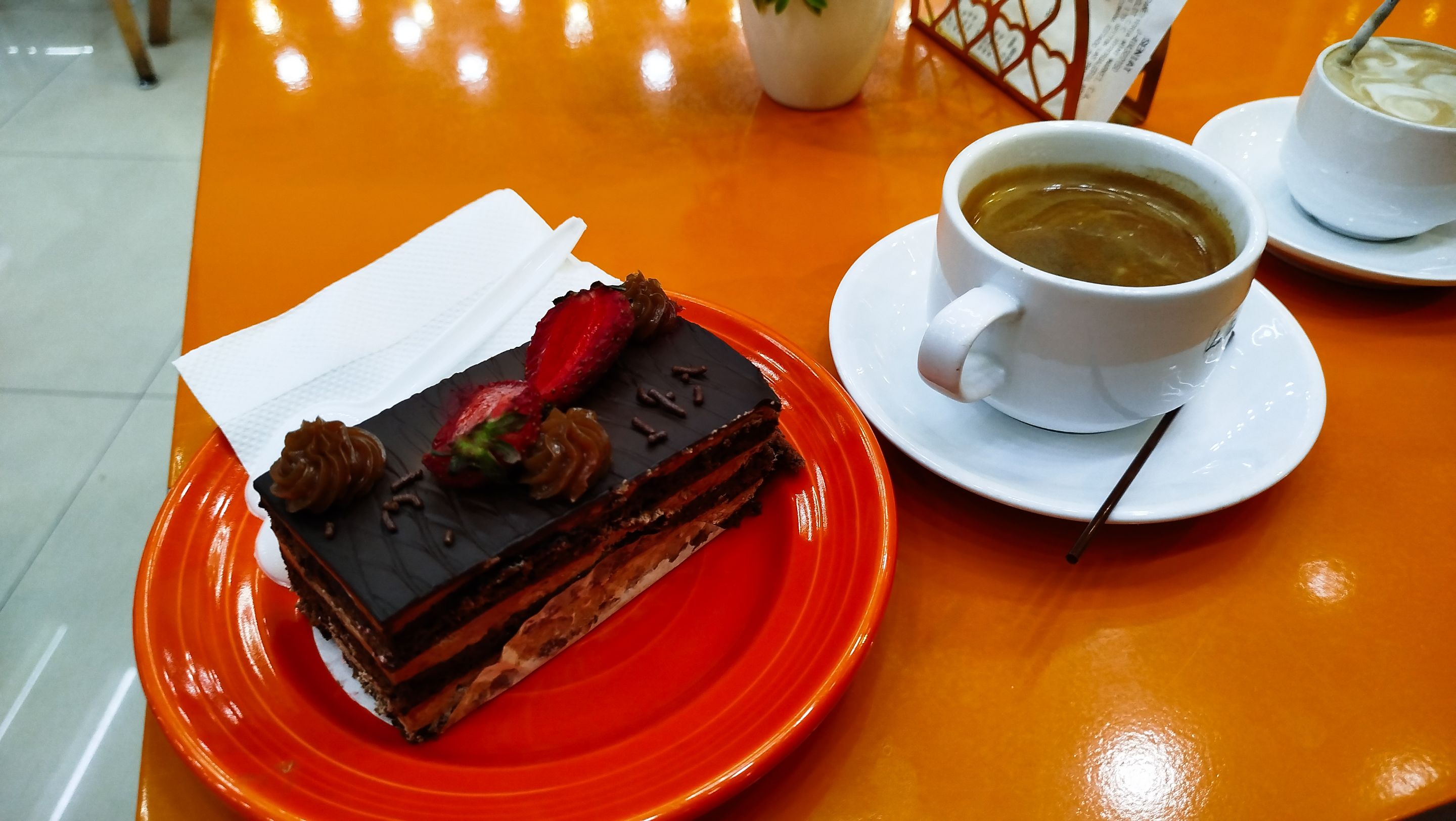 So after going out, I went looking for her and we went for coffee. We added a sweet treat to this. It is the kind of thing I would call a cold and wet dessert. It was full of dark chocolate. And it was amazing. I went with my usual Americano and she wanted a Cappuccino.