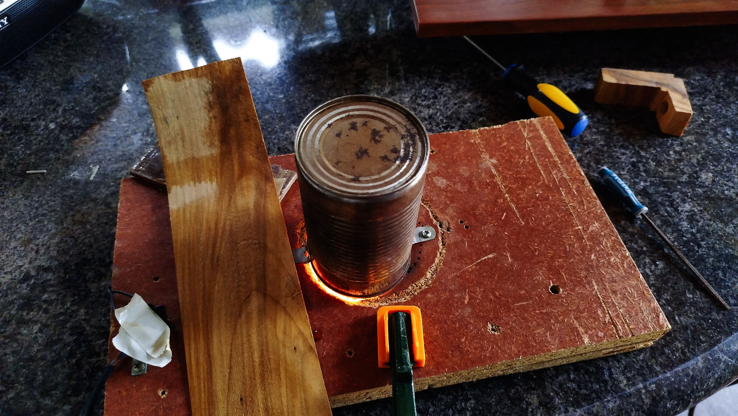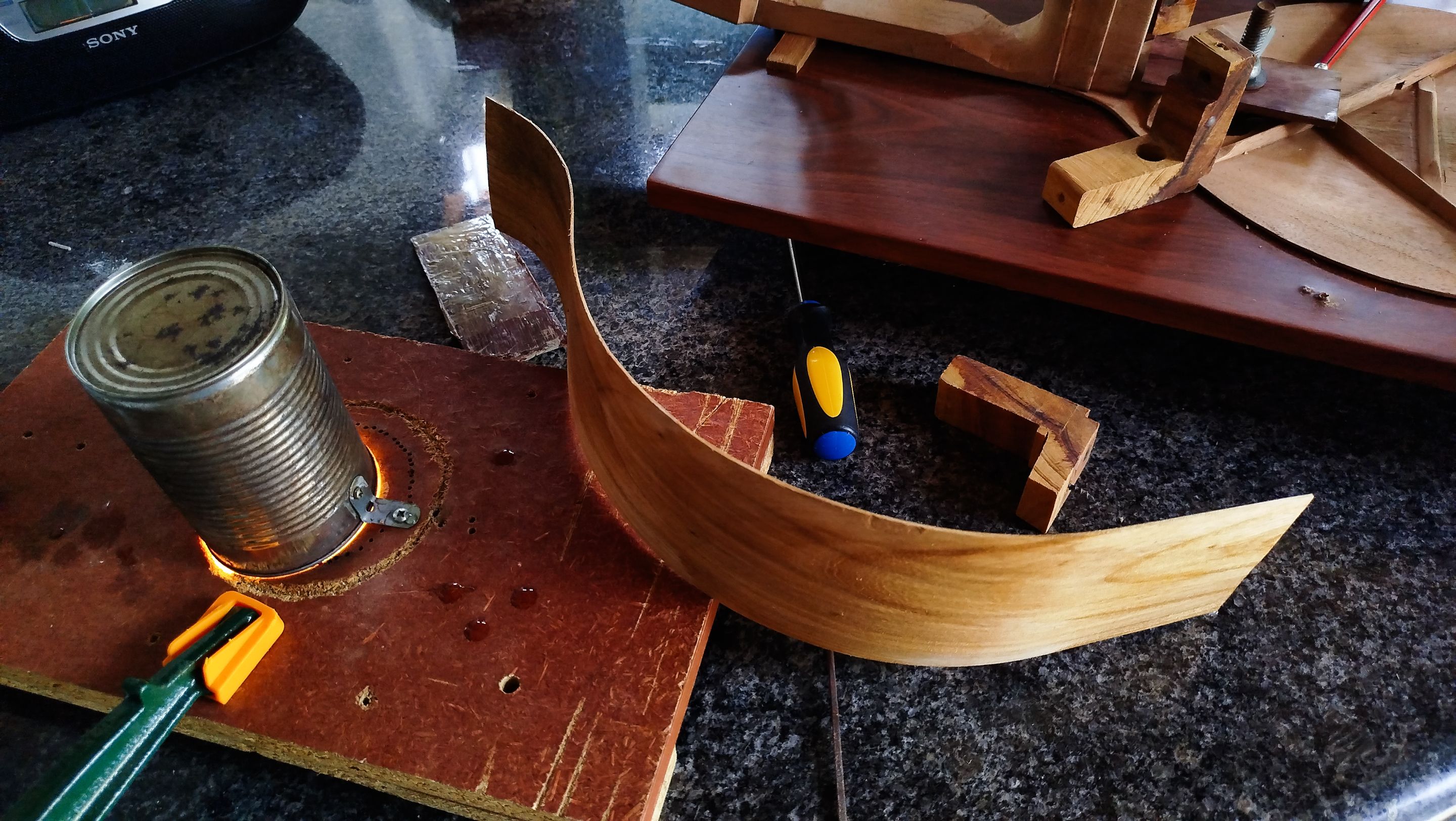 Once the wood has soaked for a long time, we turn on the bender. We need to wait until we can throw some water on the bender and see the Leinderfrost effect. That means that the water drops do not evaporate but dance on top of the can. When this is that hot, we can bend the sides without too much effort. Using some other pieces of wood to avoid touching the wood is also important. We can get burnt easily once the water dries during the bending process. We can use the mould and the lines to make sure we are bending the right curves.