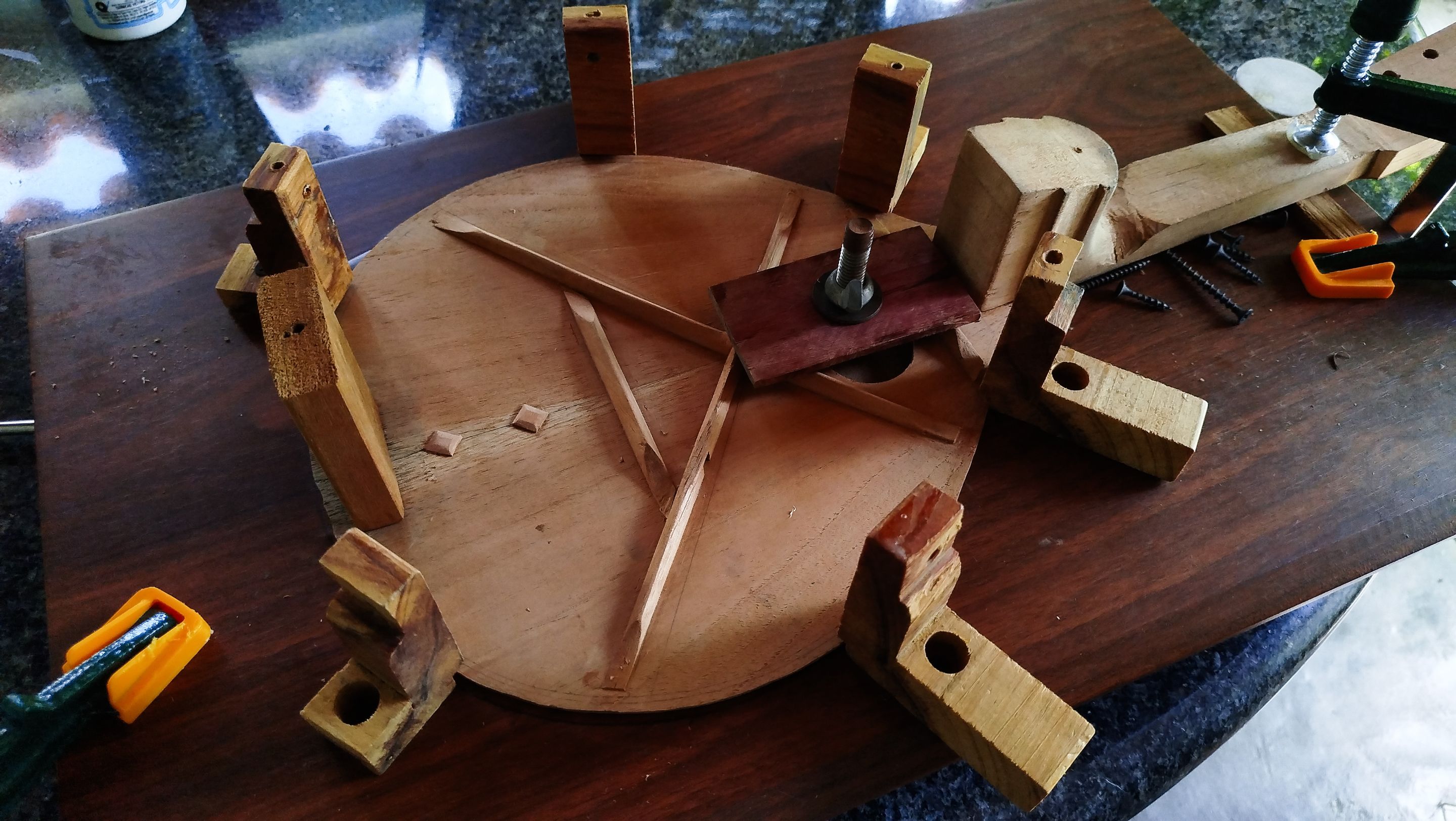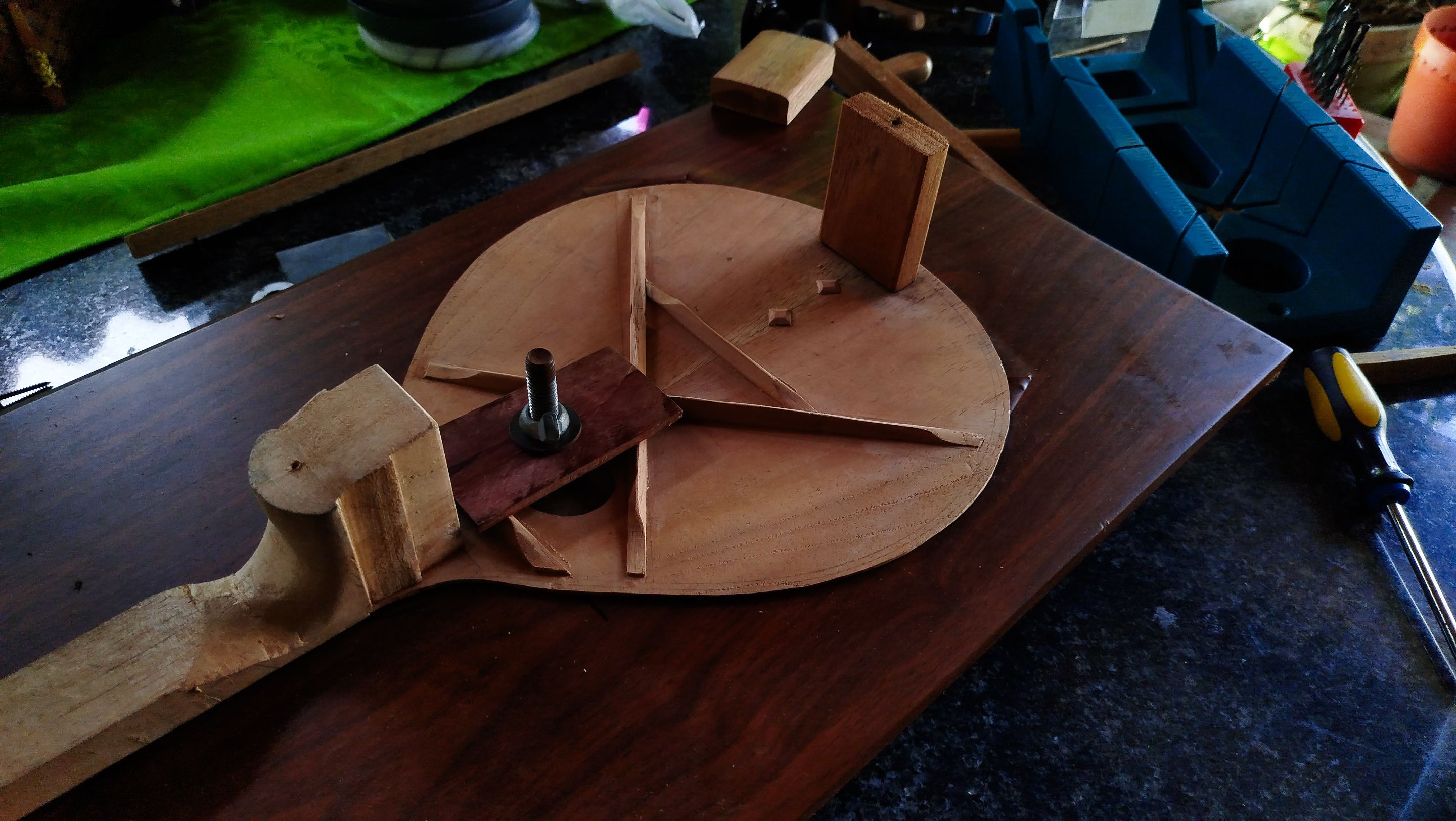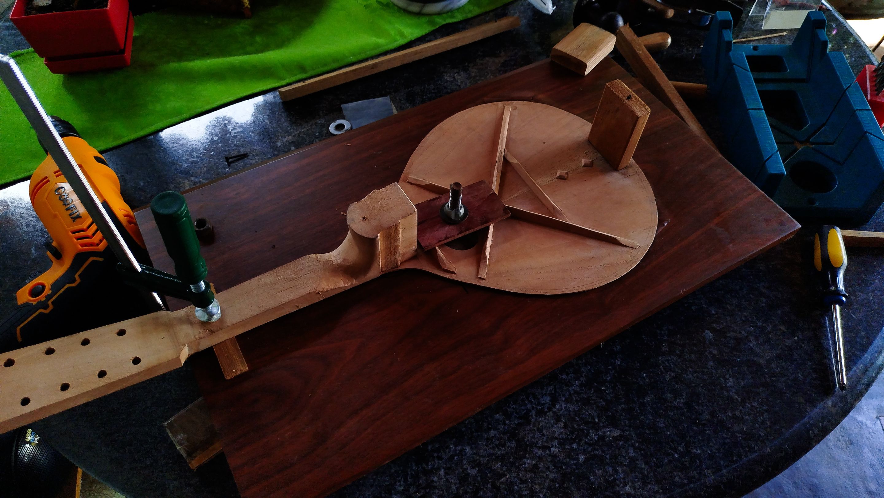 We can also use some contraption to make sure the glue up is proper. The idea is using a piece of wood and some screws to make sure the end block gets glued in place. The rest of the job is using another piece of wood and using it to hold the neck and sound board assembly against the mould.