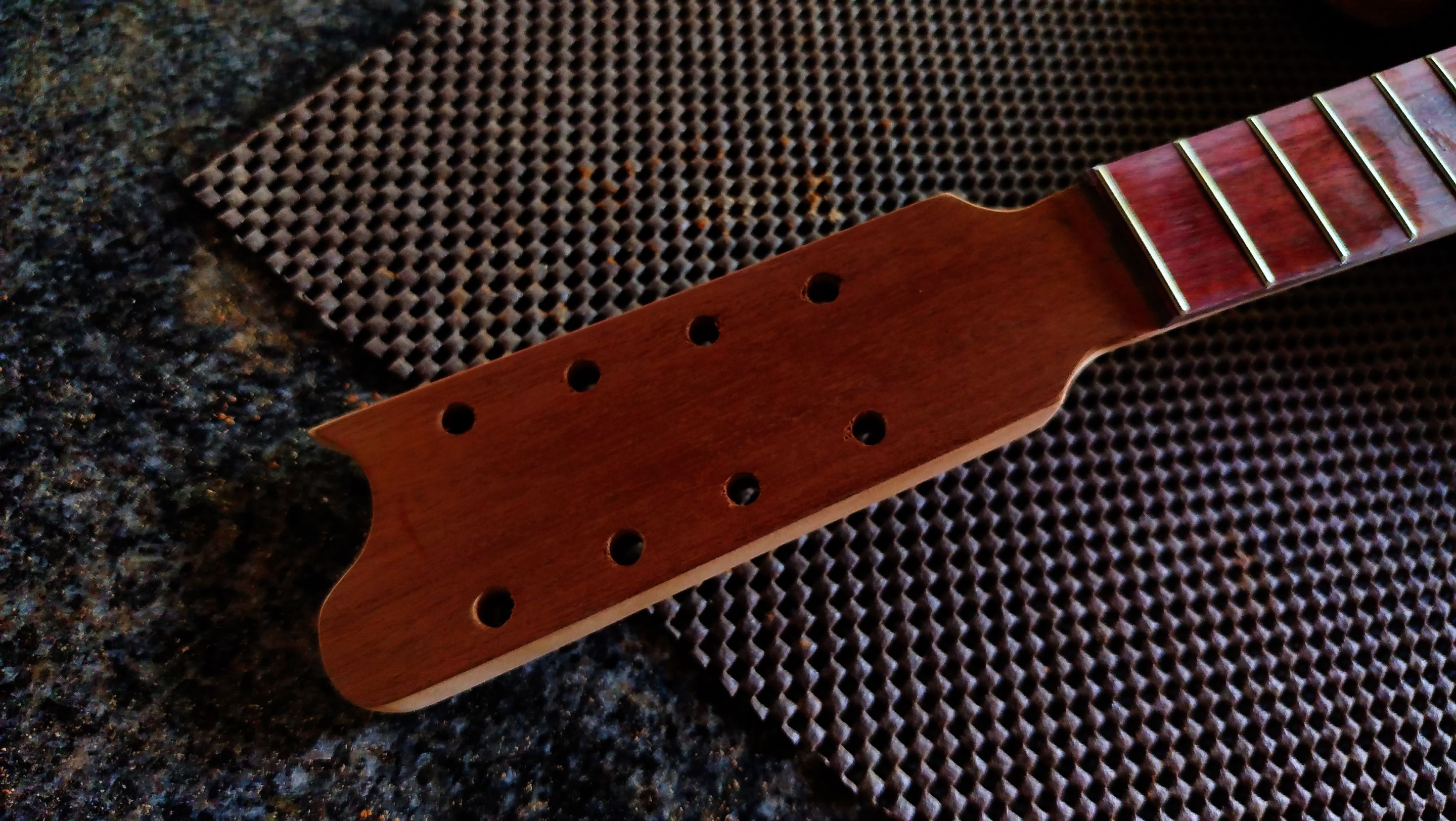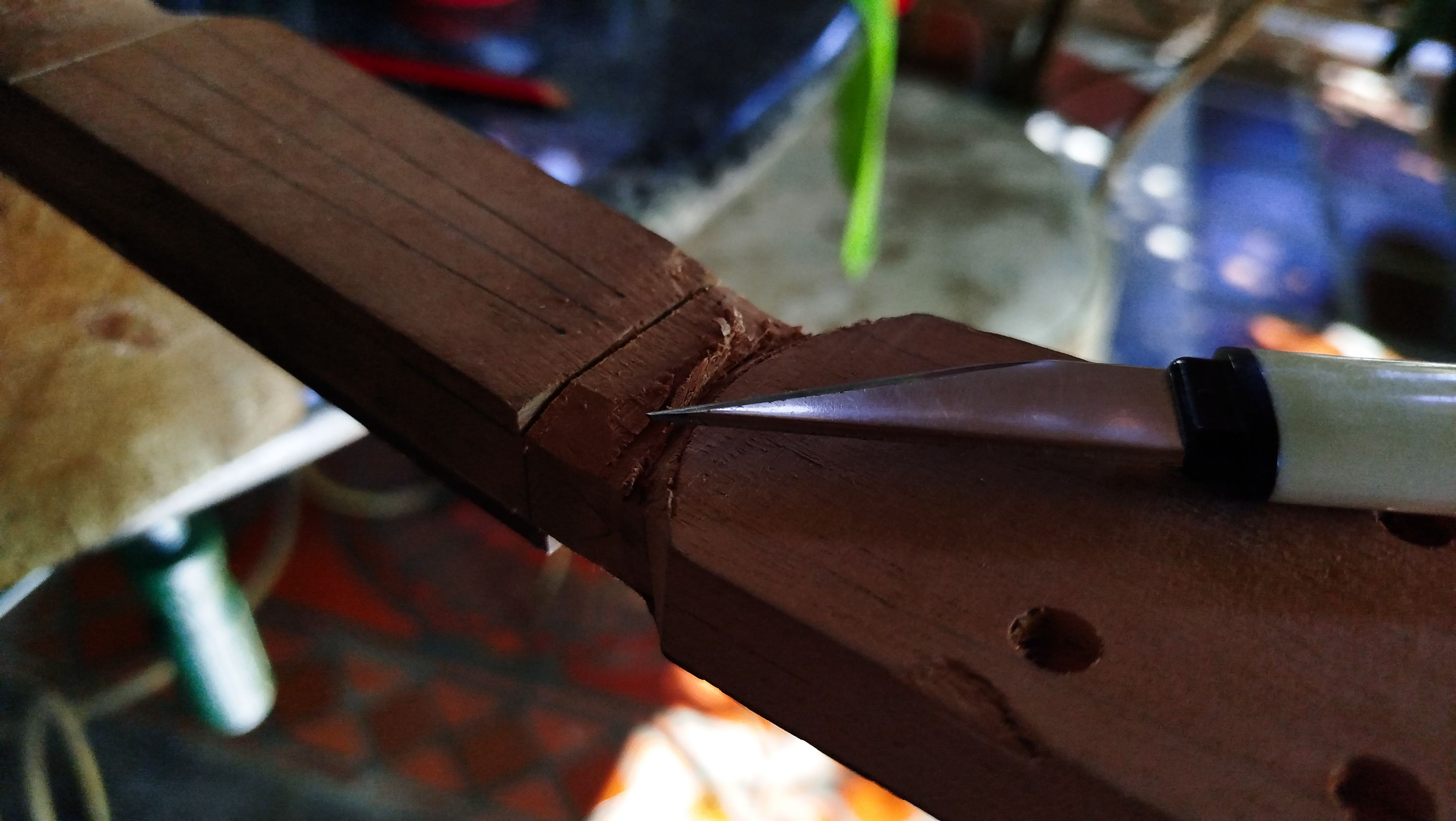 After having the frets installed, we are finally rounding the neck. To create the the shape, we need to draw some lines to have a way to guide ourselves. Then we start on the nearest point to the head stock. This is to create the first part of the curve to guide ourselves and having the chance to recreate the curve along the rest of the neck.