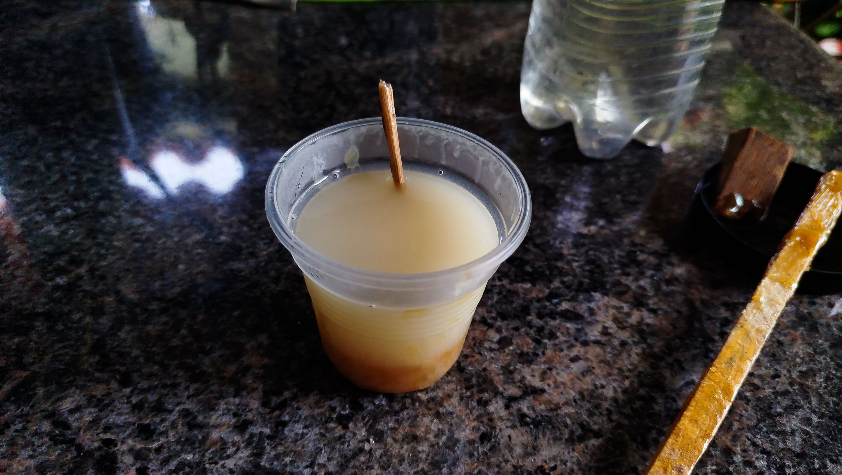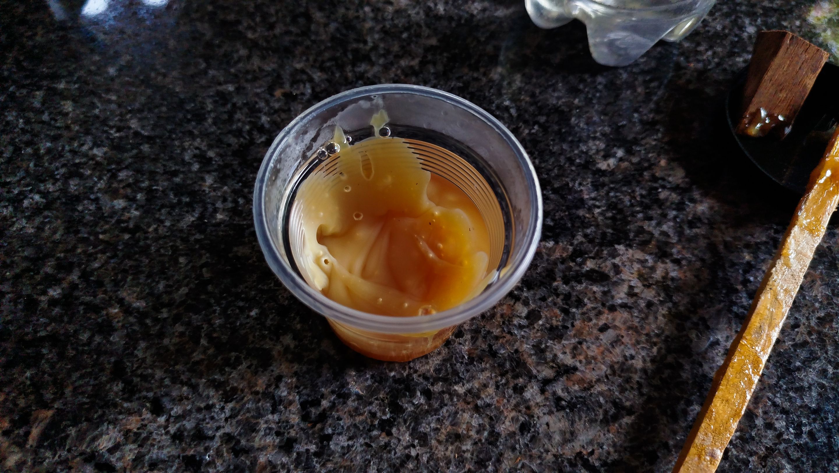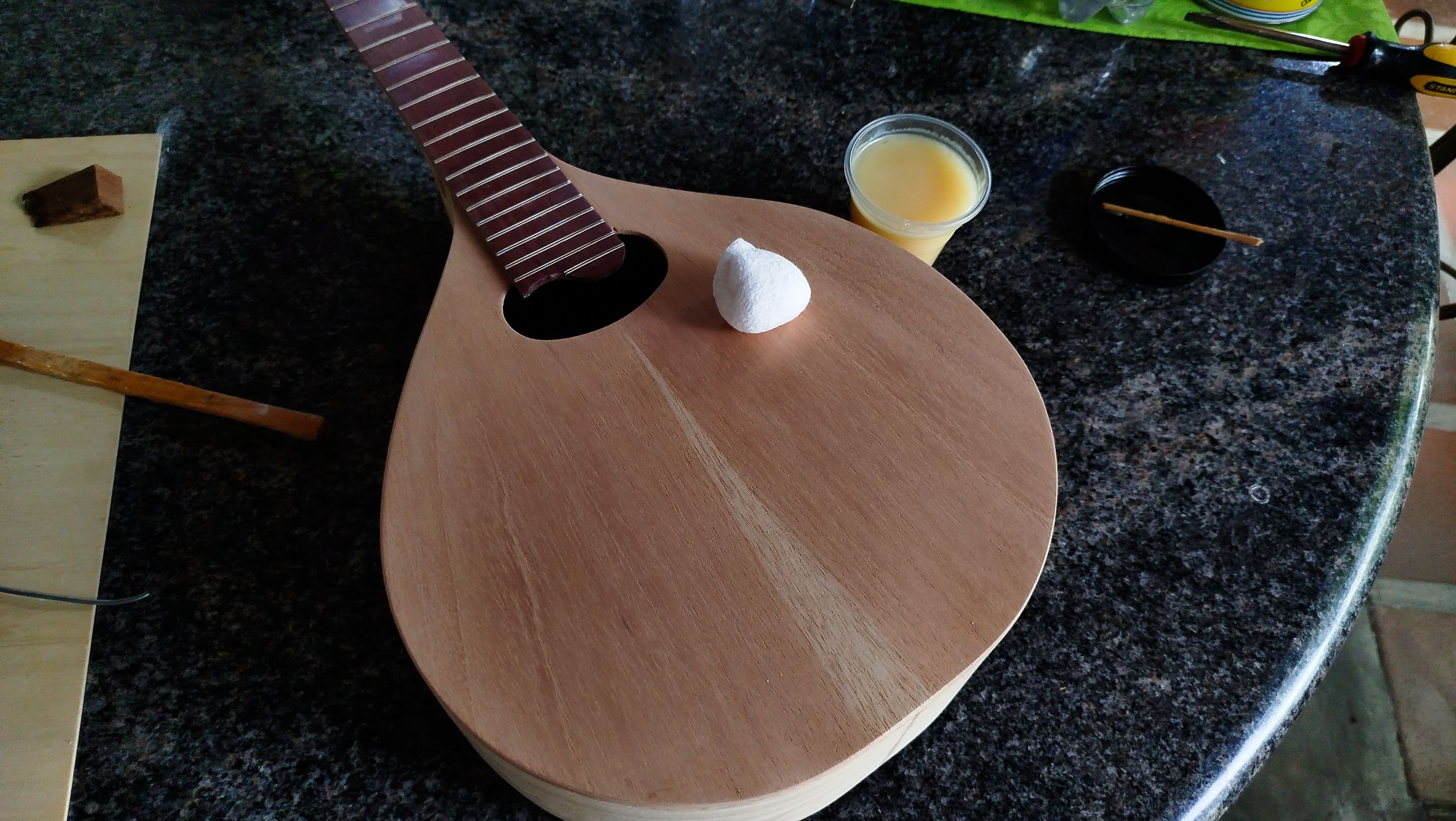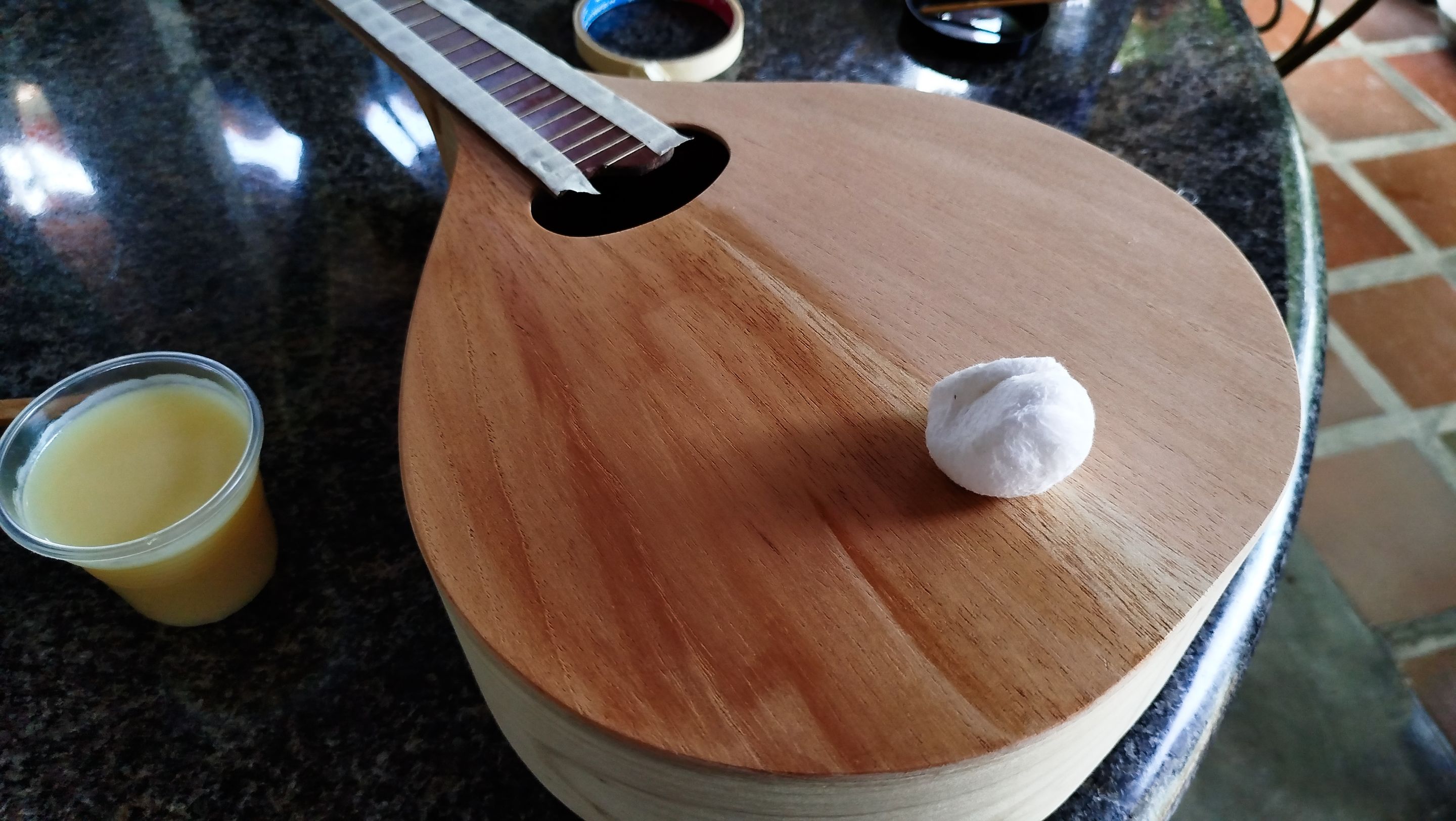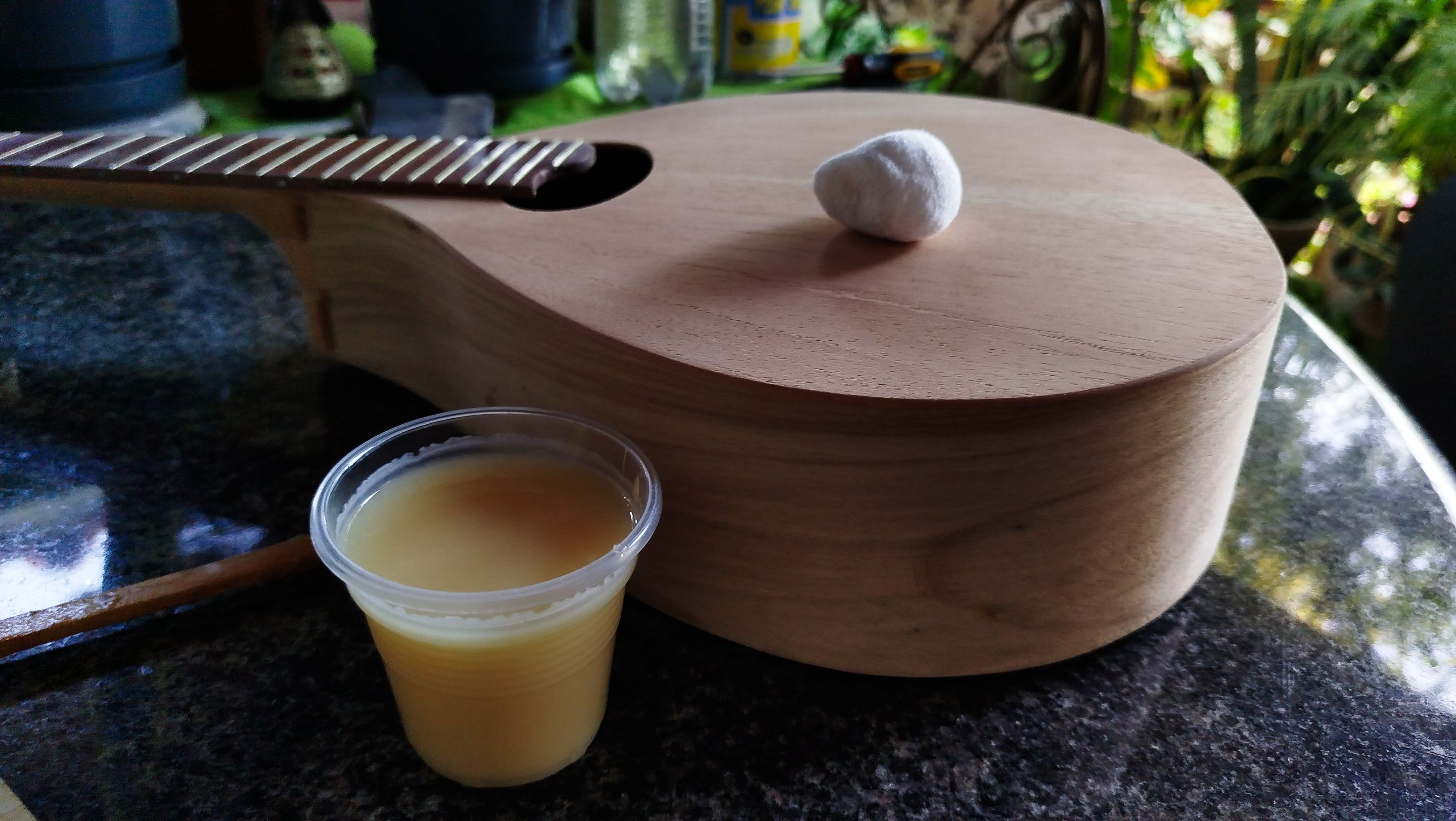 Now we make our mix of sealer. We start with a thin mix so it dries faster. We use a piece of cotton to apply the sealer on the rest of the instrument until we have covered all the other parts except for the fretboard. And we rinse and repeat until we finish everything we have mix in the cup.