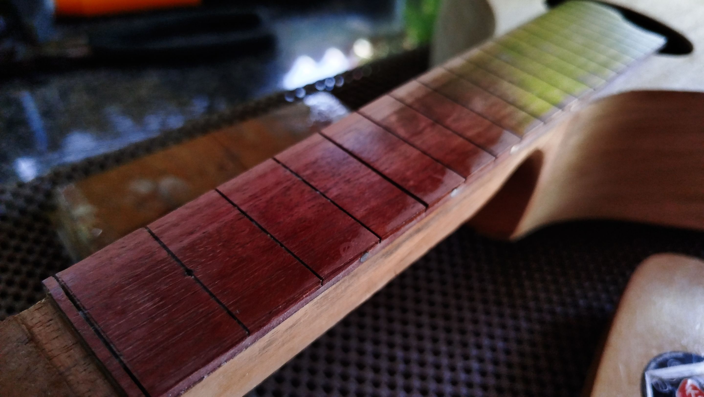 Before getting the frets in place, we need to sand the last coat we applied. That layer of sealer is going to give the fretboard a glossy finish. We use a fine-grit sandpaper. Then we remove the dust from all the fretboard. The last bit of work on the the fretboard finish is to get some layers of oil on top on the surface. We just need to let this dry up.
