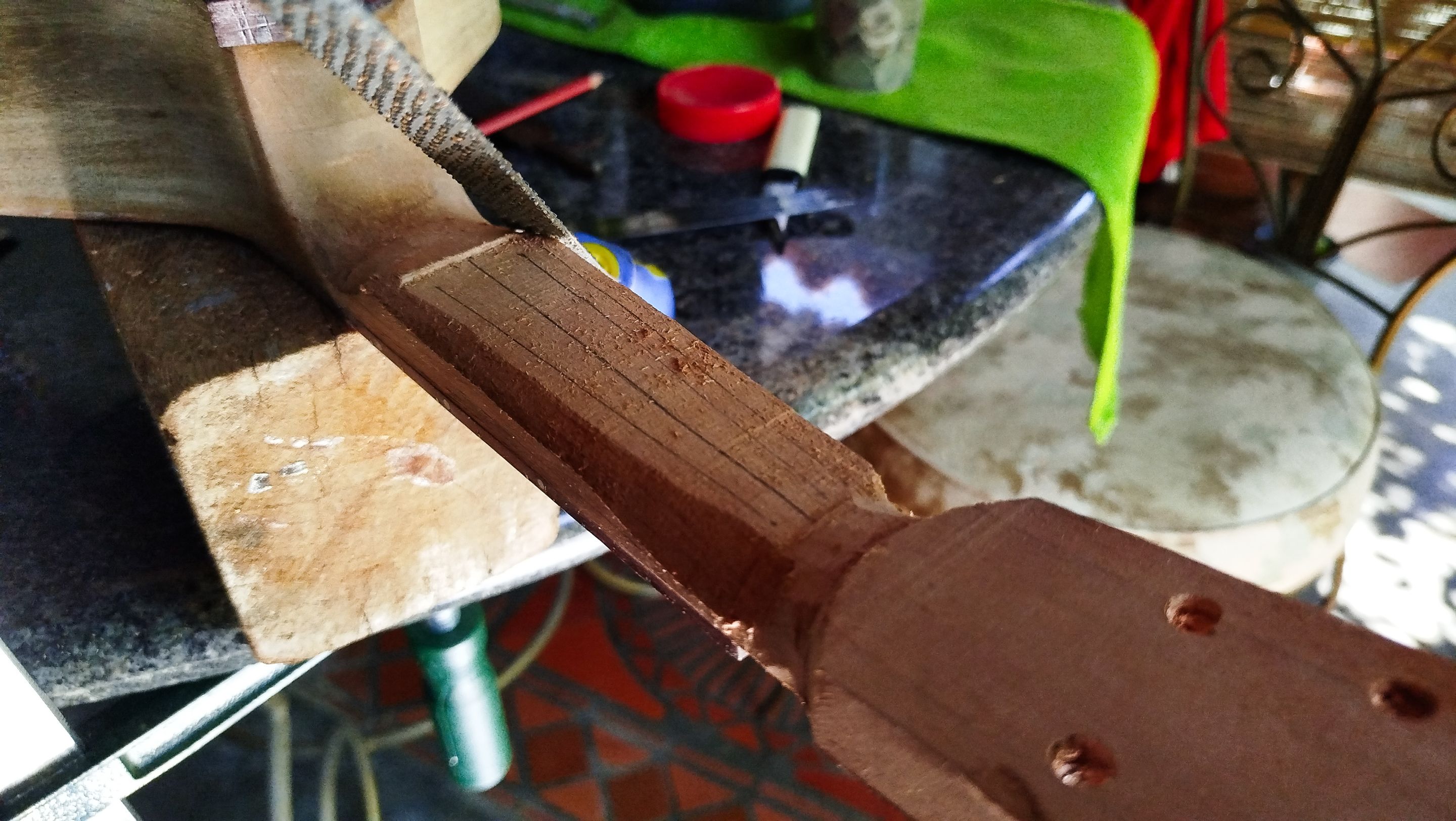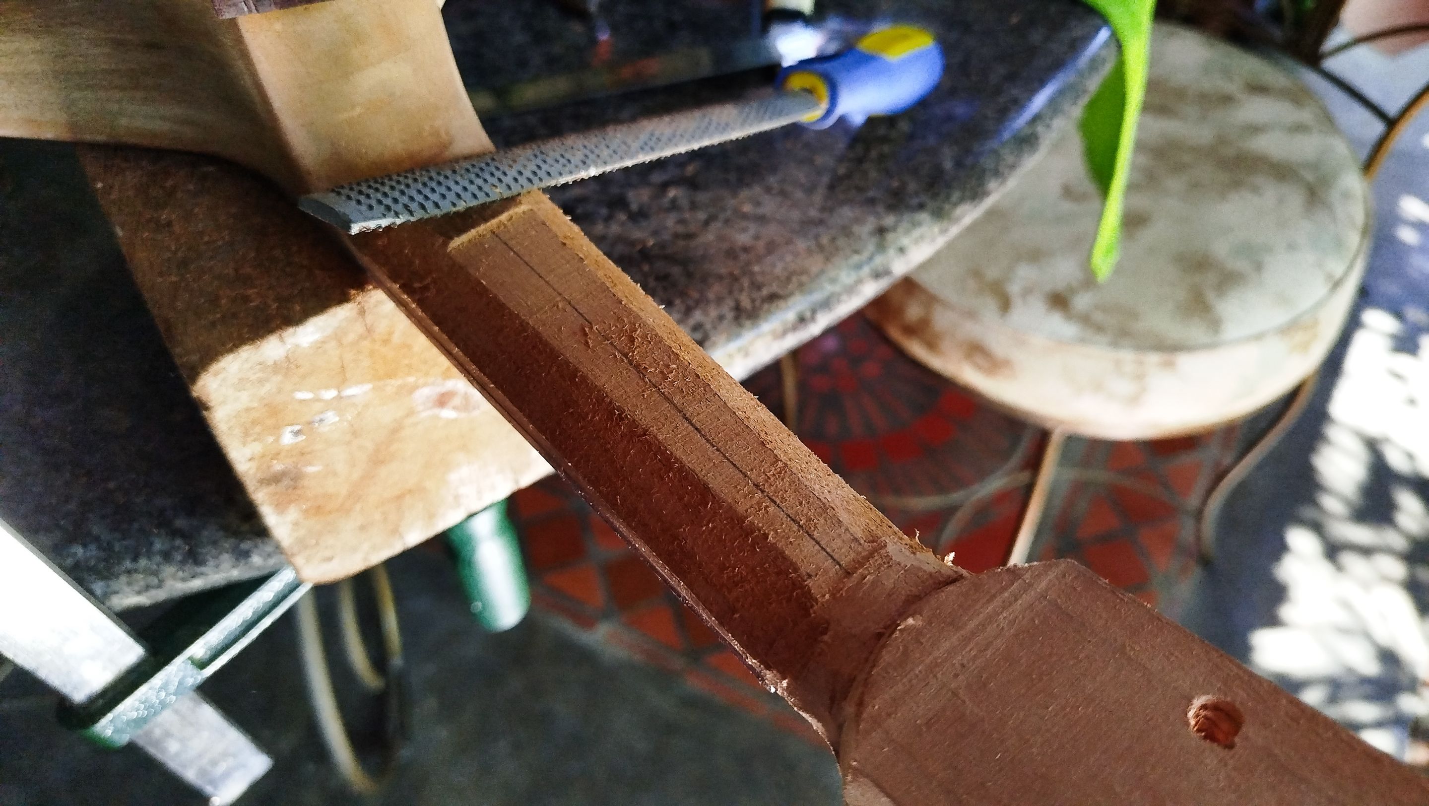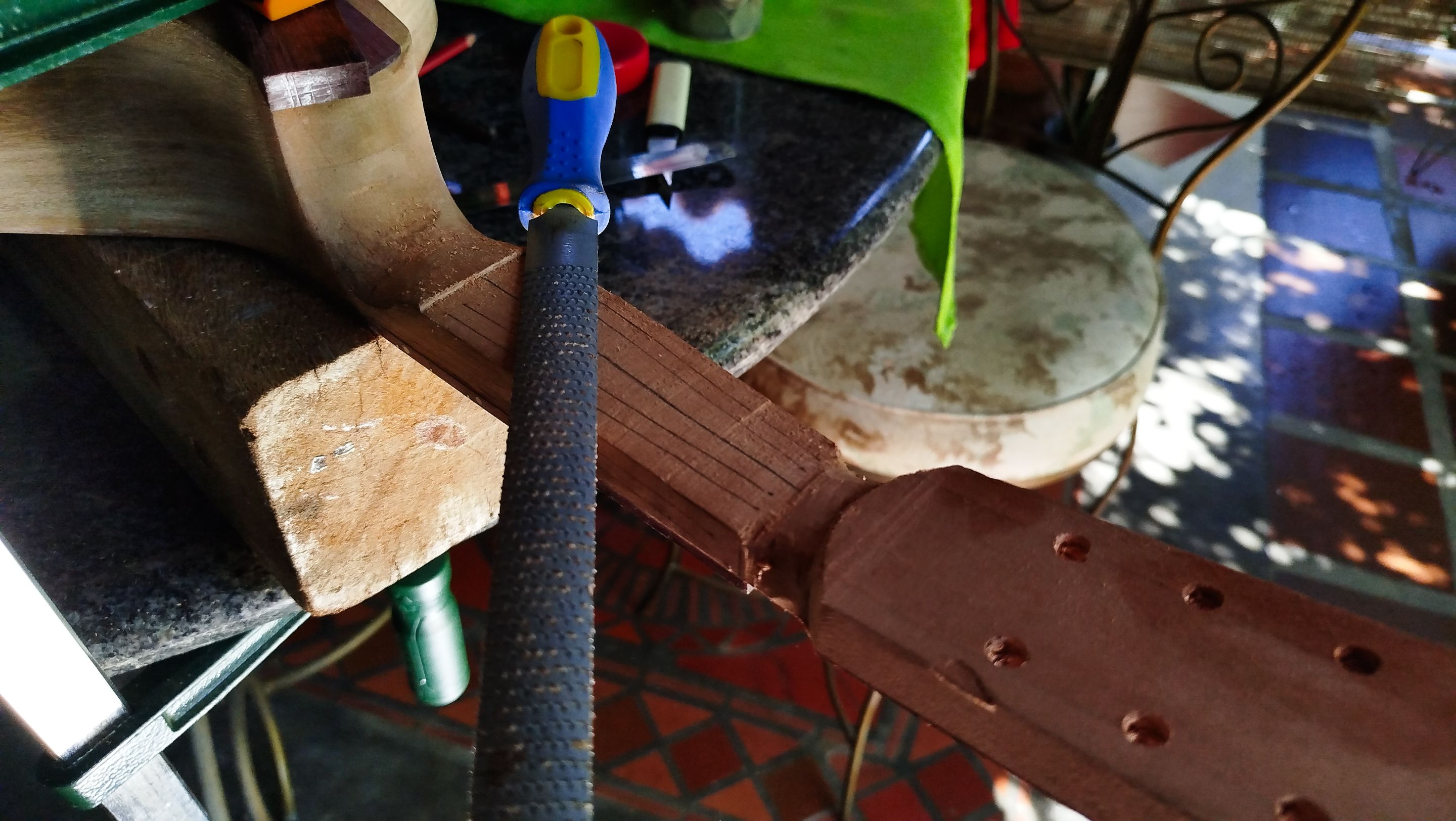 The next part is using the rasp to create the slope from the head stock to the heel. And with this we can start to round the rest of the surface by using the method of cutting corners. We just need to keep creating corners using the rasp and keep removing them. We keep repeating this process until we are ready to use sanding paper.