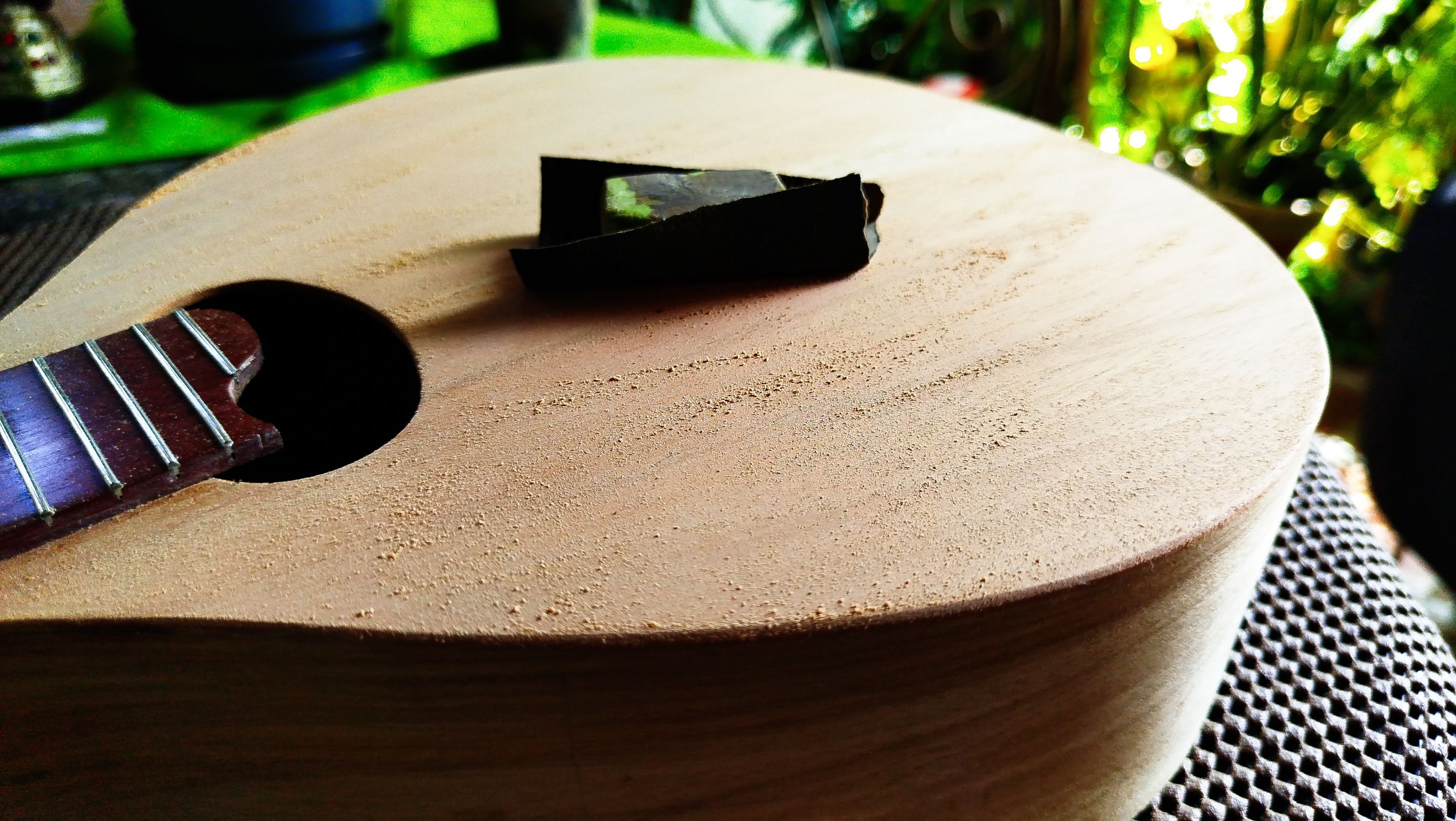 We are finally on the stage of sanding the rest of the instrument to start the whole process of applying the sealer. Now we take the instrument and start sanding the rest of the instrument using 100-grit sandpaper. This is repeated until we are looking at an even surface. Then we are just going to use a damp cloth. This is to make the splinters of the wood rise. Now we are just going to repeat the use of the same sandpaper. The process starts over and over until the splinters do not get up.