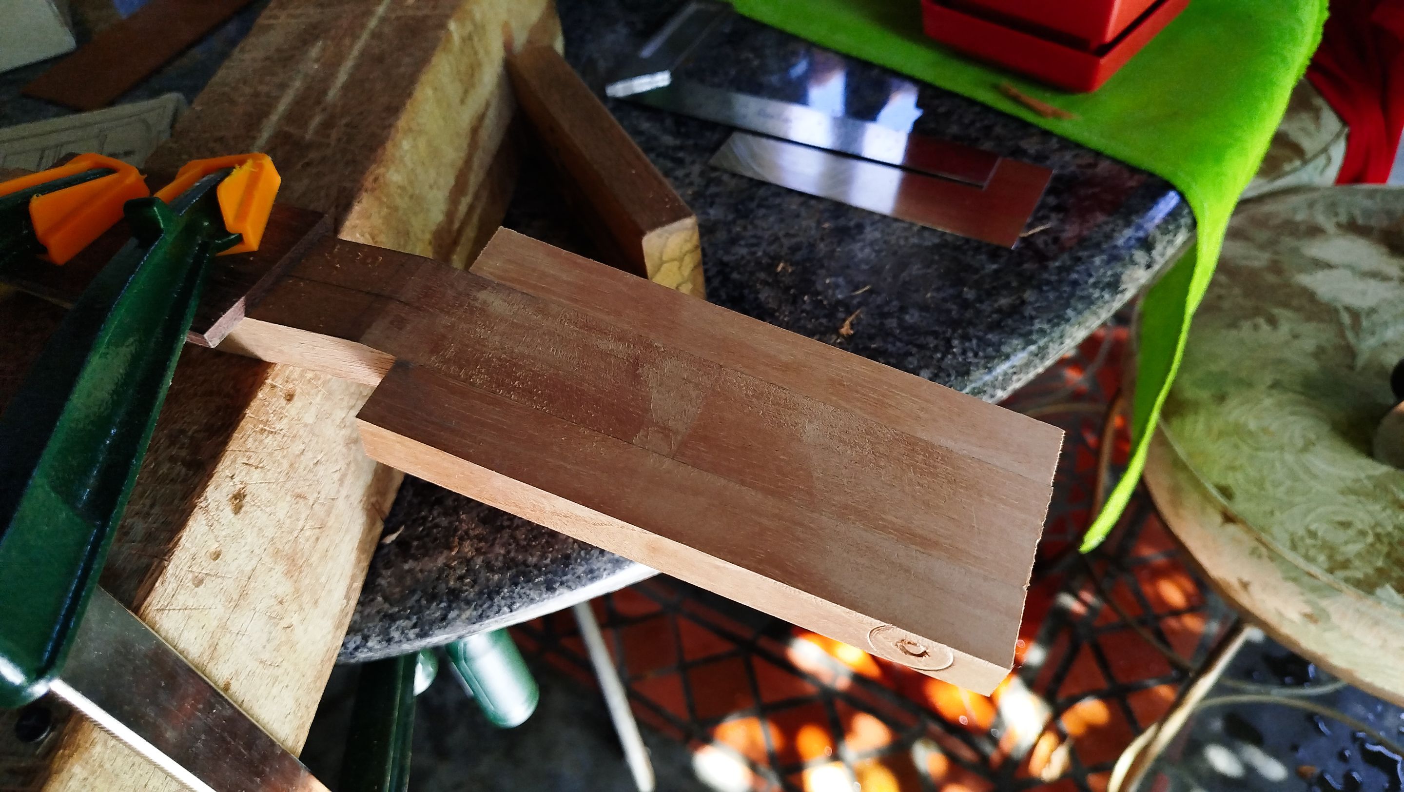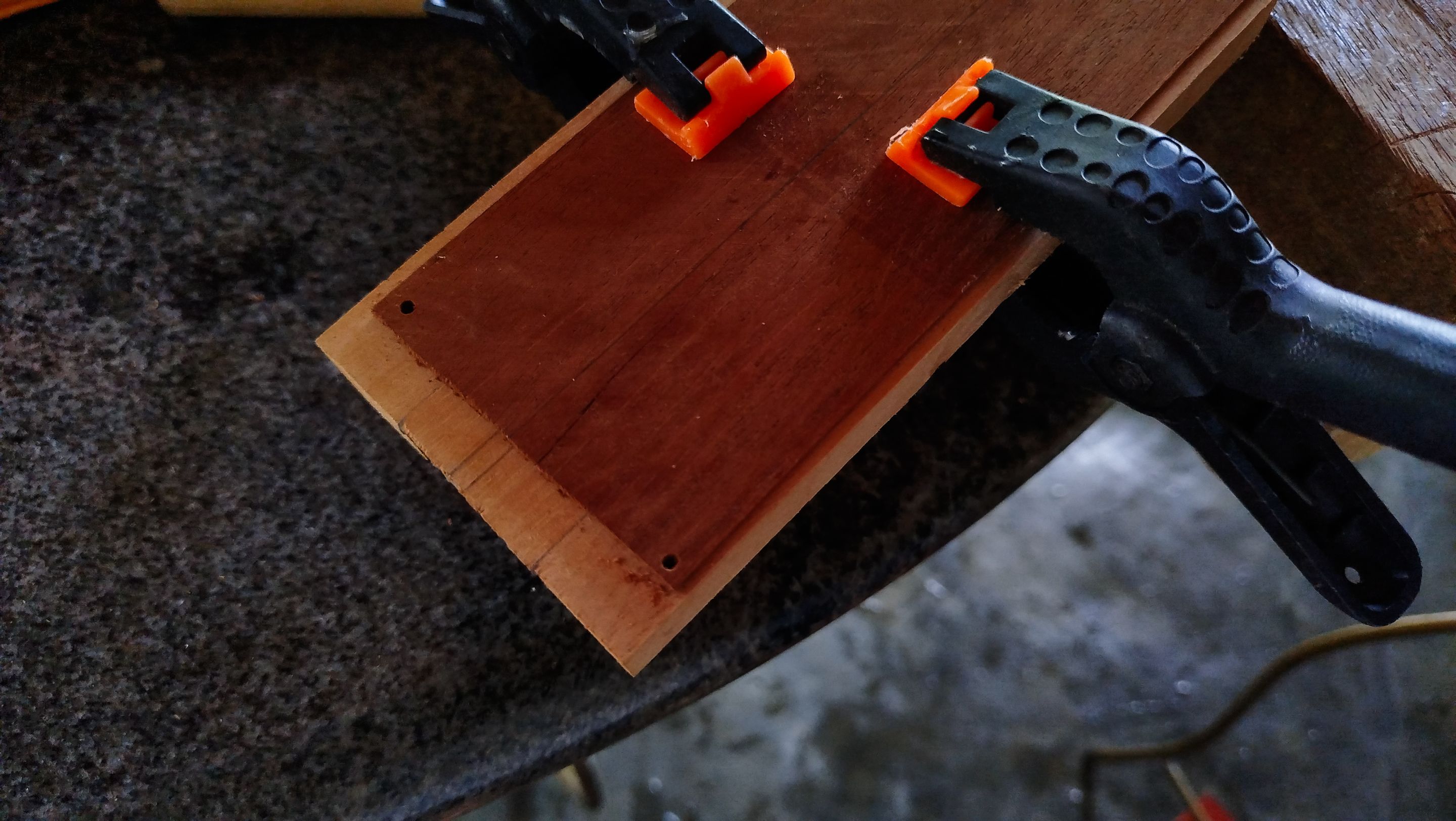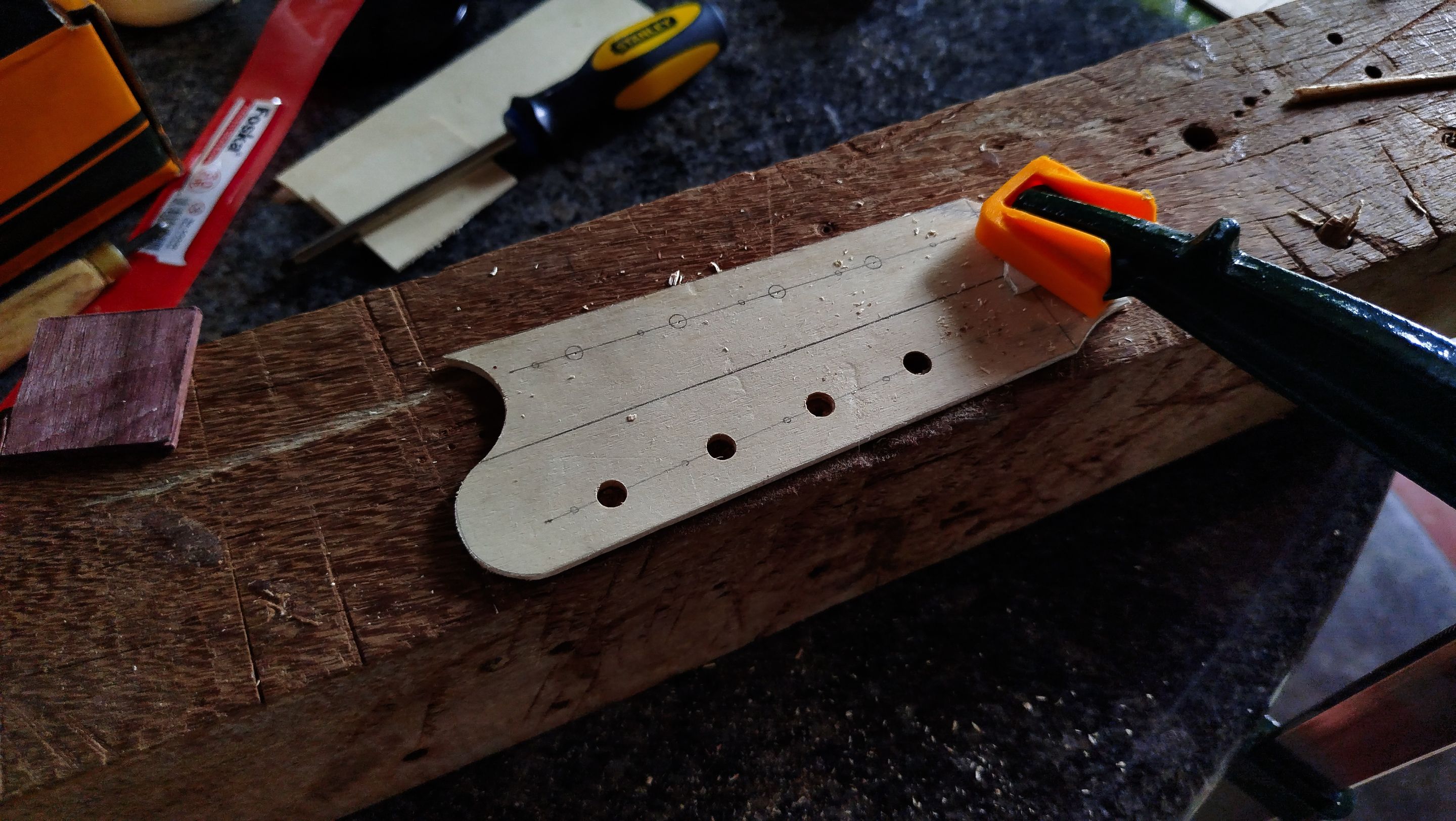 The next part is adding the veneer to the head stock. This is just an ornament to adorn the front part of the piece. We make some adjustments to create some straight lines to hold the veneer in place. We start by holding the mahogany veneer in place and make some holes to add anchors to keep the ornament in place for the glue up. We make a first dry fit to make sure everything is in the right place. Then we apply glue and use the clamps.