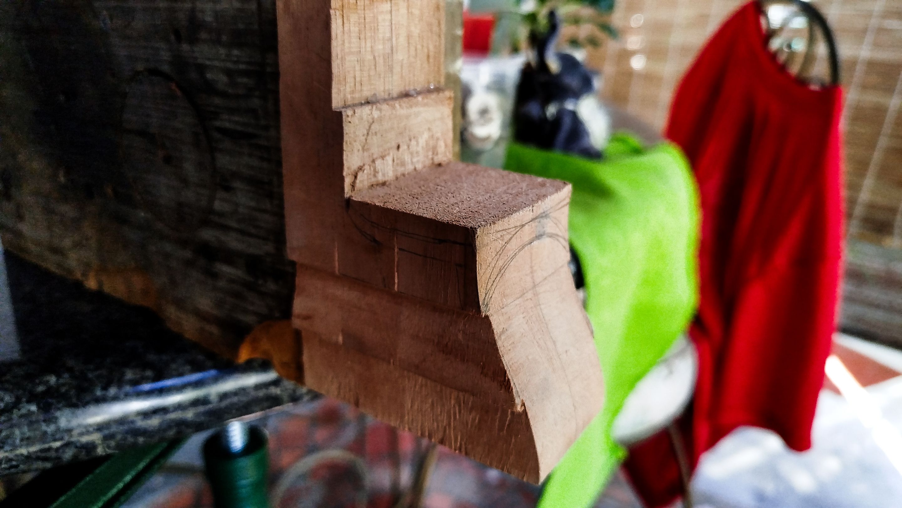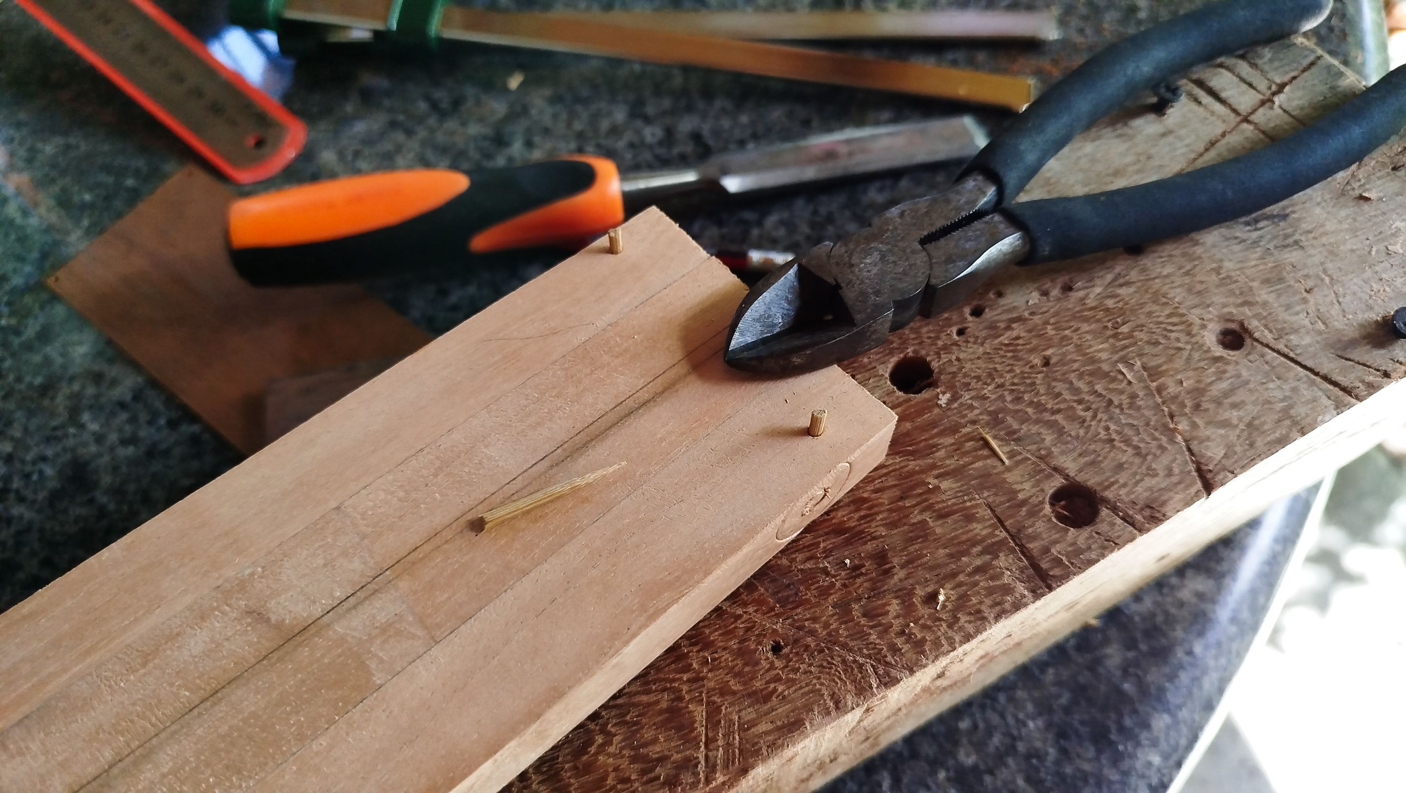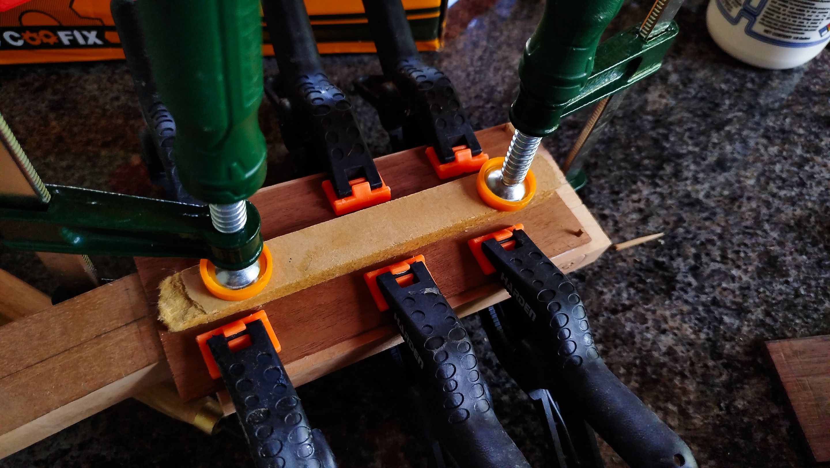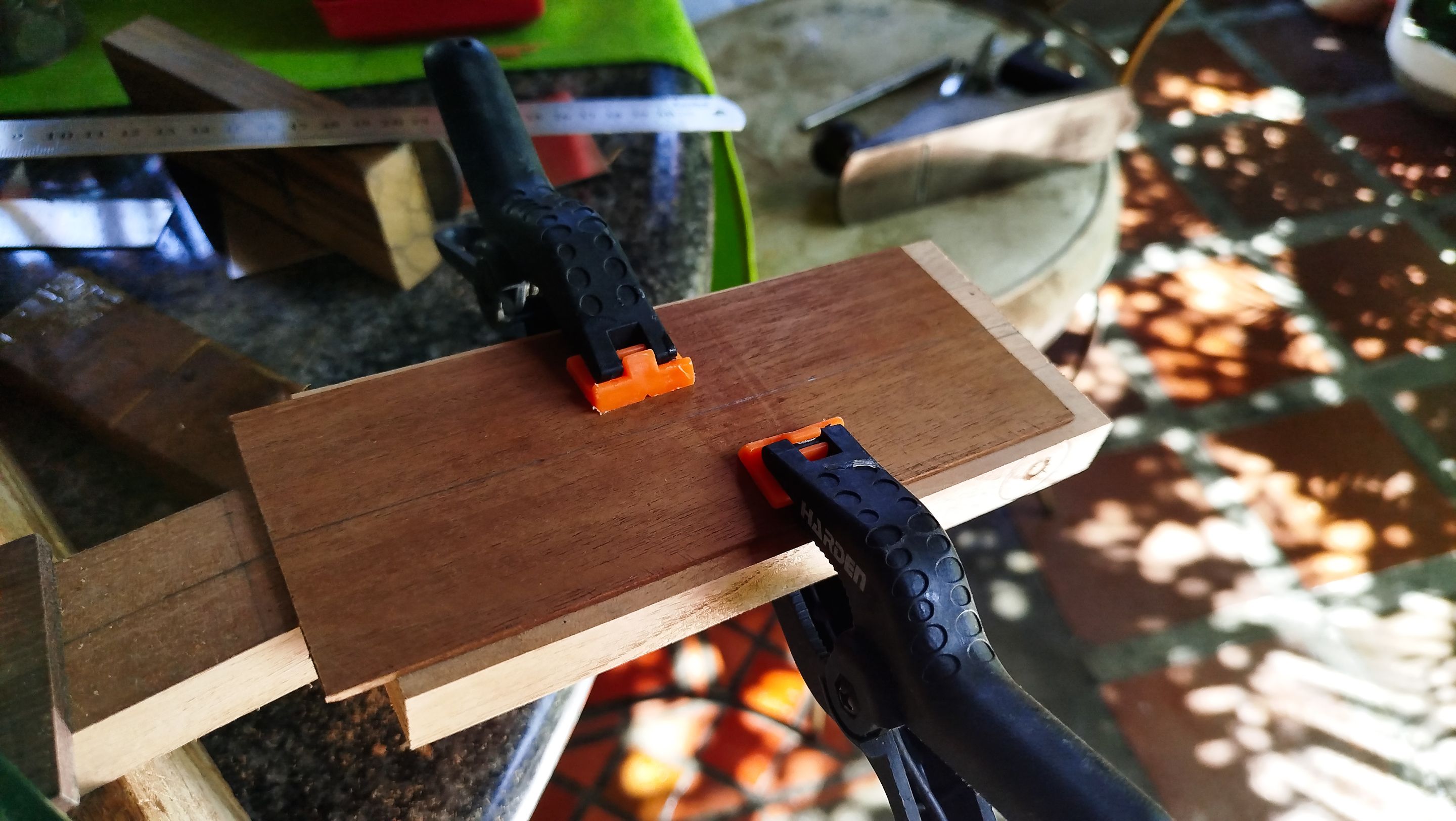 The next part is adding the veneer to the head stock. This is just an ornament to adorn the front part of the piece. We make some adjustments to create some straight lines to hold the veneer in place. We start by holding the mahogany veneer in place and make some holes to add anchors to keep the ornament in place for the glue up. We make a first dry fit to make sure everything is in the right place. Then we apply glue and use the clamps.