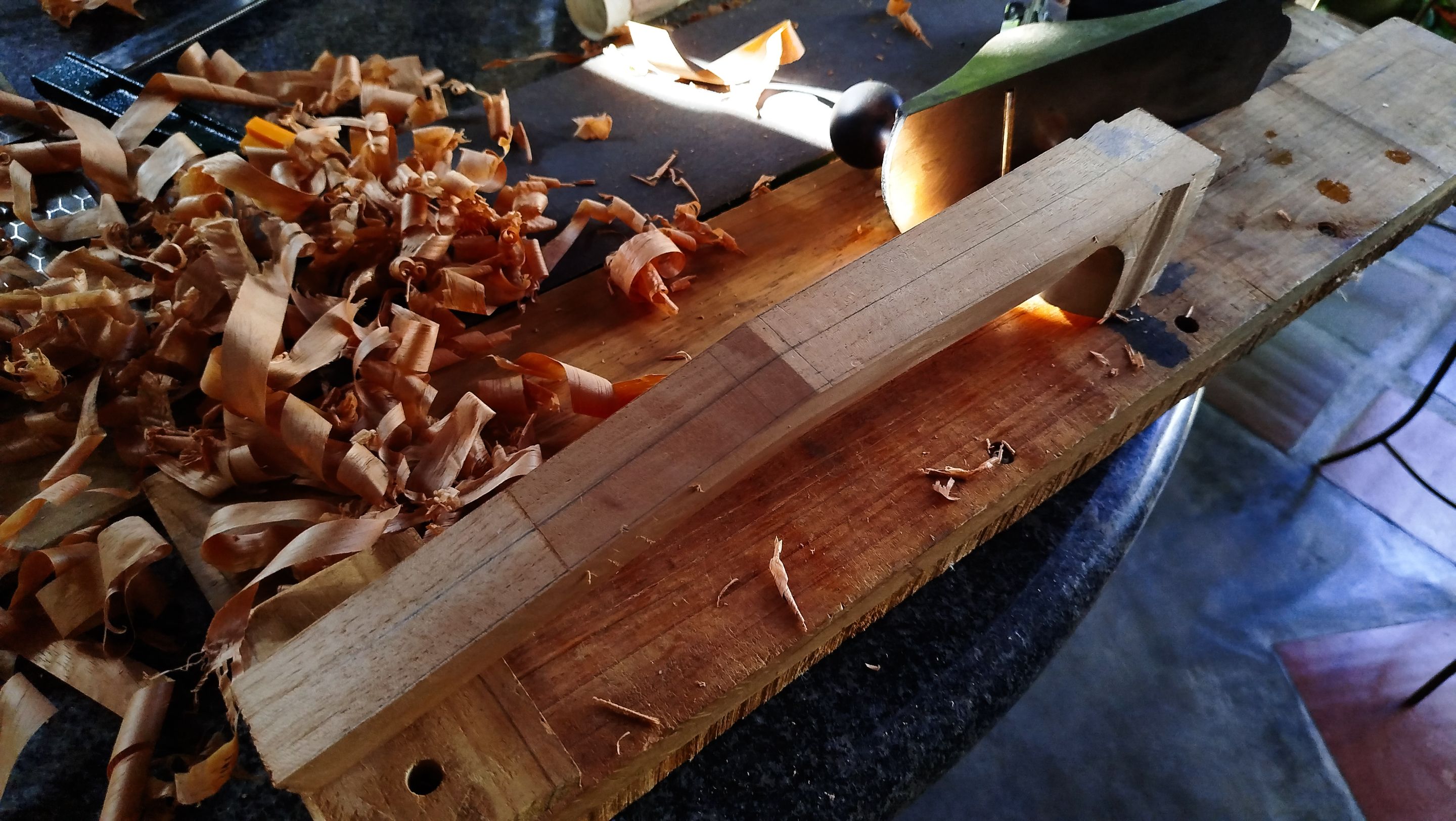 The first part of the head stock is creating the slope of the neck. We use the hand plane to remove from the sides of the neck taking into consideration the lines we had made previously. These lines are for reference of the fretboard. We have the thinner part near the head stock and the widest near the sound hole. When we get close enough to the line, we stop.