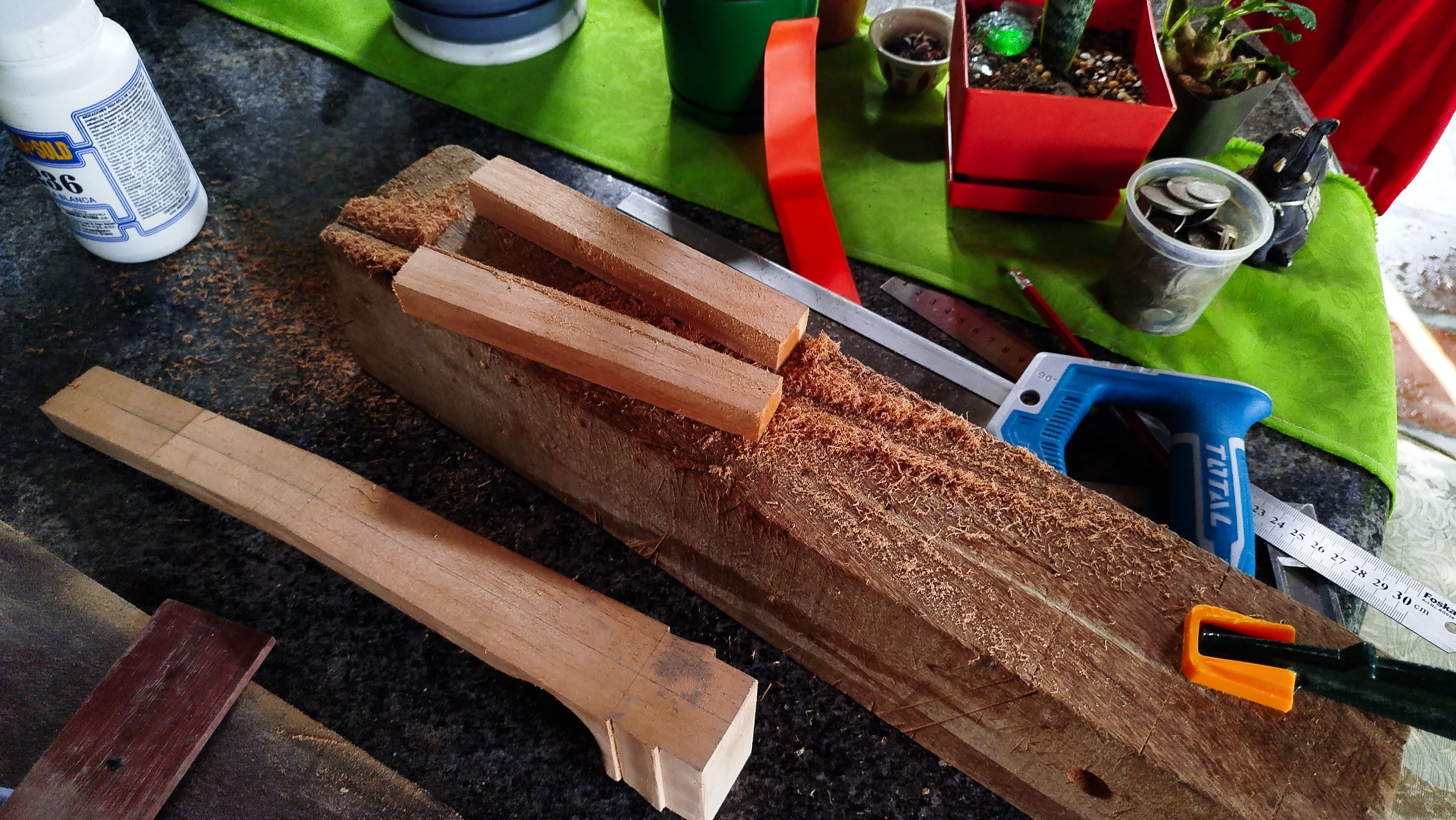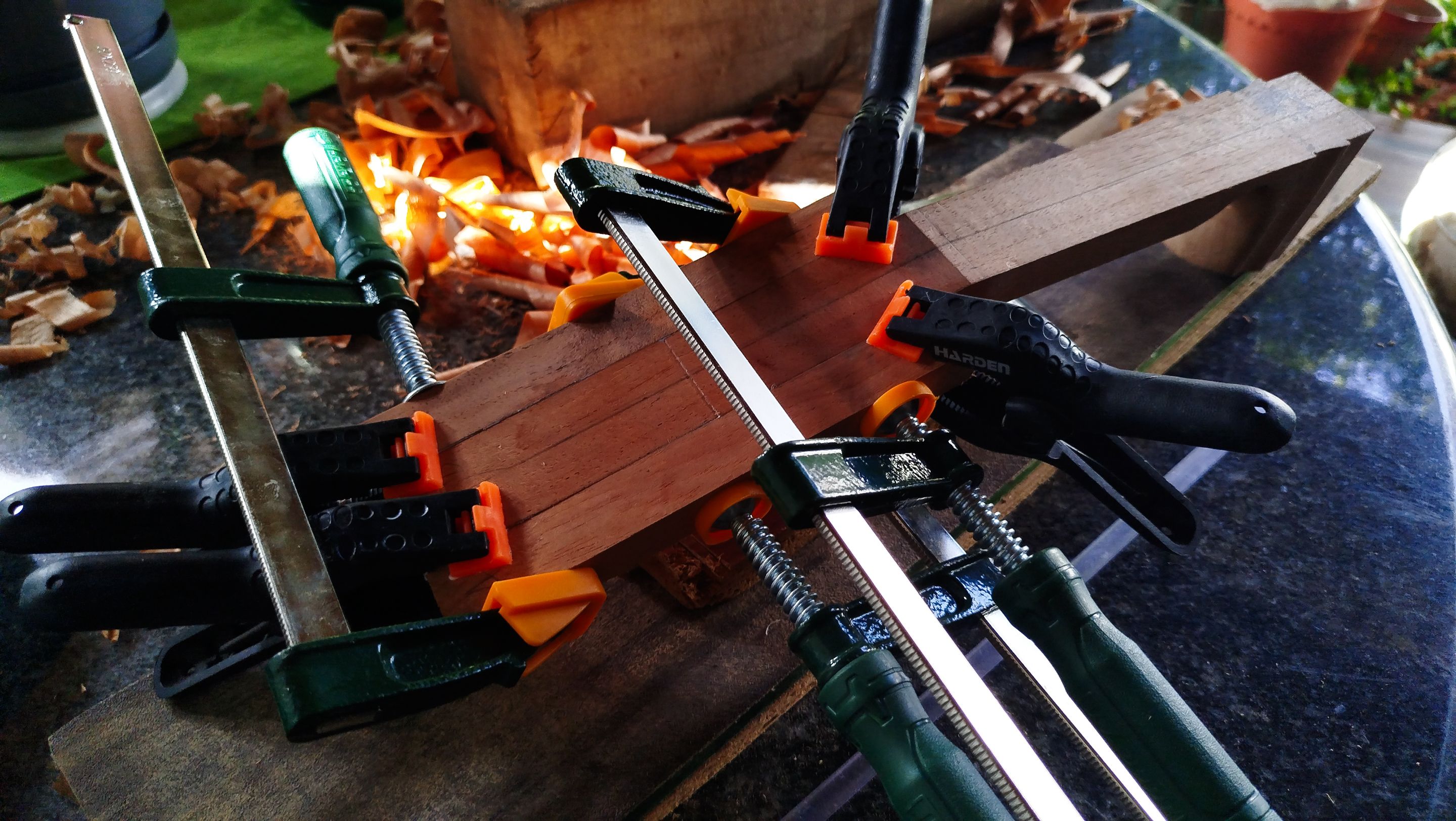 Next, we star working on the bars we have cut before to finish the head stock. We need to create a flush glue up to have enough strength of the construction. We use our sanding table for this. And we might also use it to work the main structure of the neck until we have everything aligned. Next, we start making the glue up. We use some smaller clamps to keep the bars in place. Then we use the bigger clamps to apply pressure.