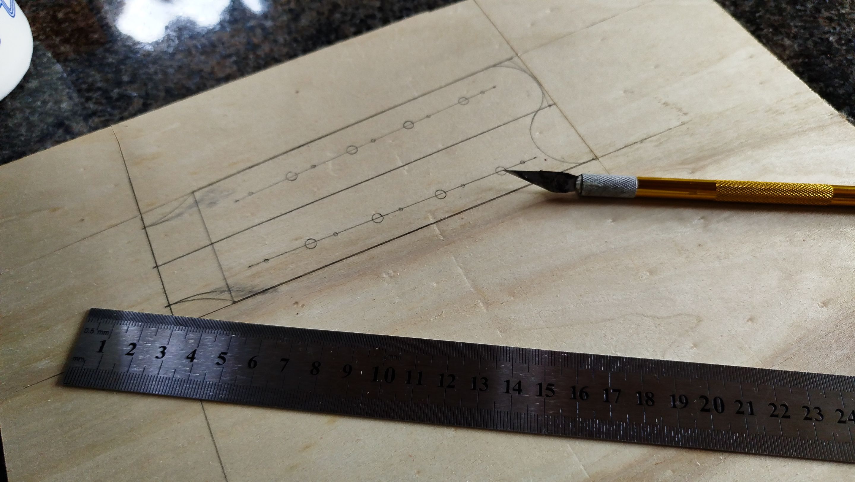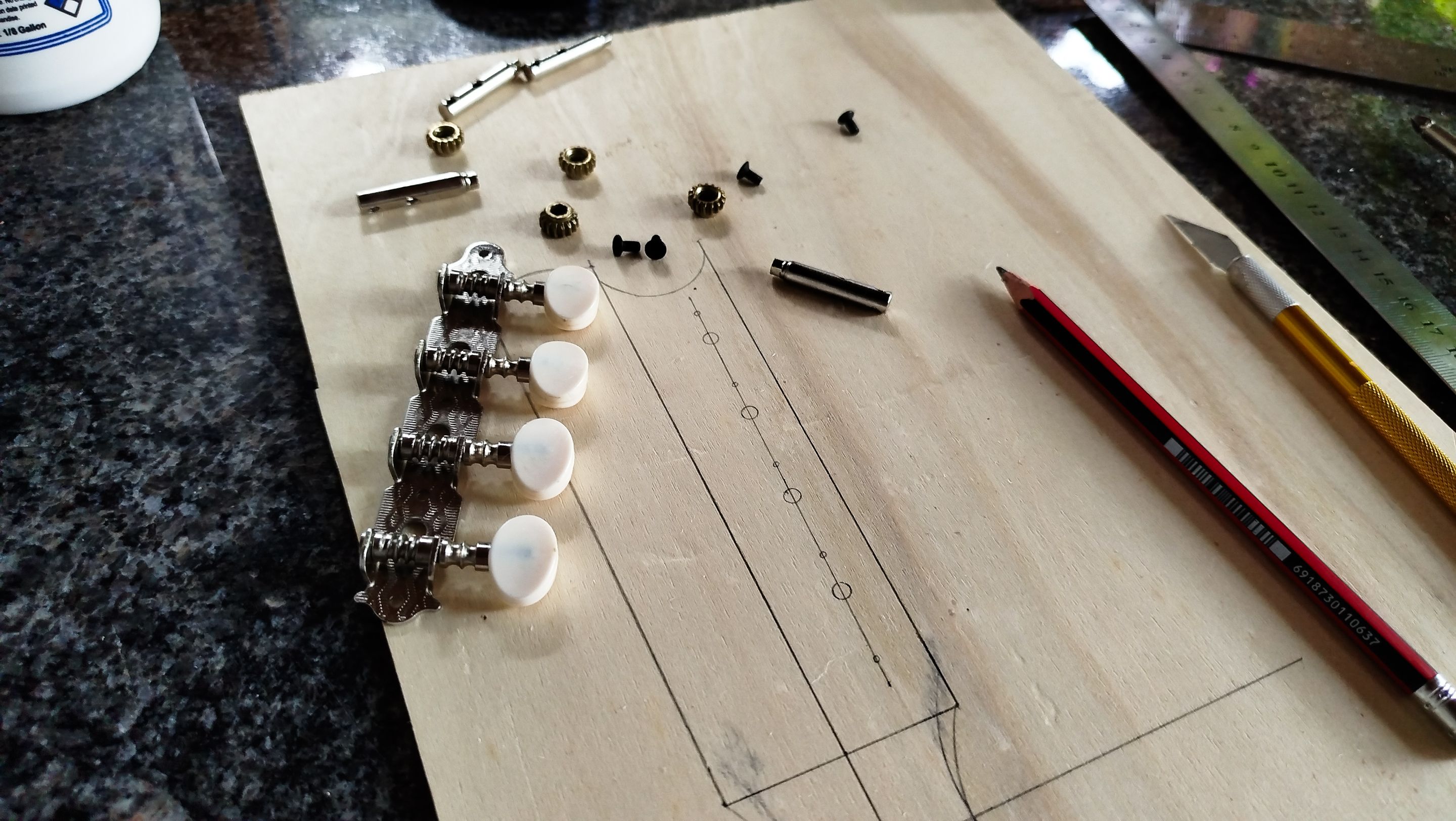 While this glues up, we are going to work on the template for the rest of the build. This will also work for all future builds. We are using some plywood for this task. We start by making the whole outline of the headstock. The rest of the template is made by using the tuners. For this we need to disassemble the tuners. The reason behind this that we need to use the alignment of the holes by using the tuners as its on reference. It gets tricky when the tuners come as one piece.