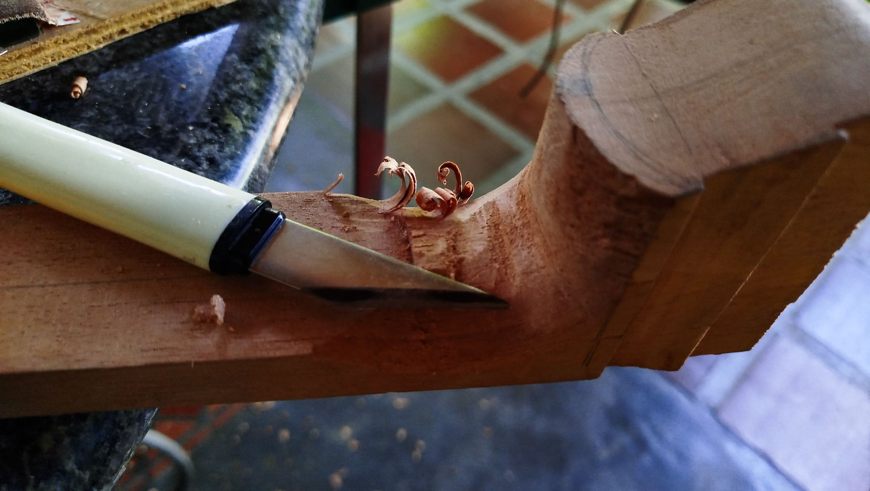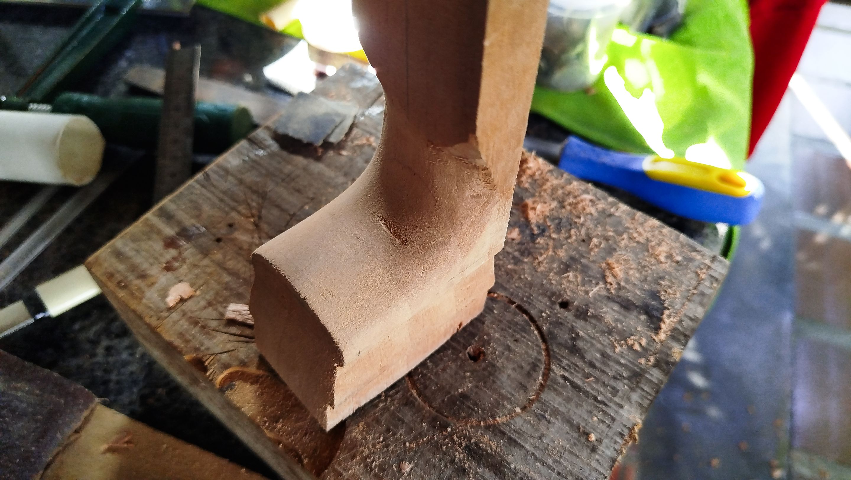 The rest of the job is using a file to create the curve that comes from the neck to the heel. And of course, the first part of the curve comes from carving by knife. The rest of the job is using sandpaper to get the whole shape to the lines. And thus we get the heel carved. Then we move to the next step!