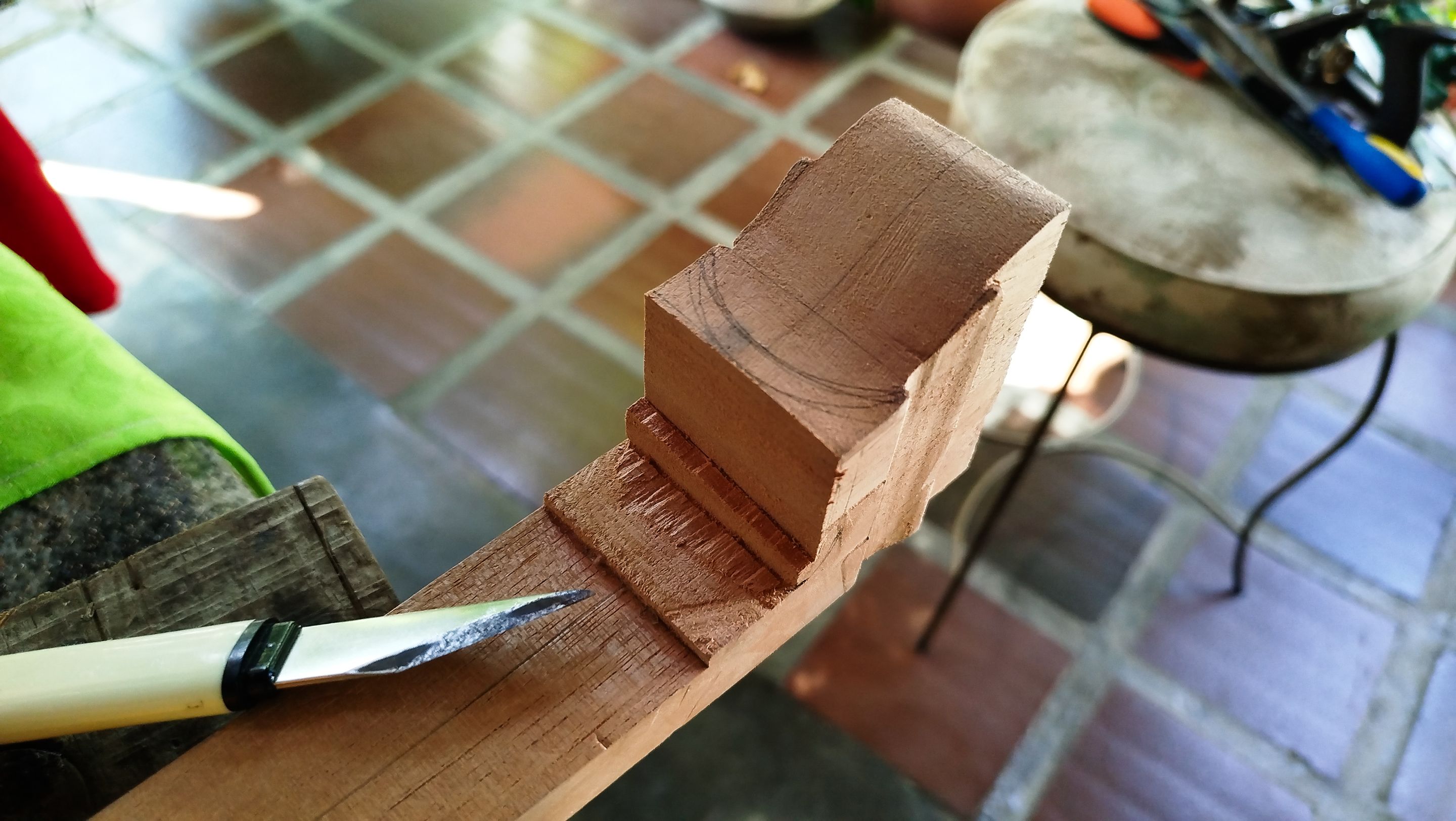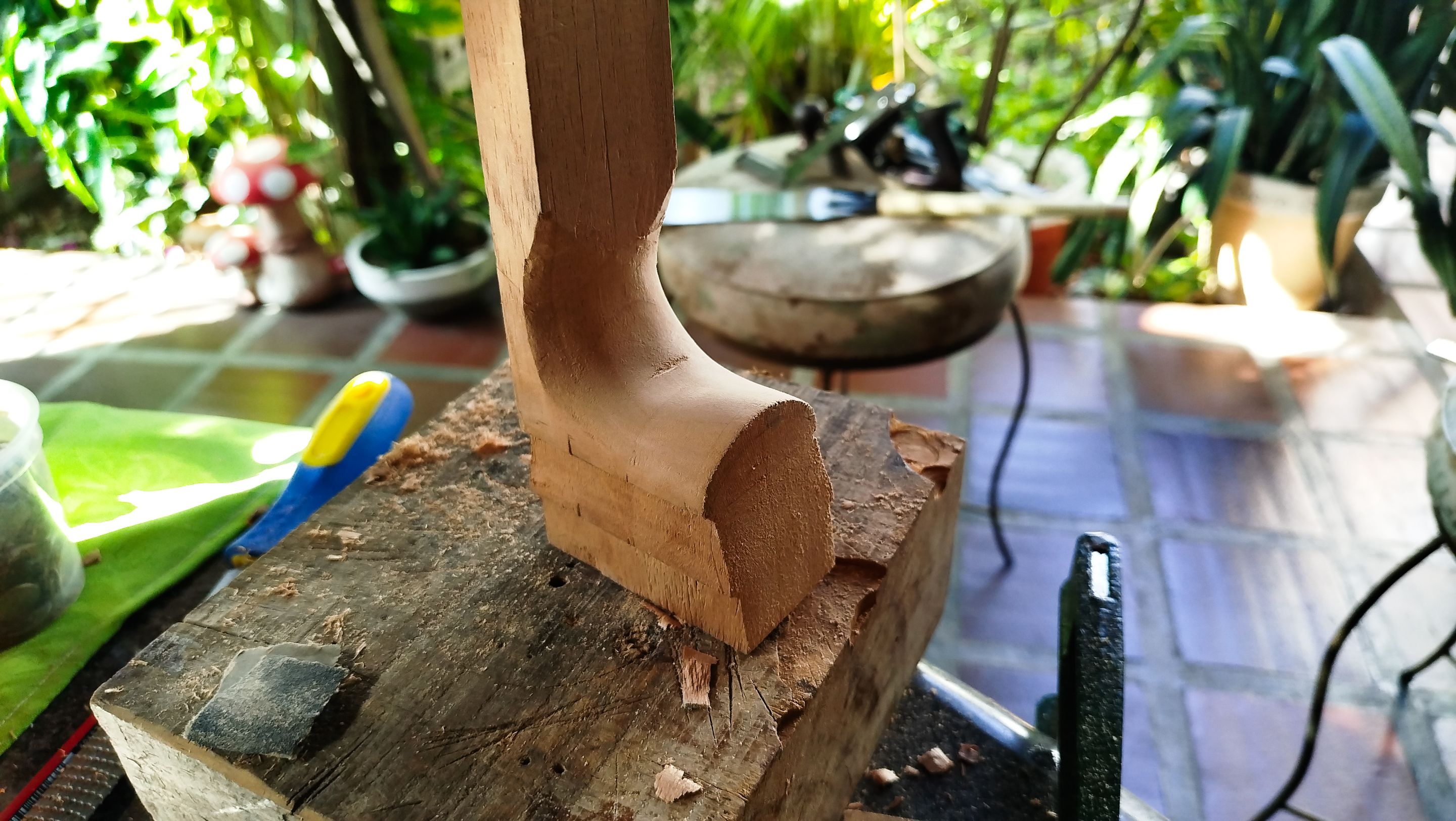 We need to follow the pattern of lines of the heel template to start carving. Since this is the first time, the photos are not abundant. We have to keep an eye on how the knife goes around the wood taking out shavings. Little by little, we remove wood until we get close enough to the lines.