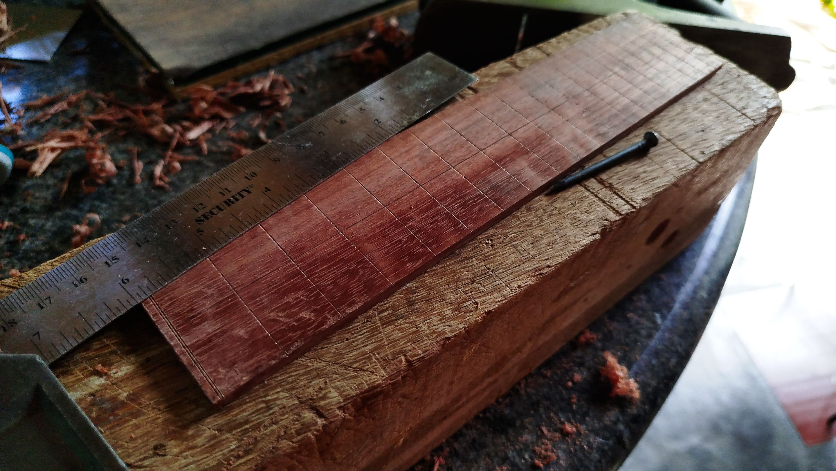 All fretboards start with blanks. This is a purpleheart blank that will be turned into a fretboard. We start by taking some measurements to have the middle section of the piece. Then we start making work on the wide faces of the blank. We need to remove all the cut and burnt marks. For this we employ both the hand plane and card scraper.