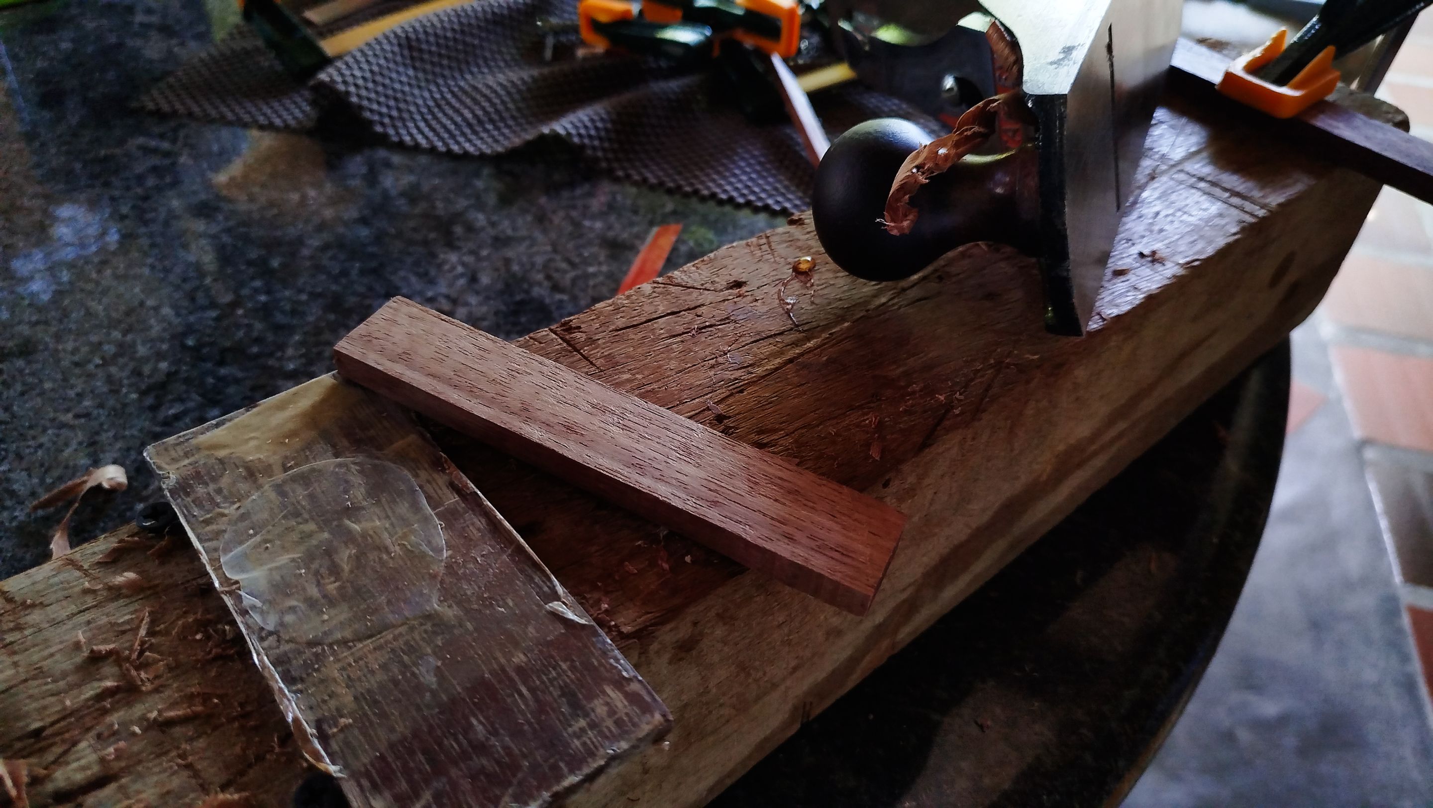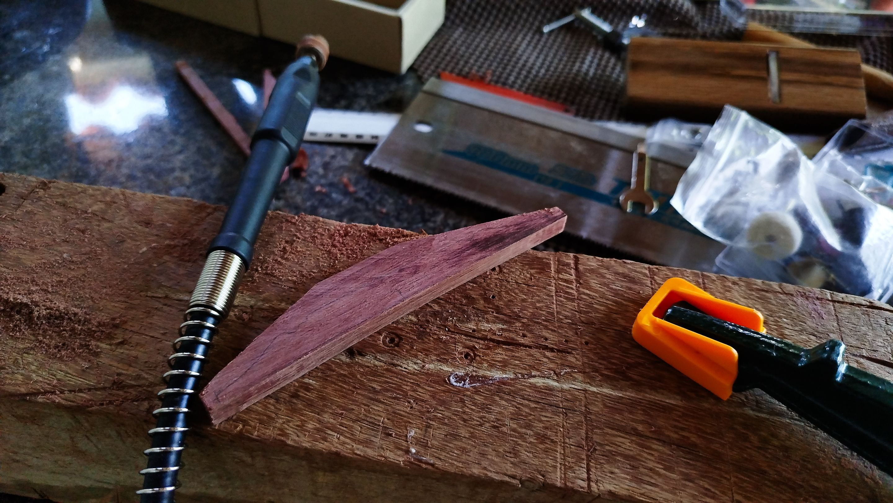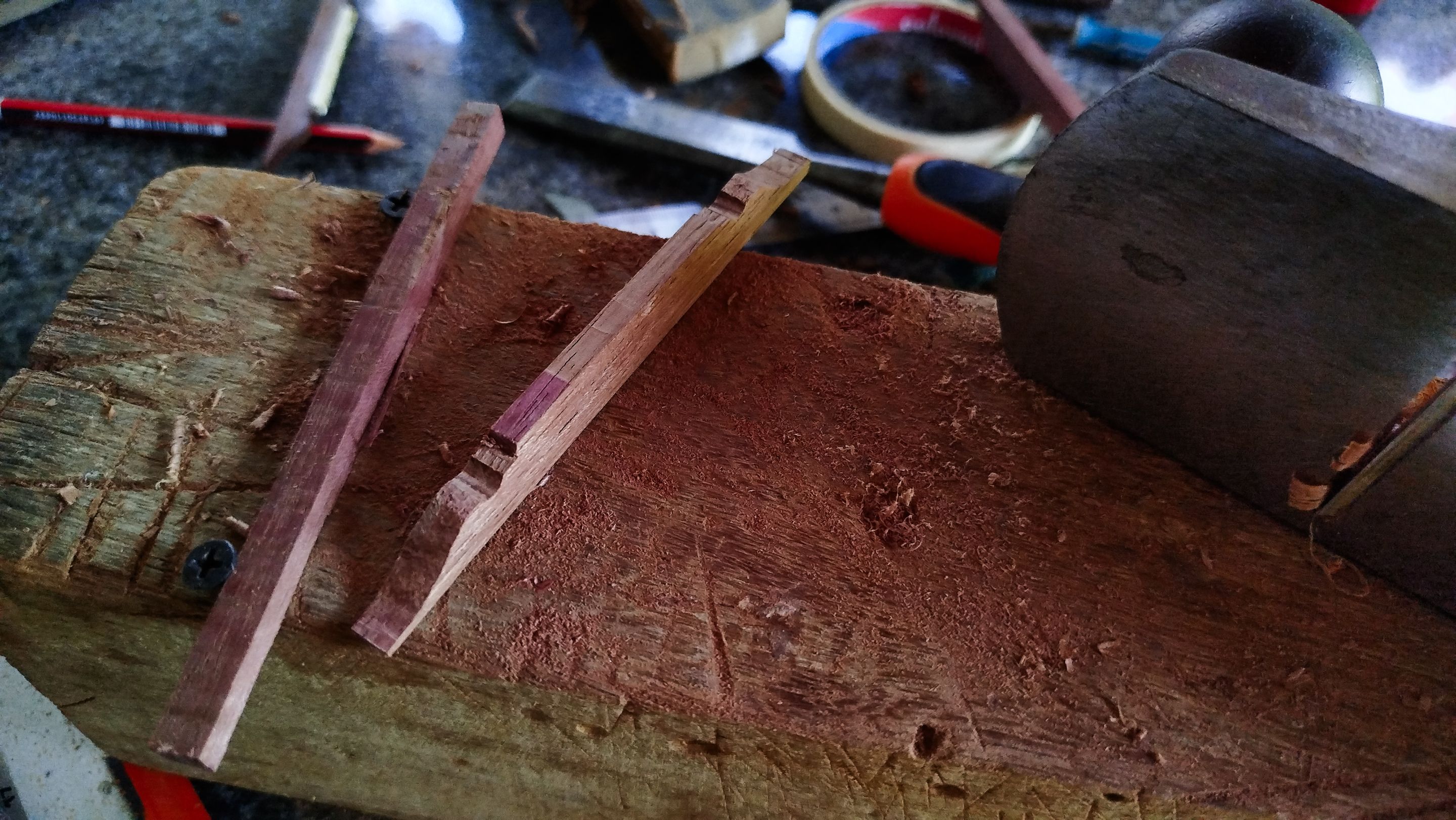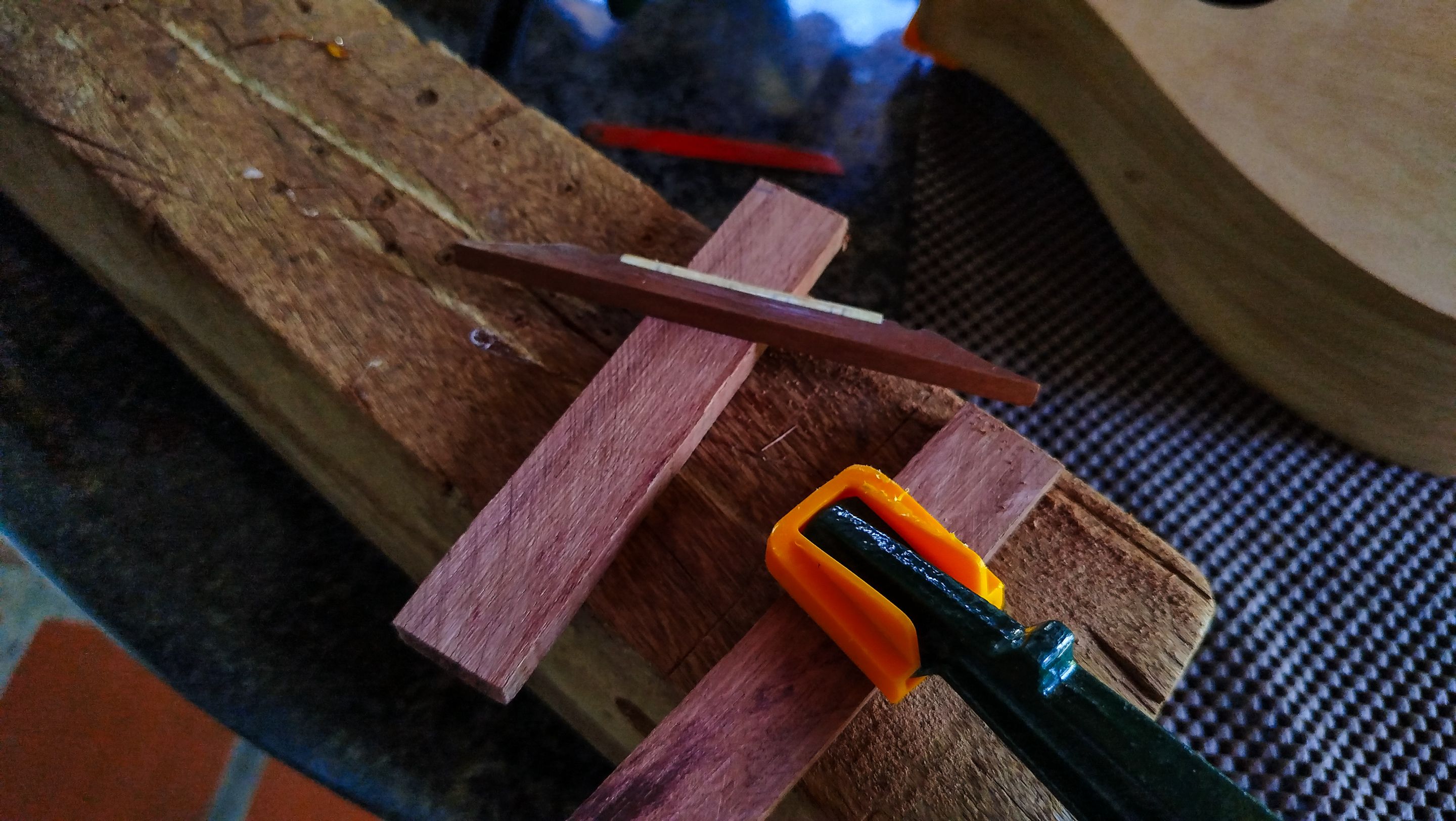 Welcome back to another entry on this mandolin build. Last time we saw this mandolin, we had finished putting the fretboard in place. And now we are continuing some work on it and also starting to carve the bridge out of a blank of purpleheart. There is still a lot of work to do.