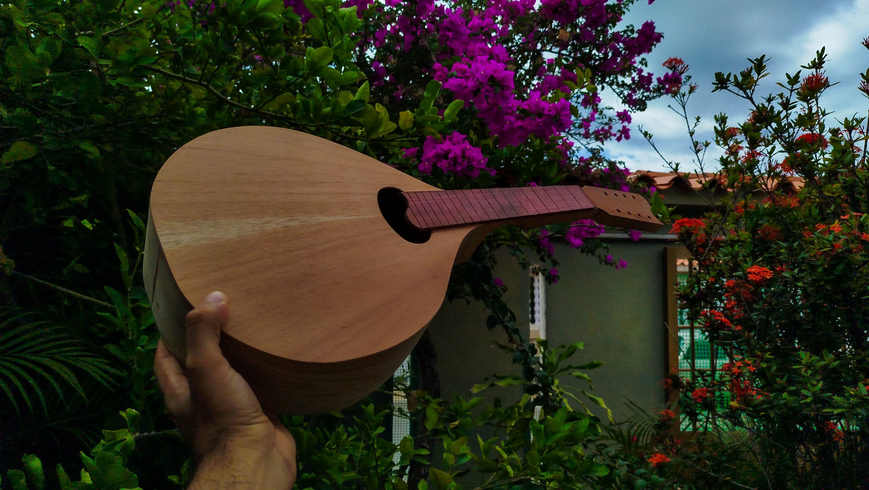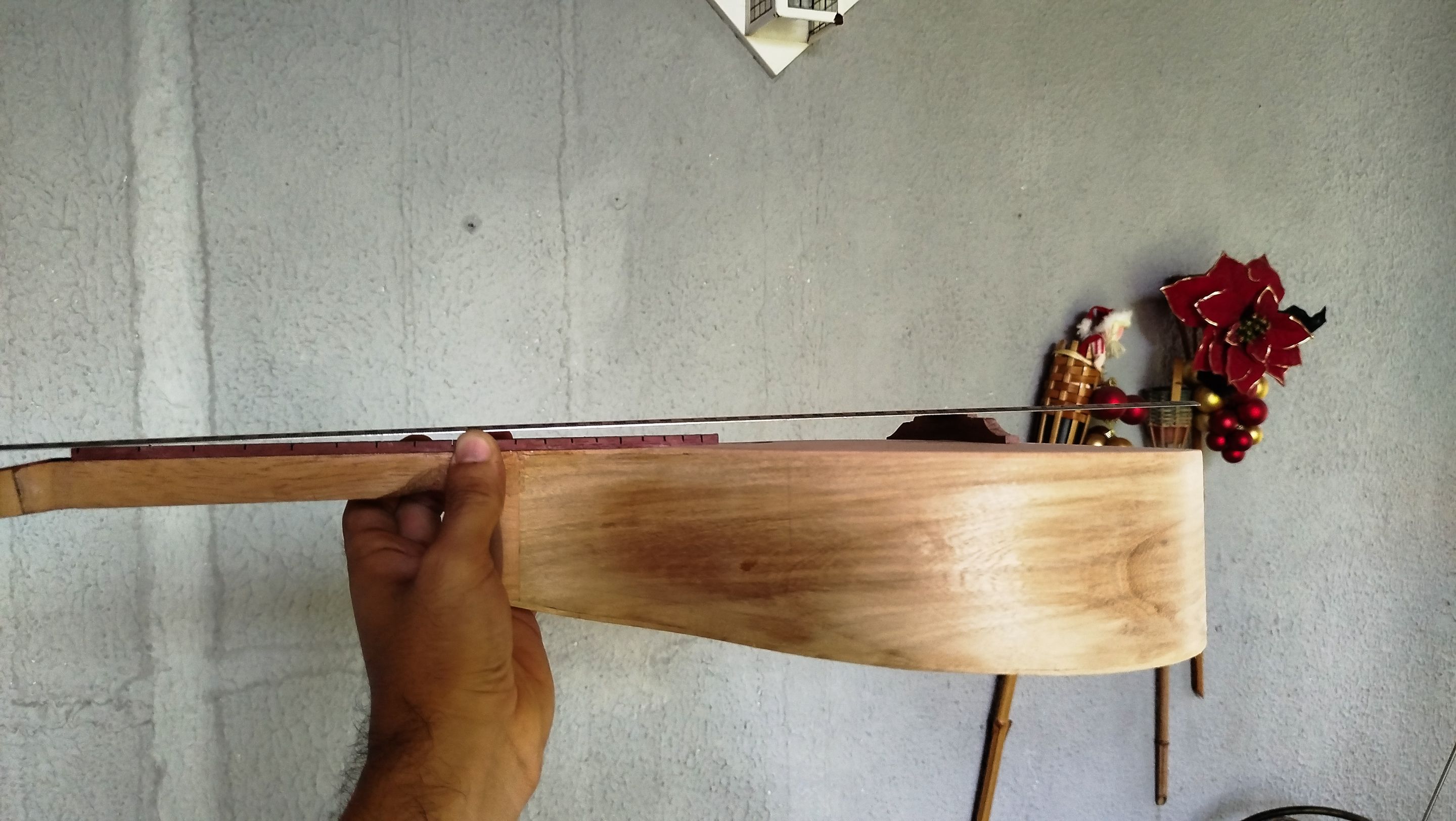 Here we are checking the looks of the instrument with the fretboard in place. The work on this piece is not over. Over this section, we are going to sand the fretboard to get it ready for the finish. This sanding also serves the process of flattening the fretboard to get it ready for the frets.