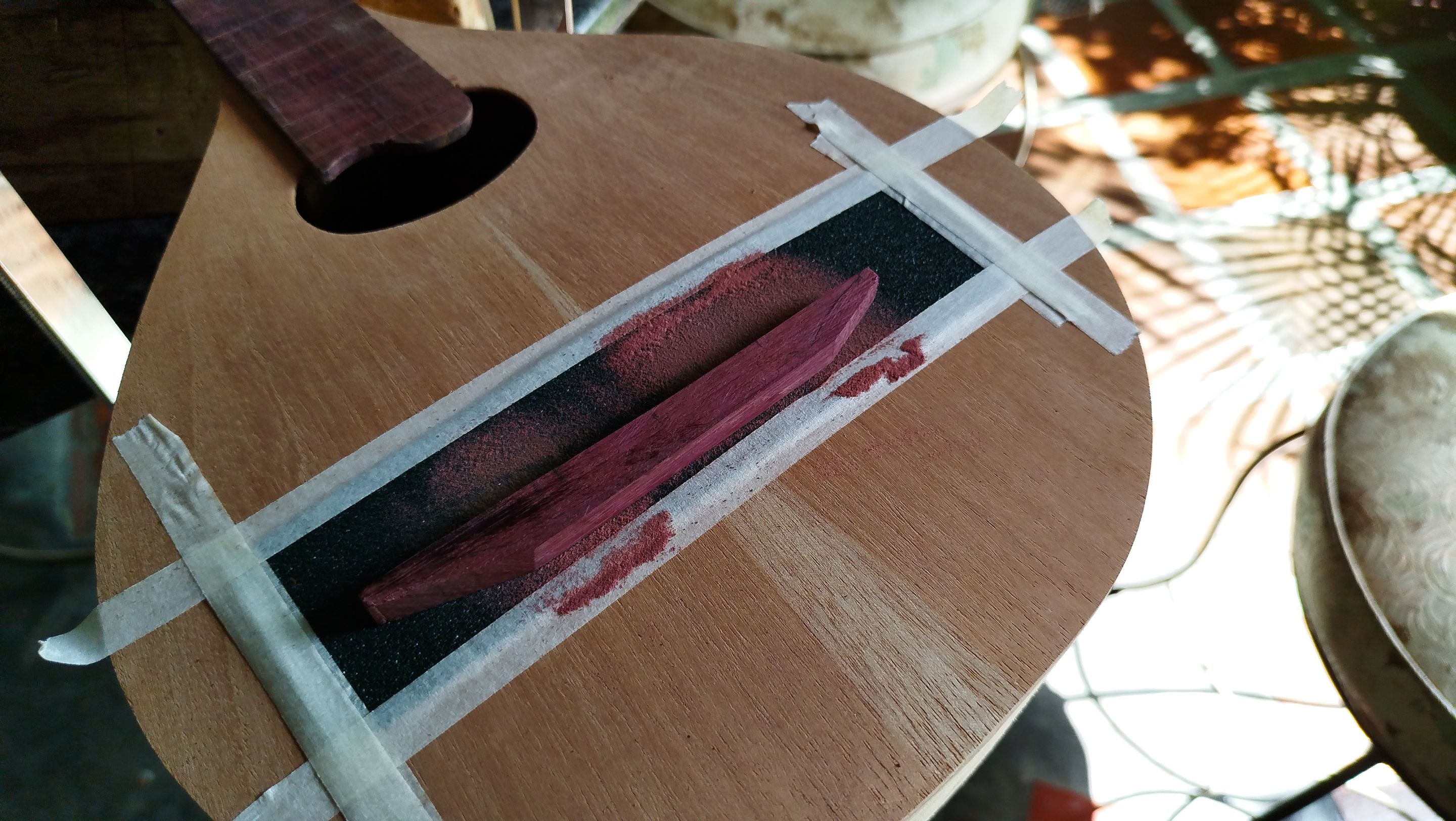 First, we take the blank and remove any marks from it using a hand plane. We are not removing a lot of material. Then we are marking the shape of the bridge on top of the blank. The next step is cutting some pieces our of it to have the rough shape. This is like a pyramid with with long base. To create the curve of the bottom part of the bridge, we use a piece of sandpaper with some masking tape on top of the sound board around the area where the bridge will rest. Remember this piece is not glued onto the instrument. The strings are the ones that hold the bridge in place.