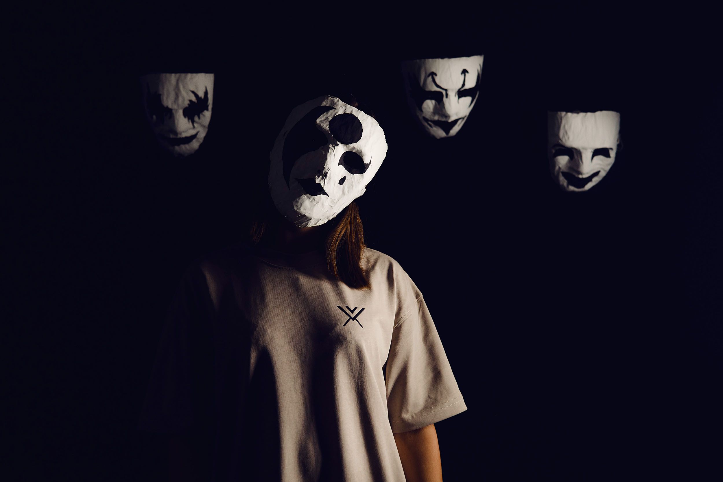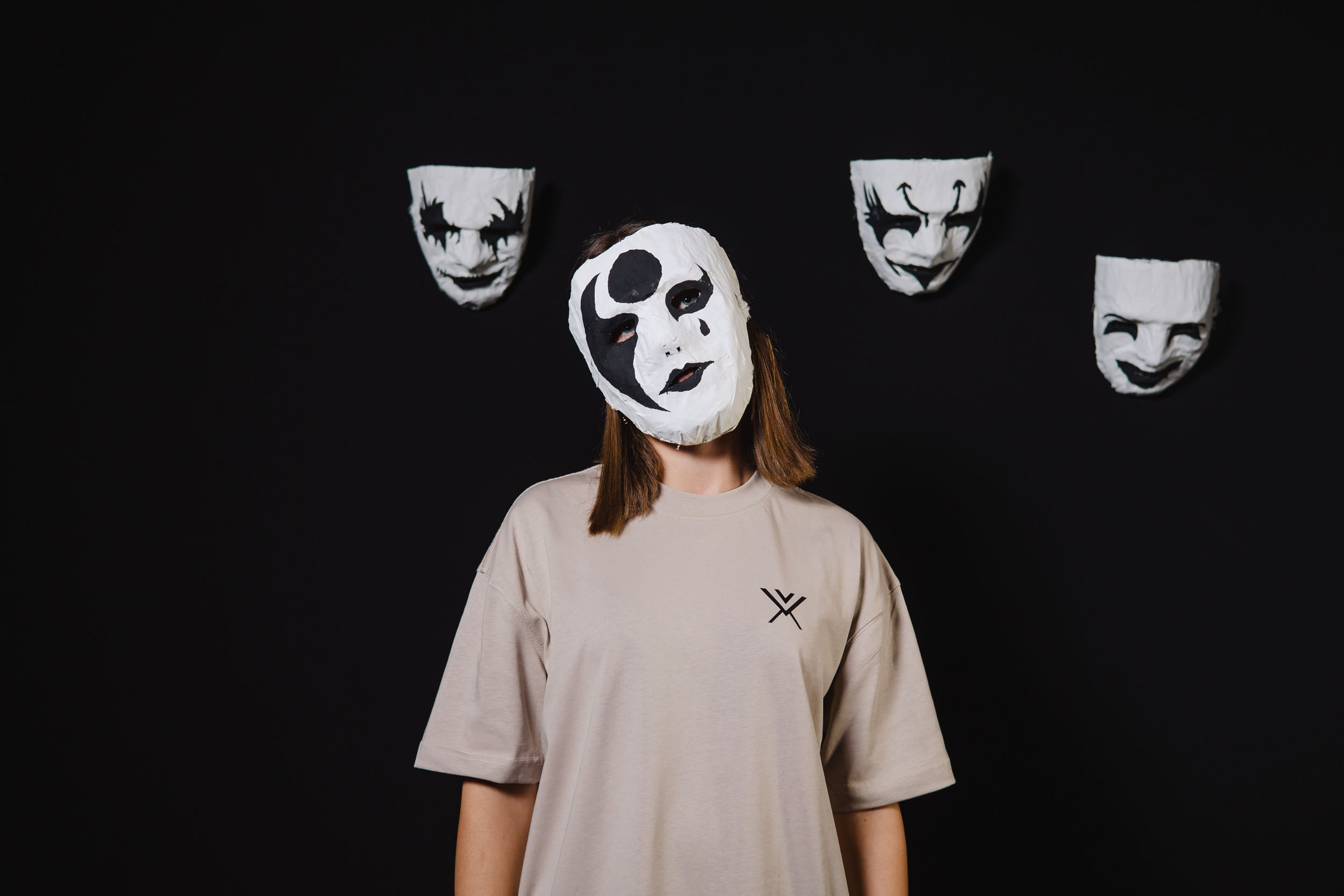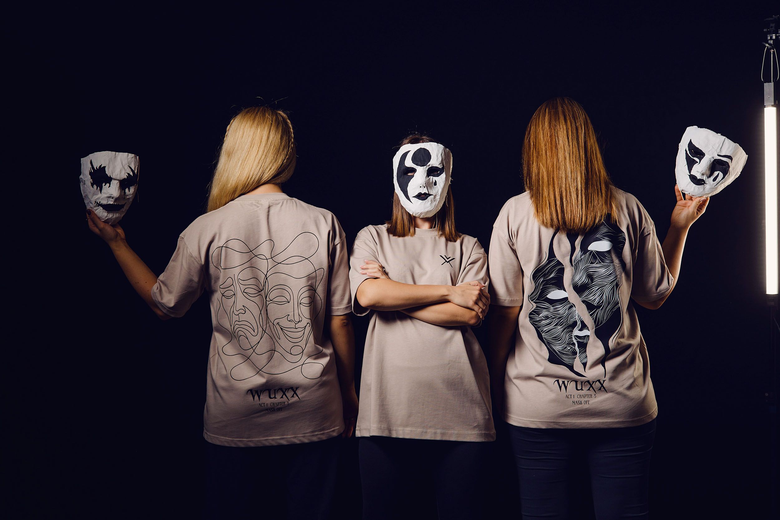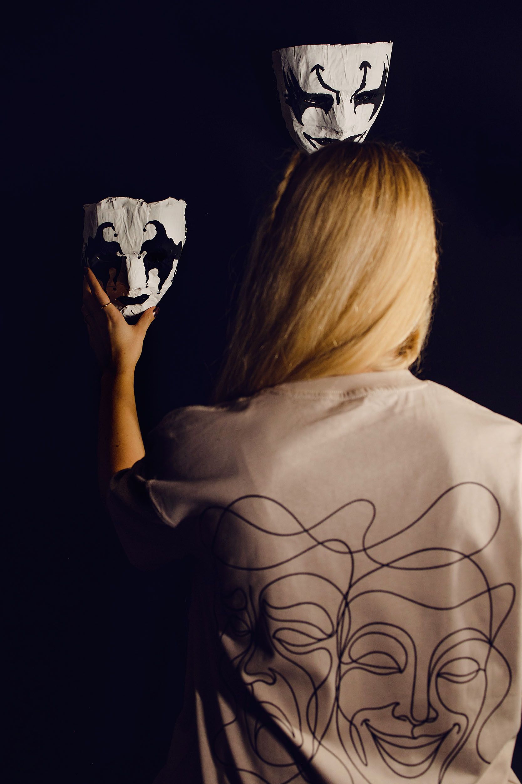 One of the ideas was to put the masks on a string, failed, managed to put them on the background. Also the softbox light was not working anymore, it was too flat. So i ended up using the tube lights.