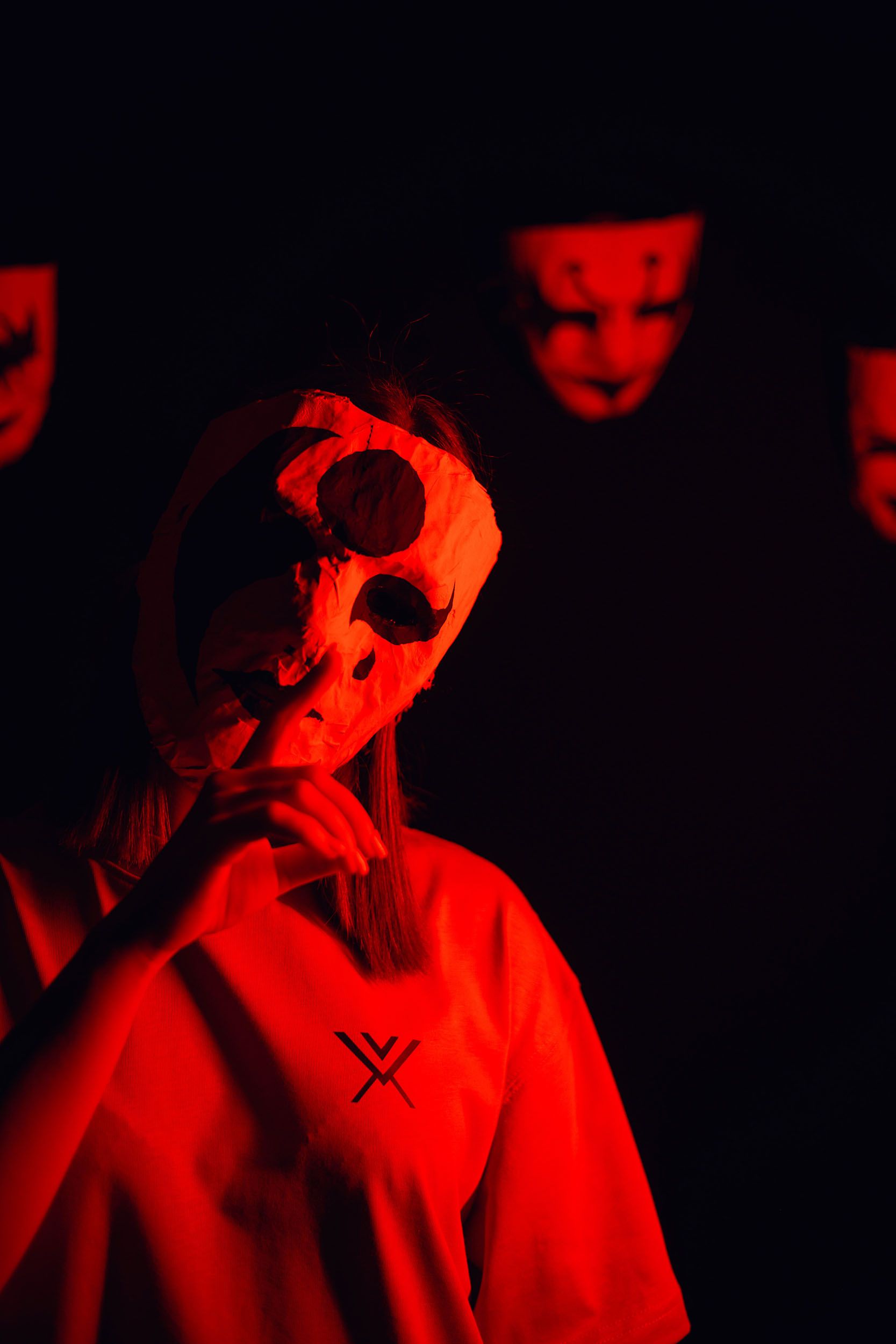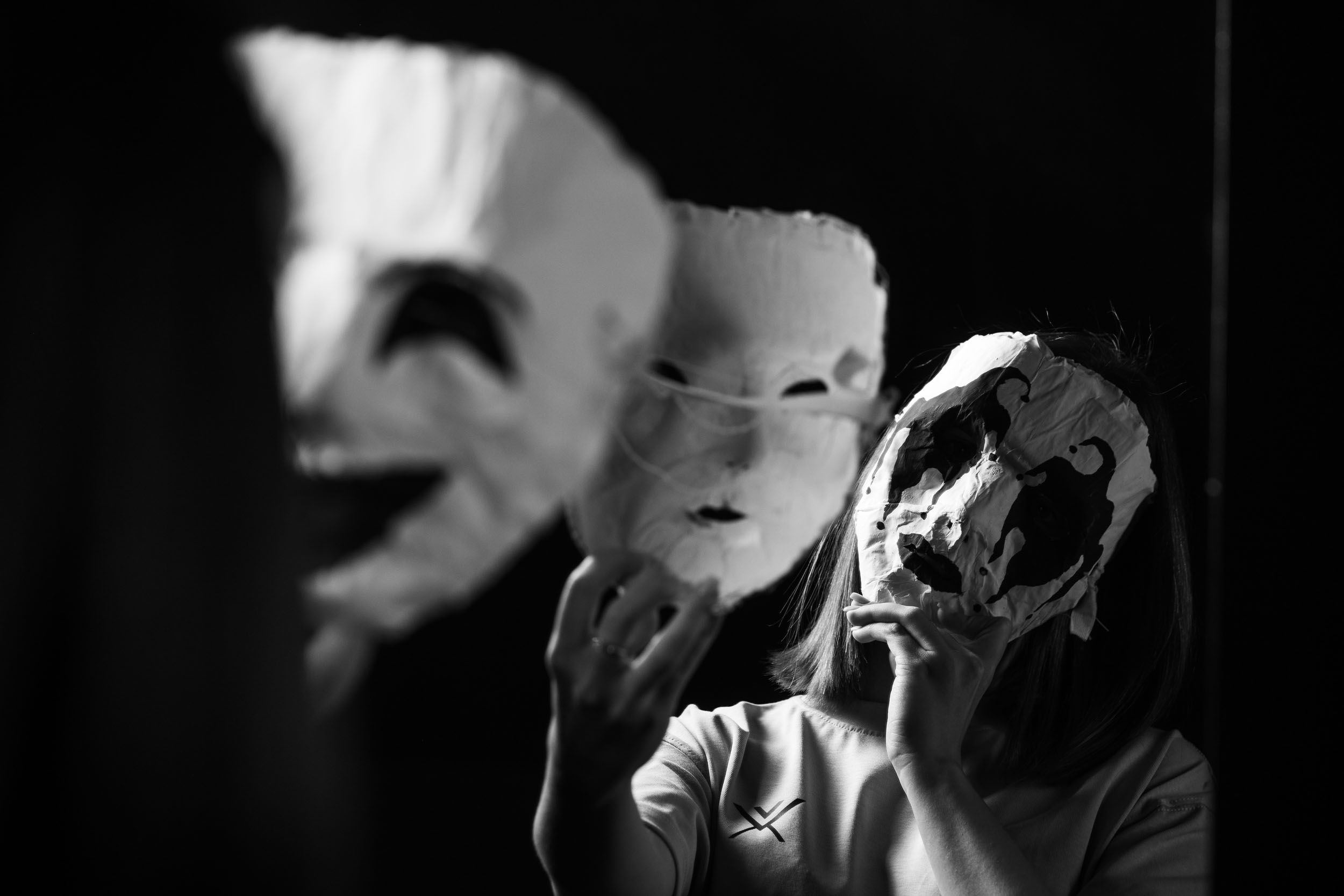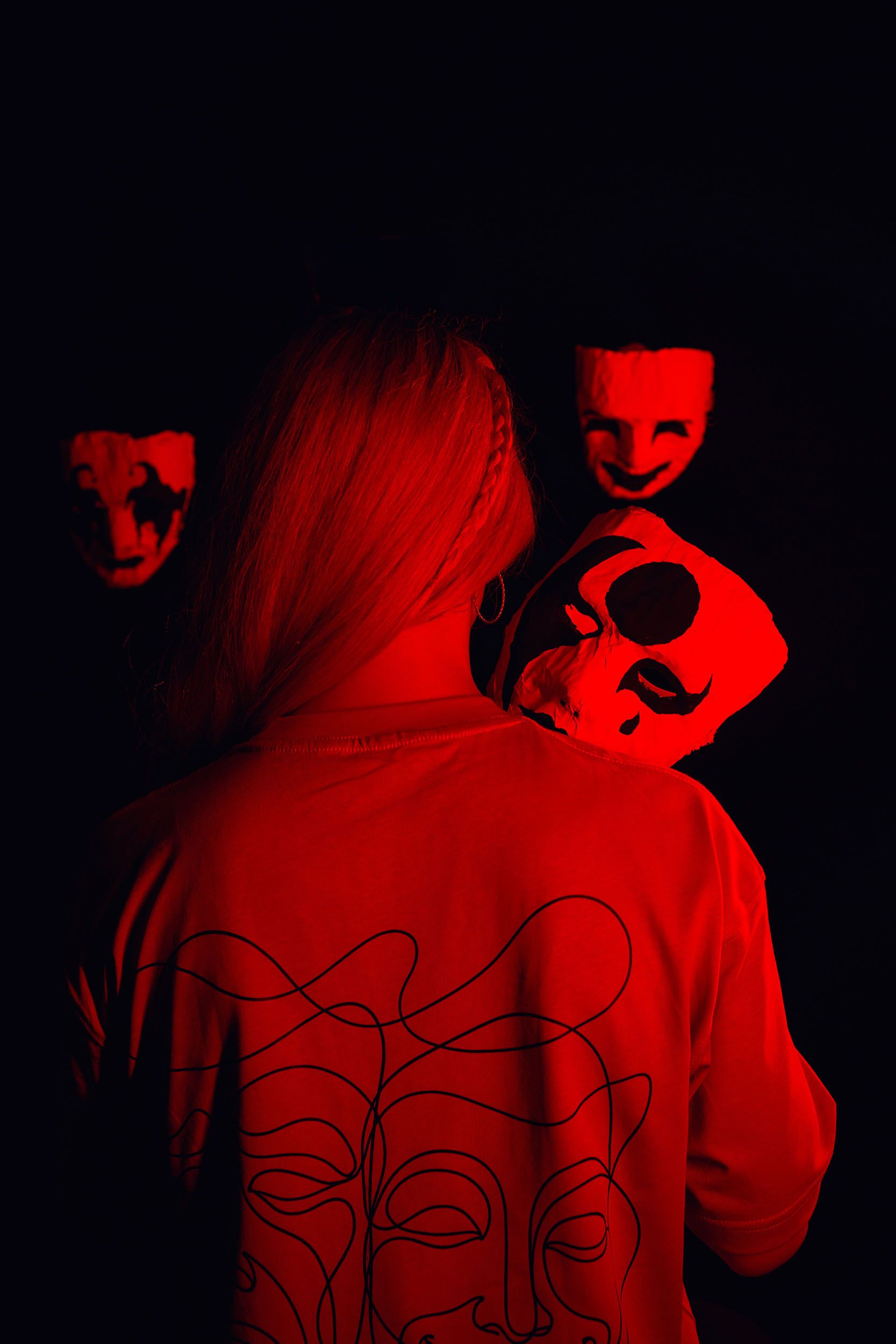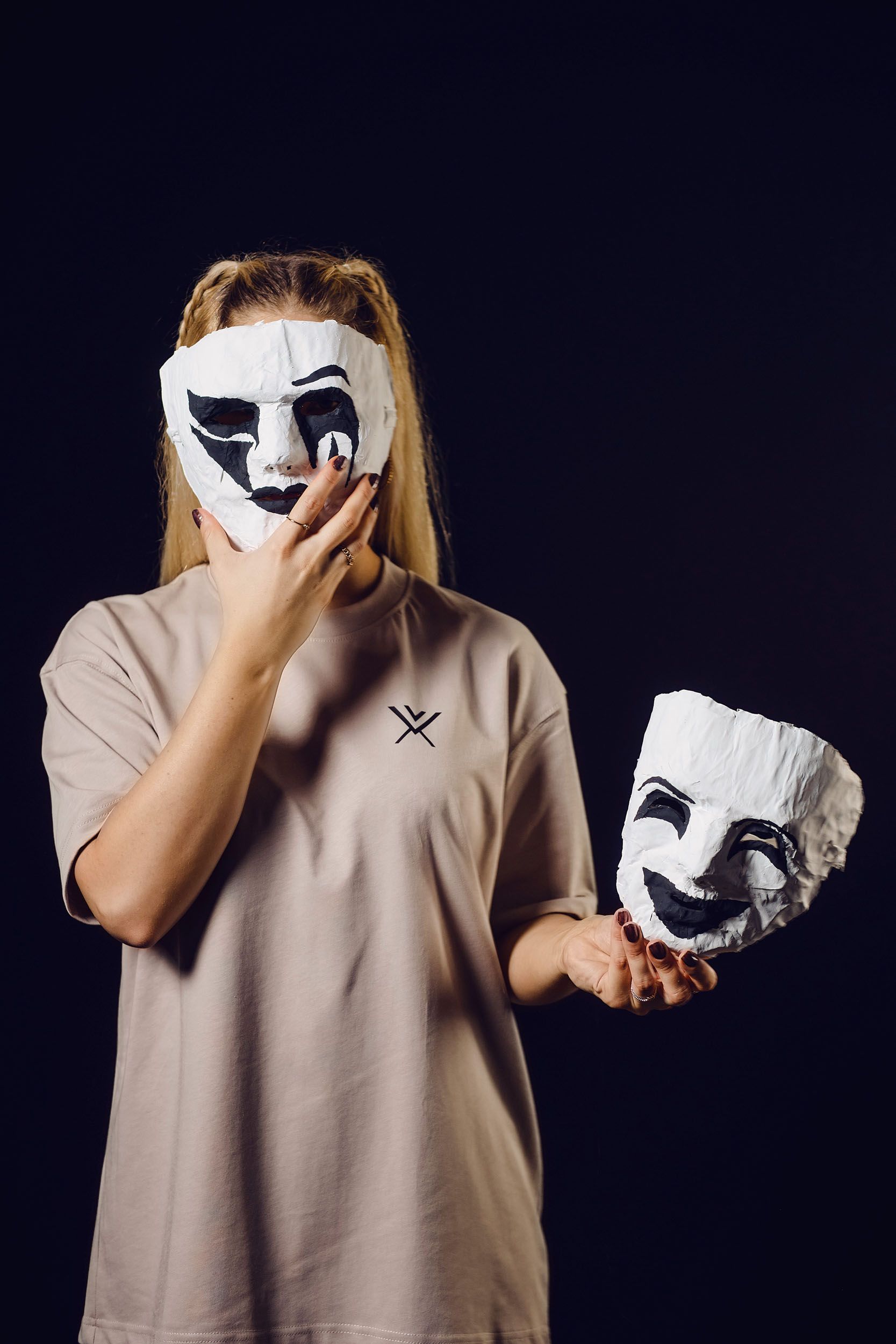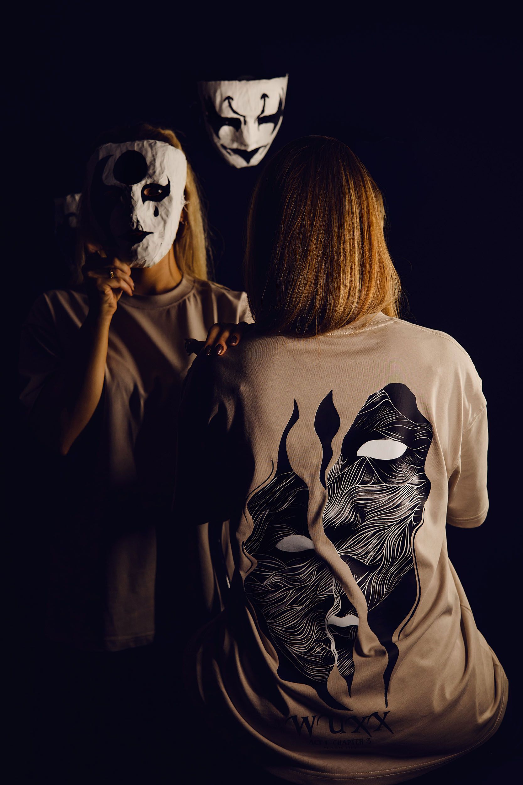 One of the ideas was to put the masks on a string, failed, managed to put them on the background. Also the softbox light was not working anymore, it was too flat. So i ended up using the tube lights.
