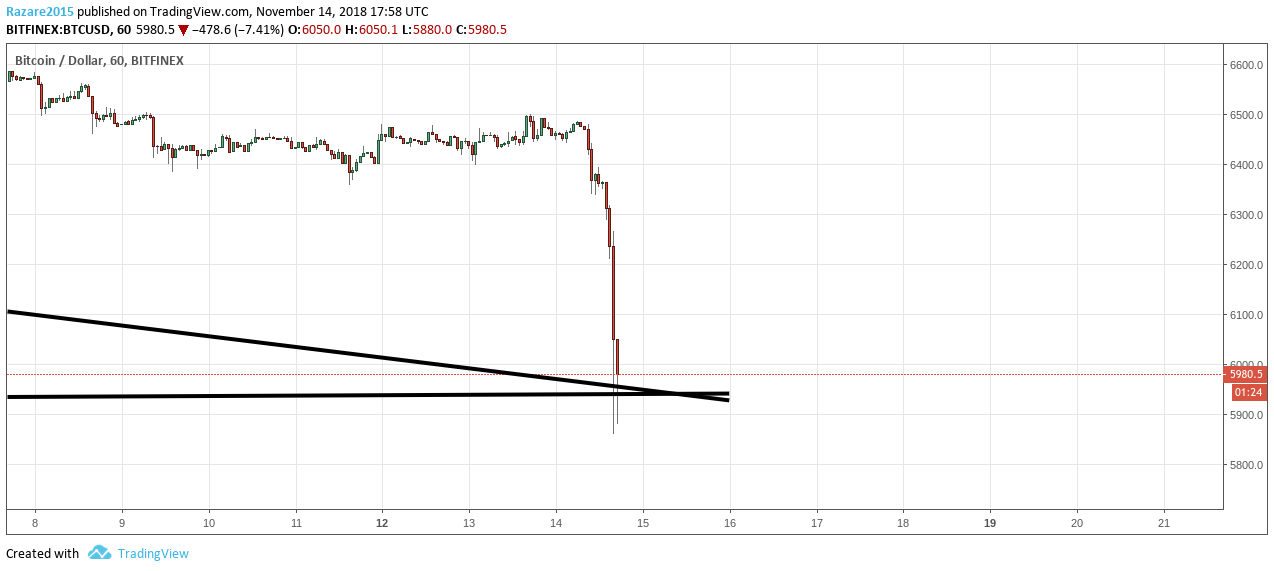 2018-11-14 18:19Intraday nosedive, BTC goes down to 5,700 and bounces back up to 6k on some exchanges. …