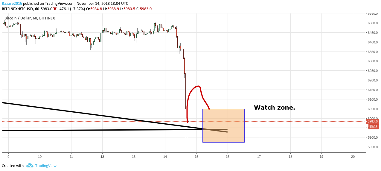 In my prior couple of posts, my viewpoint has been proven wrong today as BTC retests 5,800. My viewpoint given this is that I am becoming more skeptical 5,800 ultimately holds. Whether it holds, is not really a factor of market sentiment, or technical analysis. 5,800 holds only if there are buyers willing to draw that line in the chart, to hold it for the amount of selling pressure this support level faces.