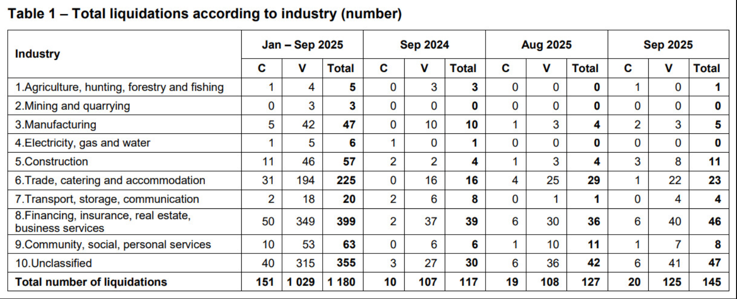 The month of September showed another 145 businesses closed their doors bringing the total shutdowns for the first 9 months of 2025 to 1180. This is a 23.95% increase versus 2024 which is a worrying sign that is reflecting the SA economy.