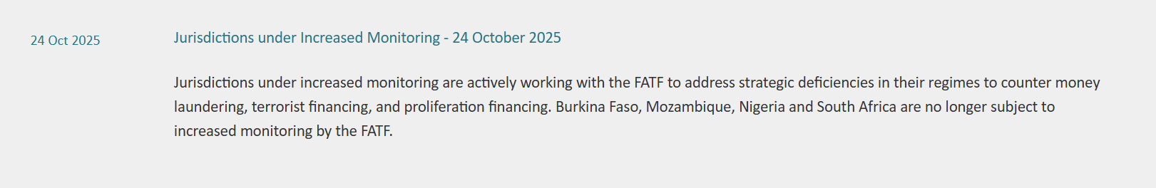 On Friday the Financial Action Task Force concluded their latest meeting and the good news from my side is South Africa is no longer on the naughty boy Grey List. I had not paid much attention to this in the past as this never directly impacted myself until last month.