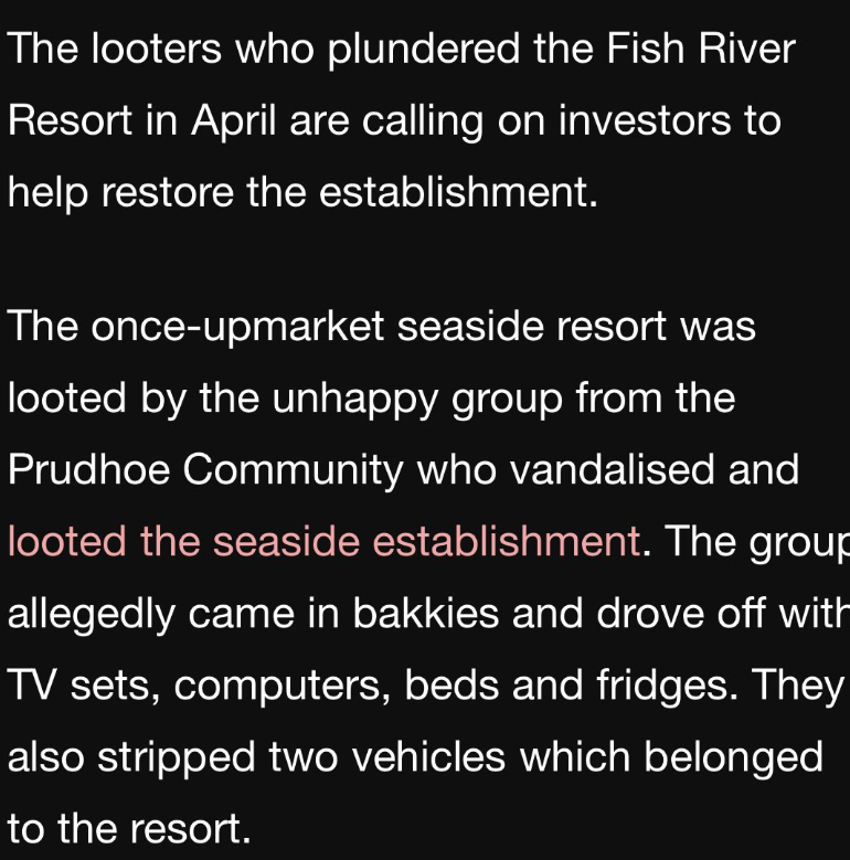 There have been rumors over the years that the Fish River Resort will be developed back to it's former glory but each time deals are ready to be brokered in hose fighting breaks out. The latest was Lux Hotels from Dubai who were ready to invest R600 million earlier this year only to be thwarted at the last minute when negotiations failed. The problem is the community is fighting over control because they do believe this has value and is worthless if they do not agree. They have gutted and ruined a successful business and now will earn less with investors making the bulk of the profits.